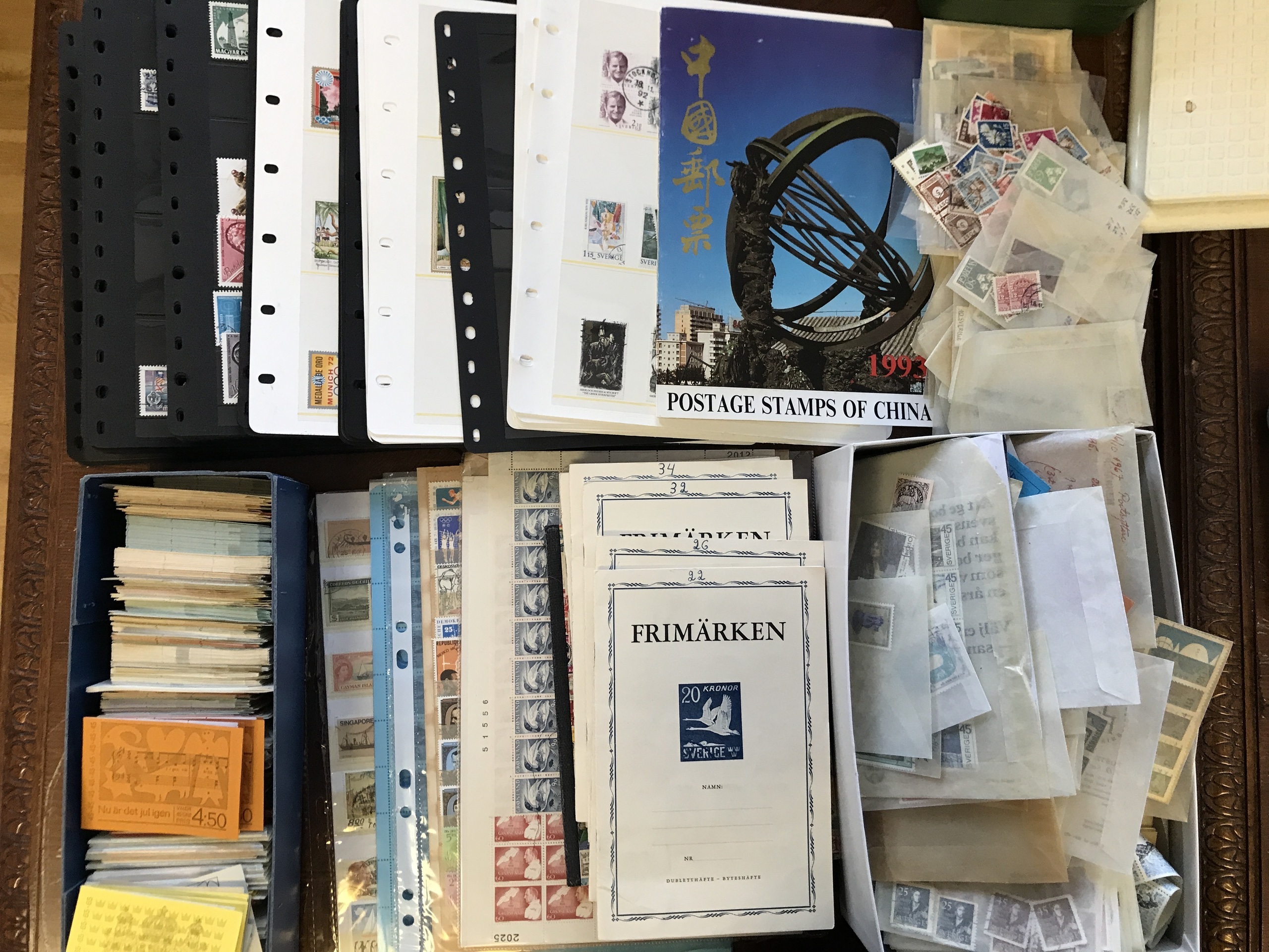 ALL WORLD. ★★/★/⊙. Box with e.g. 100s of booklets Sweden, various thematic selections, 1000s of stamps in envelopes and old approval booklets, etc. Approx. 7 kg.