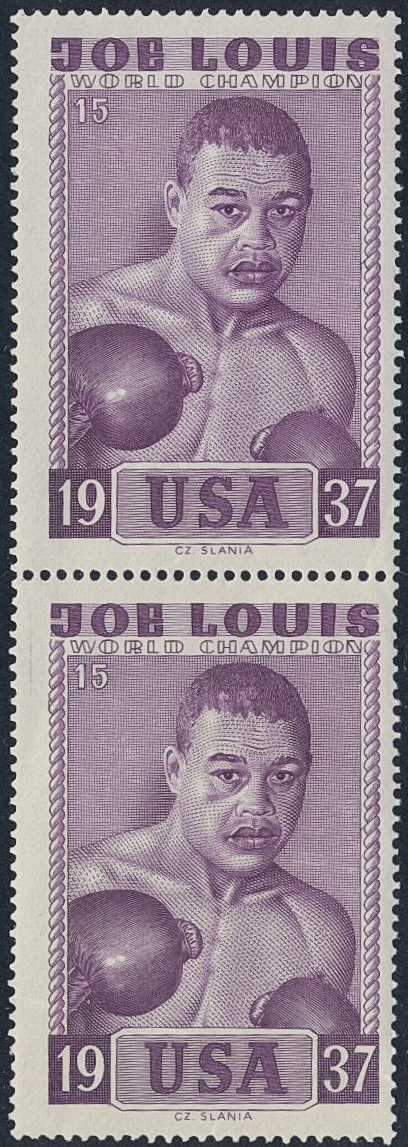 Thematics, Slania, USA. ★★. JOE LOUIS World Champion 1937. Vertical PAIR (lower label folded).