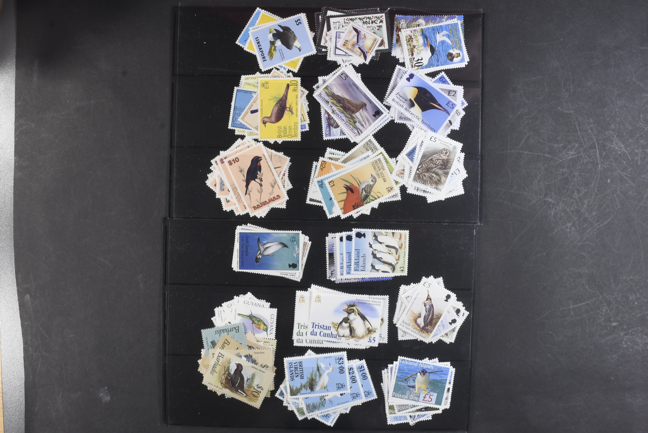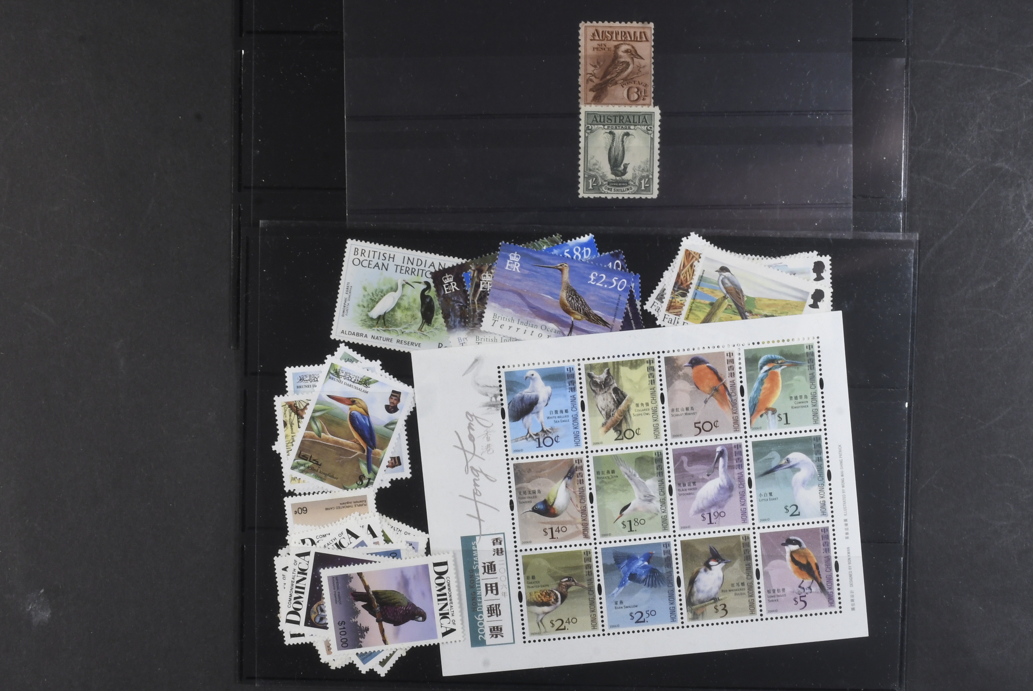 Thematics, Birds. ★★. (Strong in Falklands), virtually all high values definitive sets, all never hinged + Kookaburra & Lyre Bird LH.