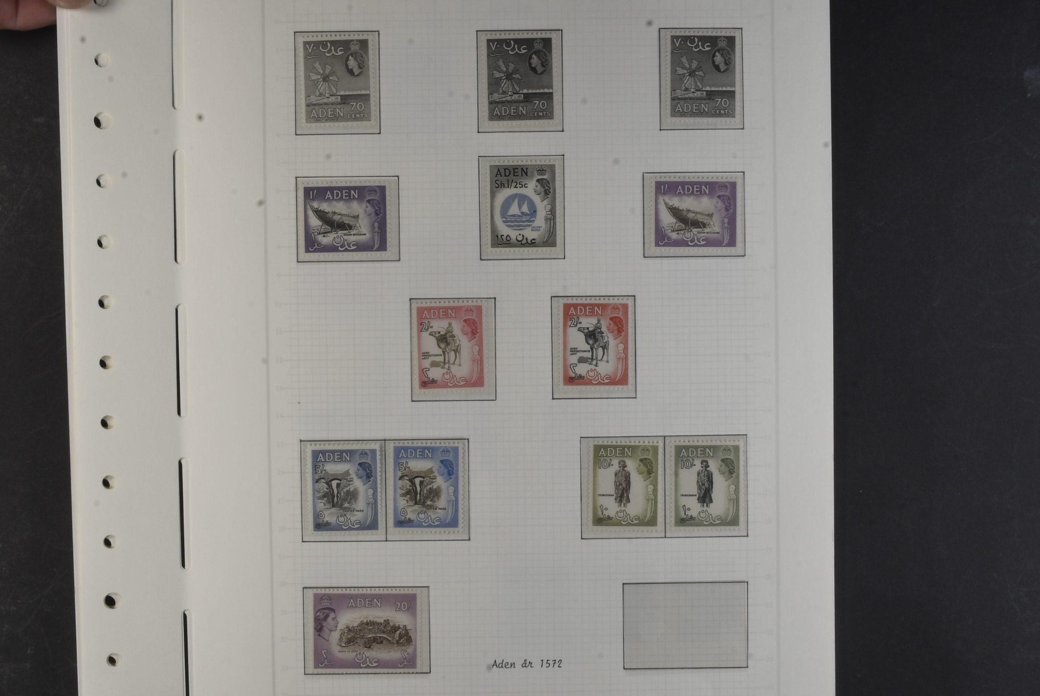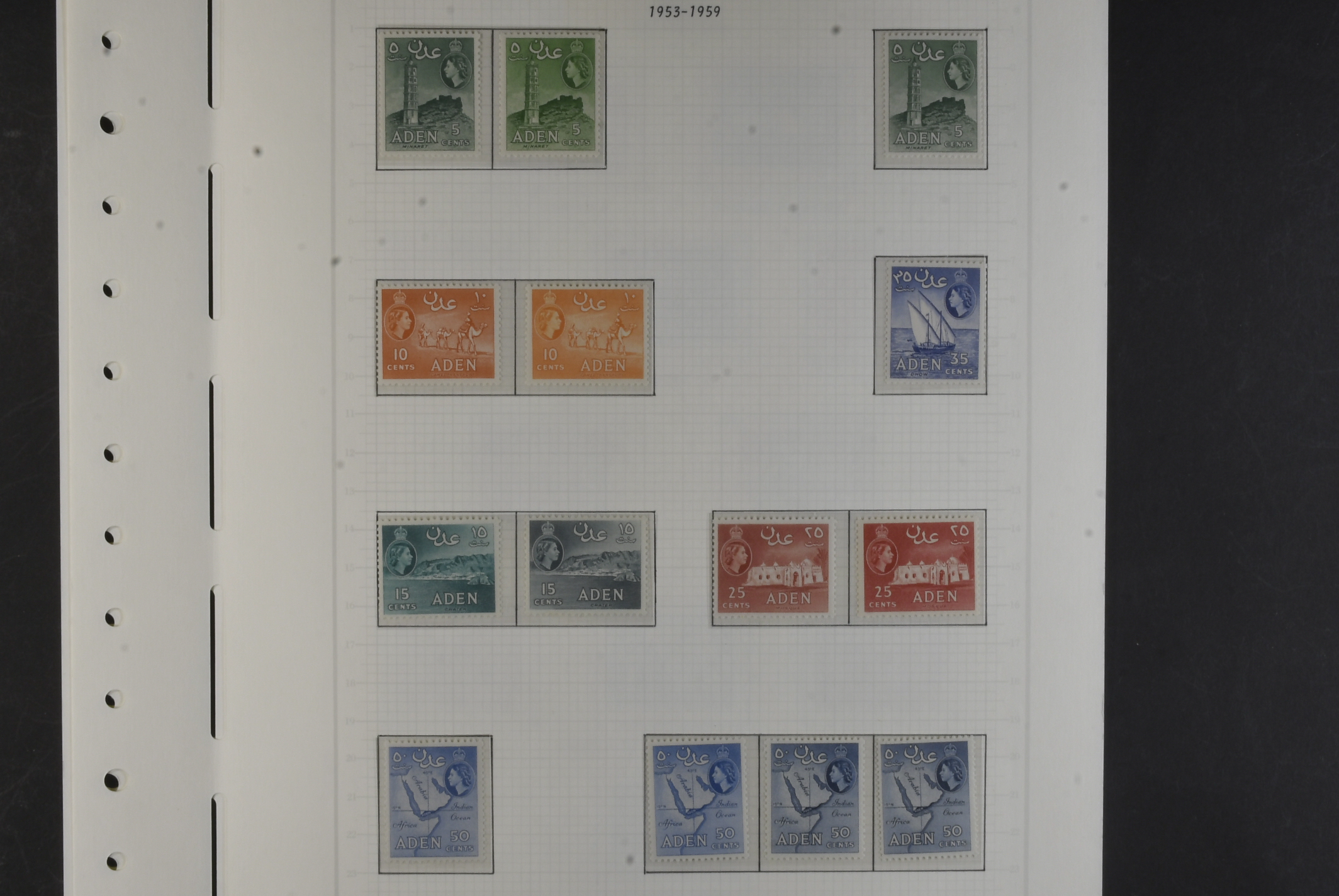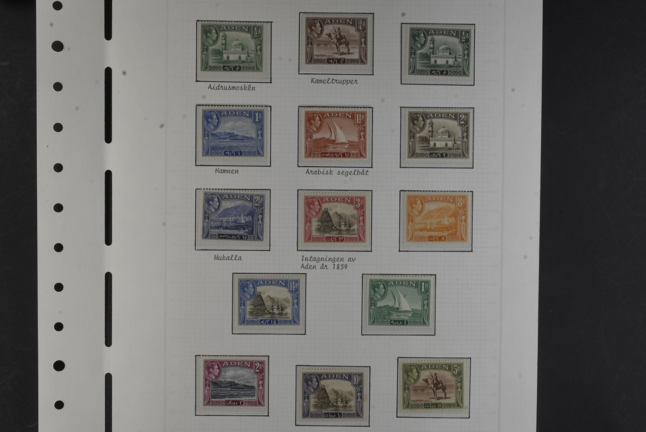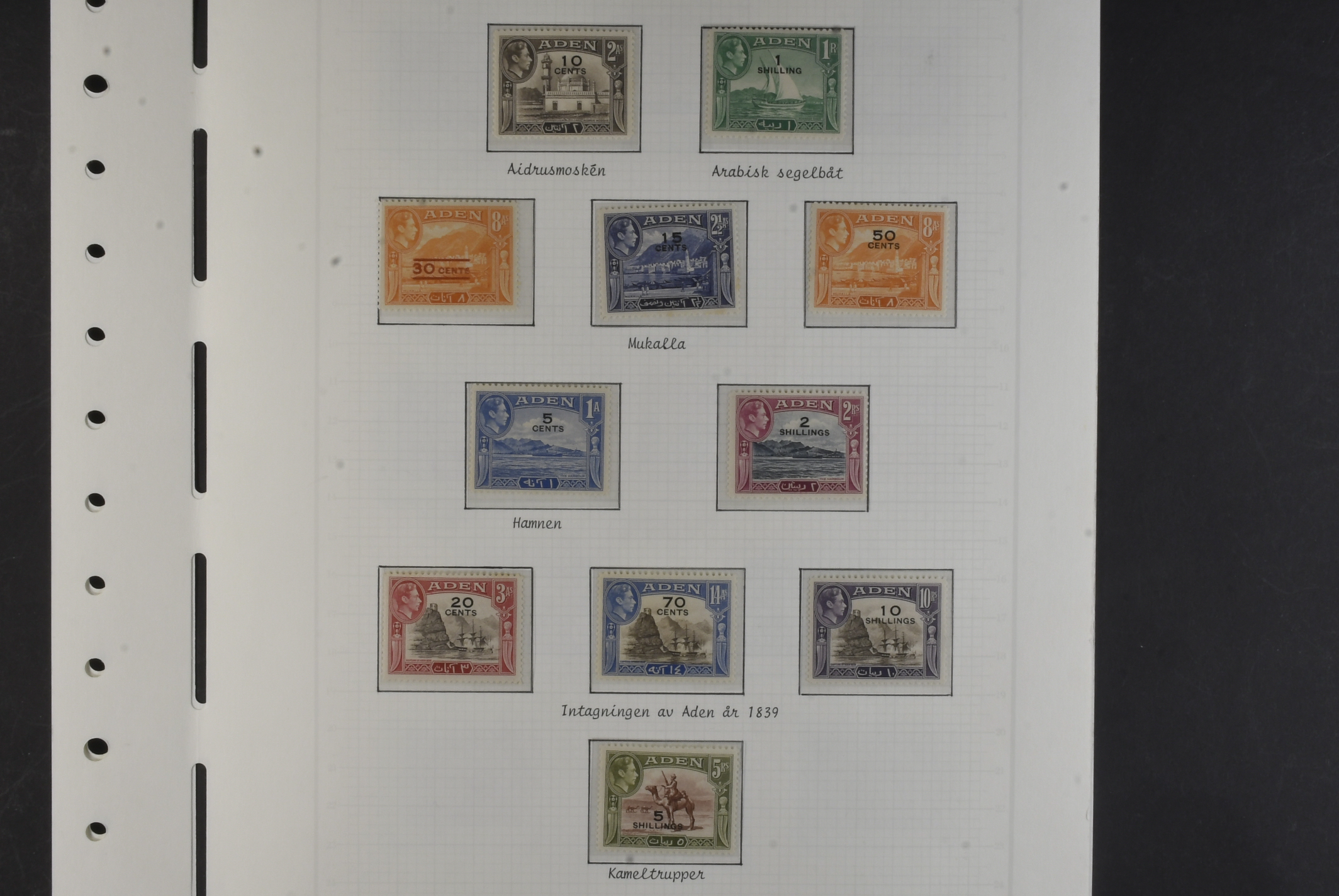 Aden. Lot ★★/★ 1939–1963 on leaves. GVI 1939 set lh, 1951 Overprint set UMM and QE 1953 set with one 20s vlh. The entire lot is presented at www.philea.se. Fine quality. (51)