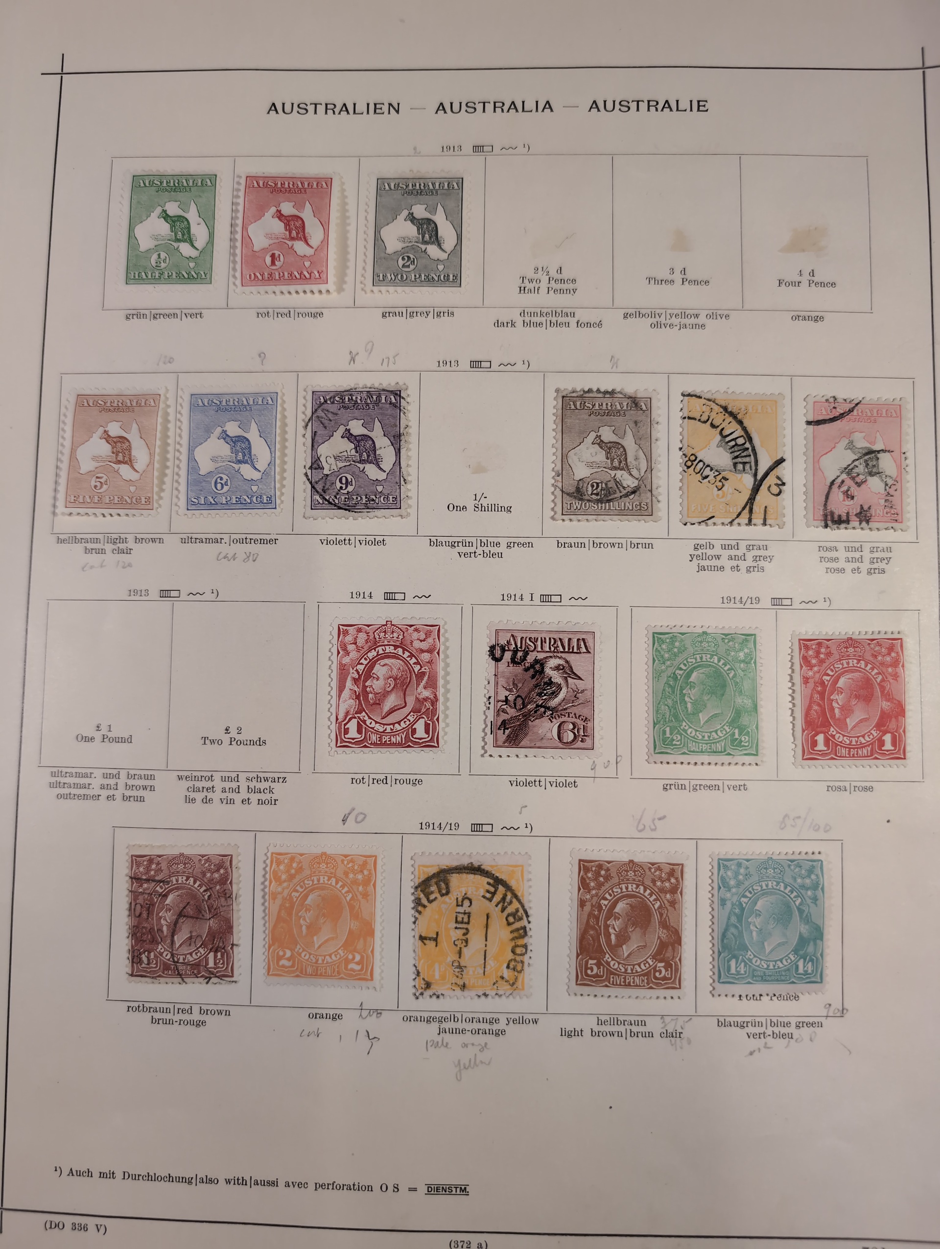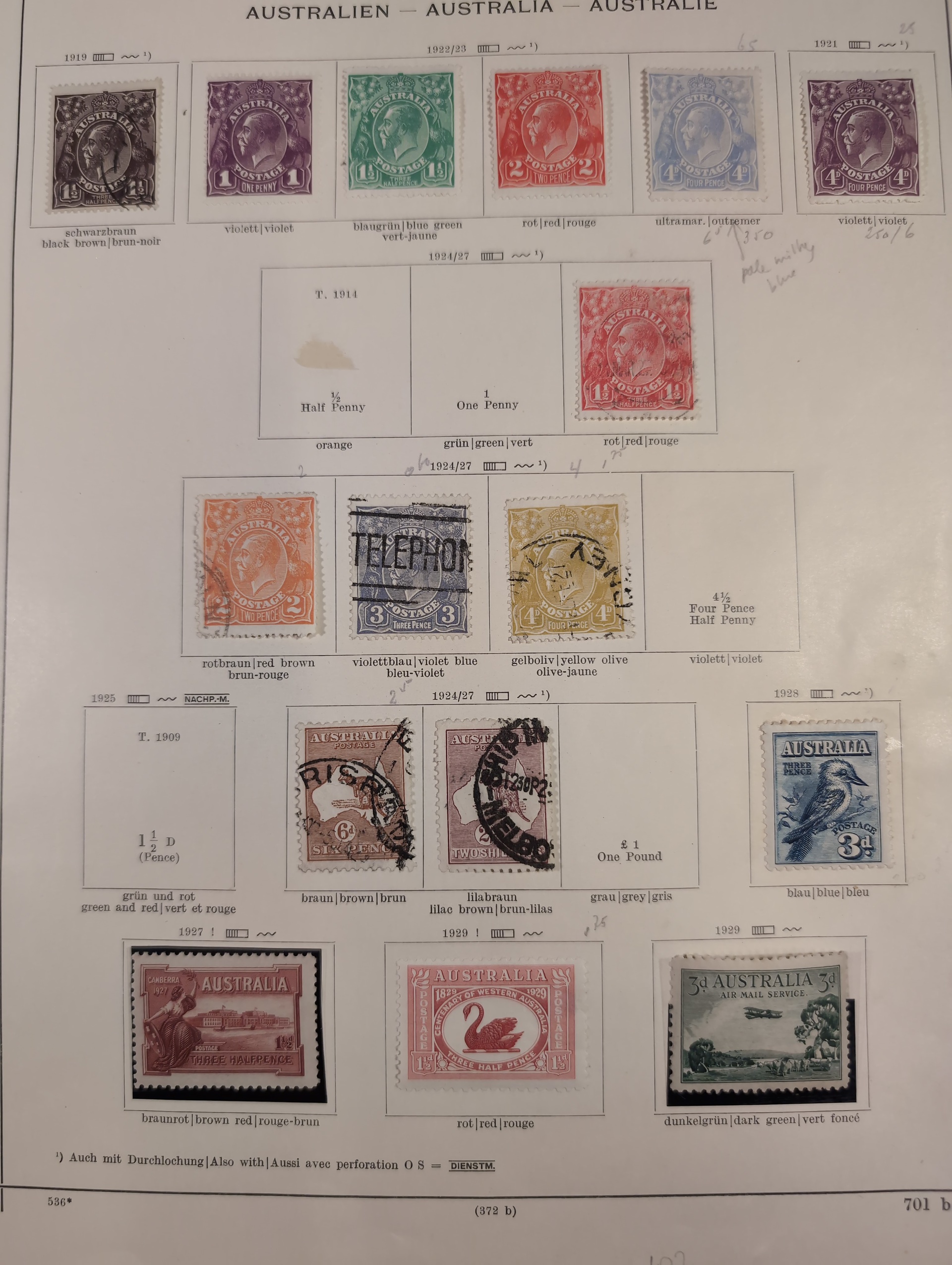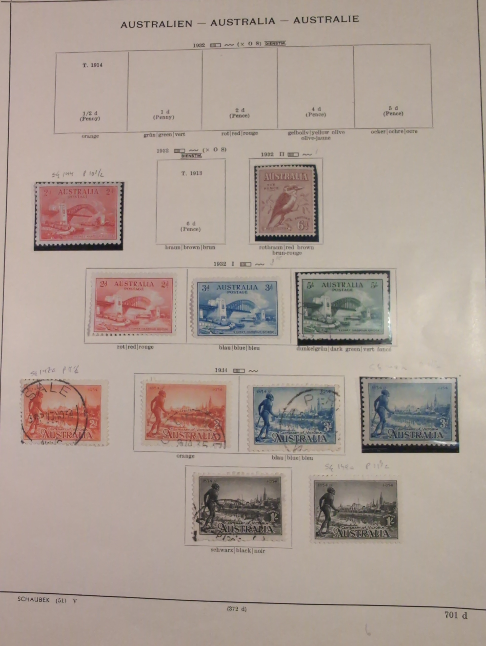 Australia. Collection ★/⊙ 1913–1971 on leaves. Roos to 10s used and 6d mint, KGV heads to 1s4s mint. Nice 1930s incl. Sidney Harbour bridge 5s CTO and robes to #1 used, no stamps 1940–1964. Mint 1965–1971 apparantly almost complete. Mostly good quality.