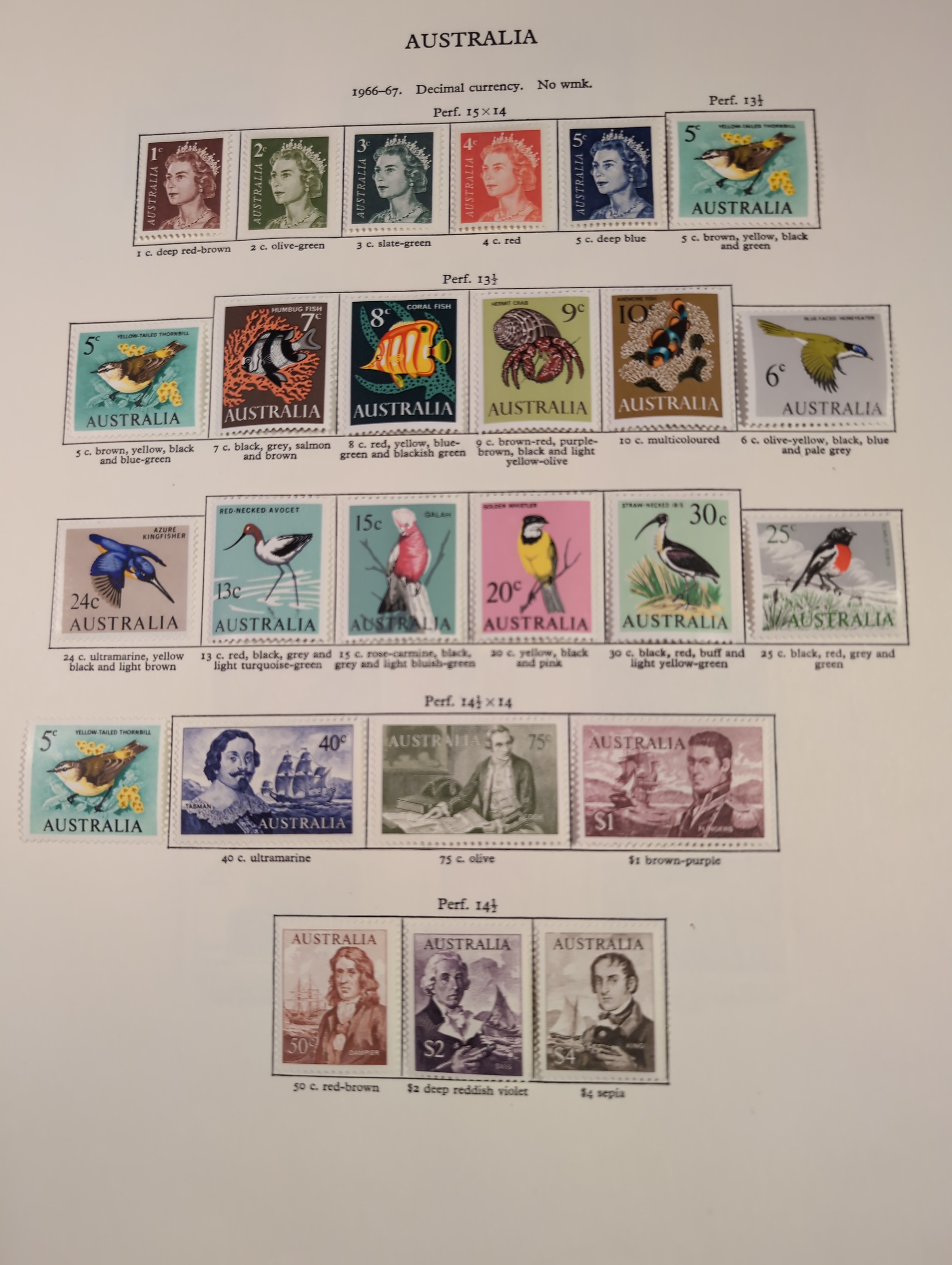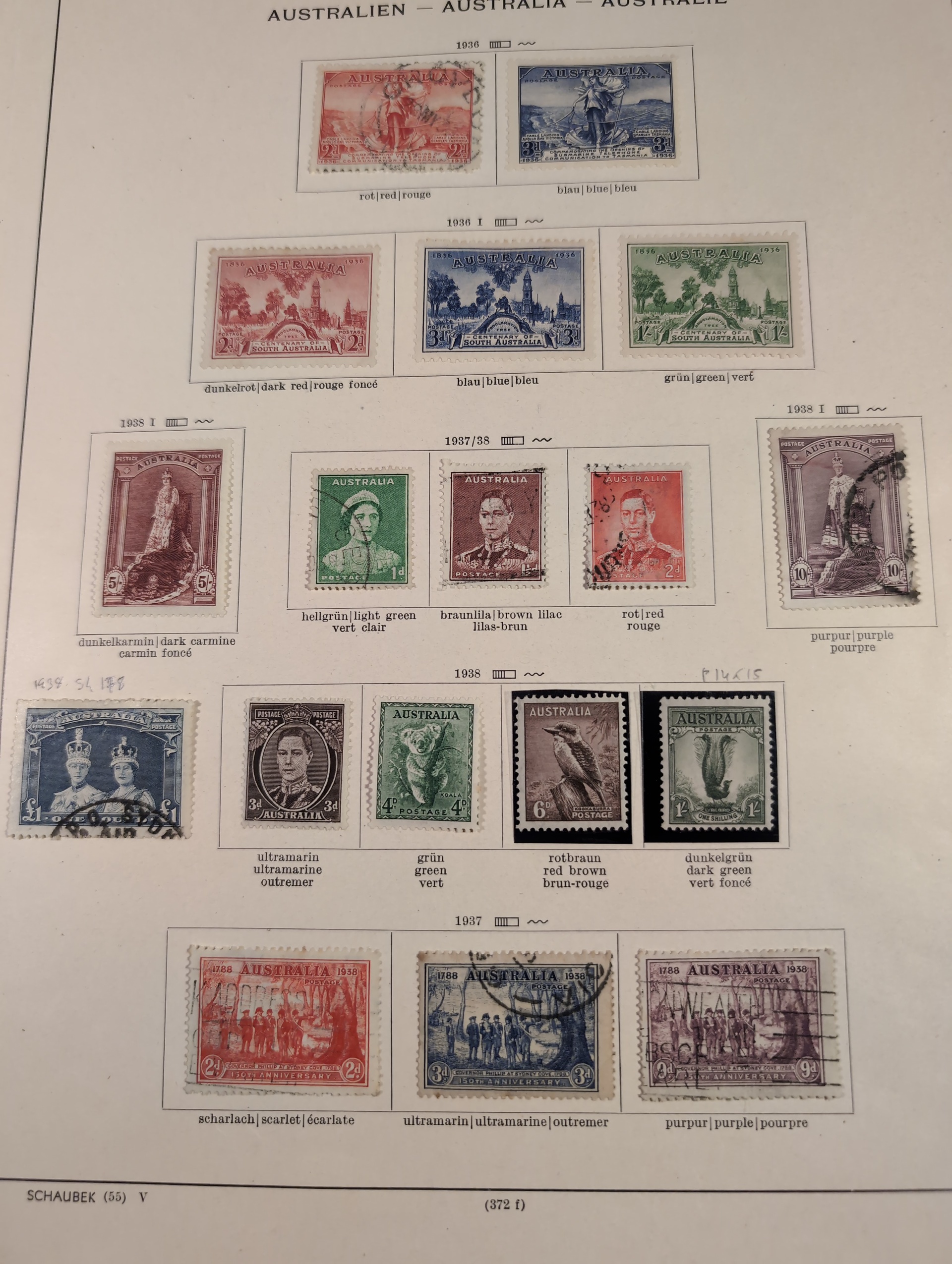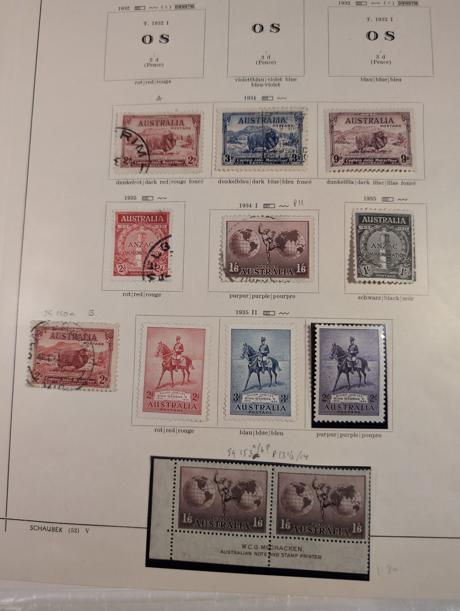 Australia. Collection ★/⊙ 1913–1971 on leaves. Roos to 10s used and 6d mint, KGV heads to 1s4s mint. Nice 1930s incl. Sidney Harbour bridge 5s CTO and robes to #1 used, no stamps 1940–1964. Mint 1965–1971 apparantly almost complete. Mostly good quality.