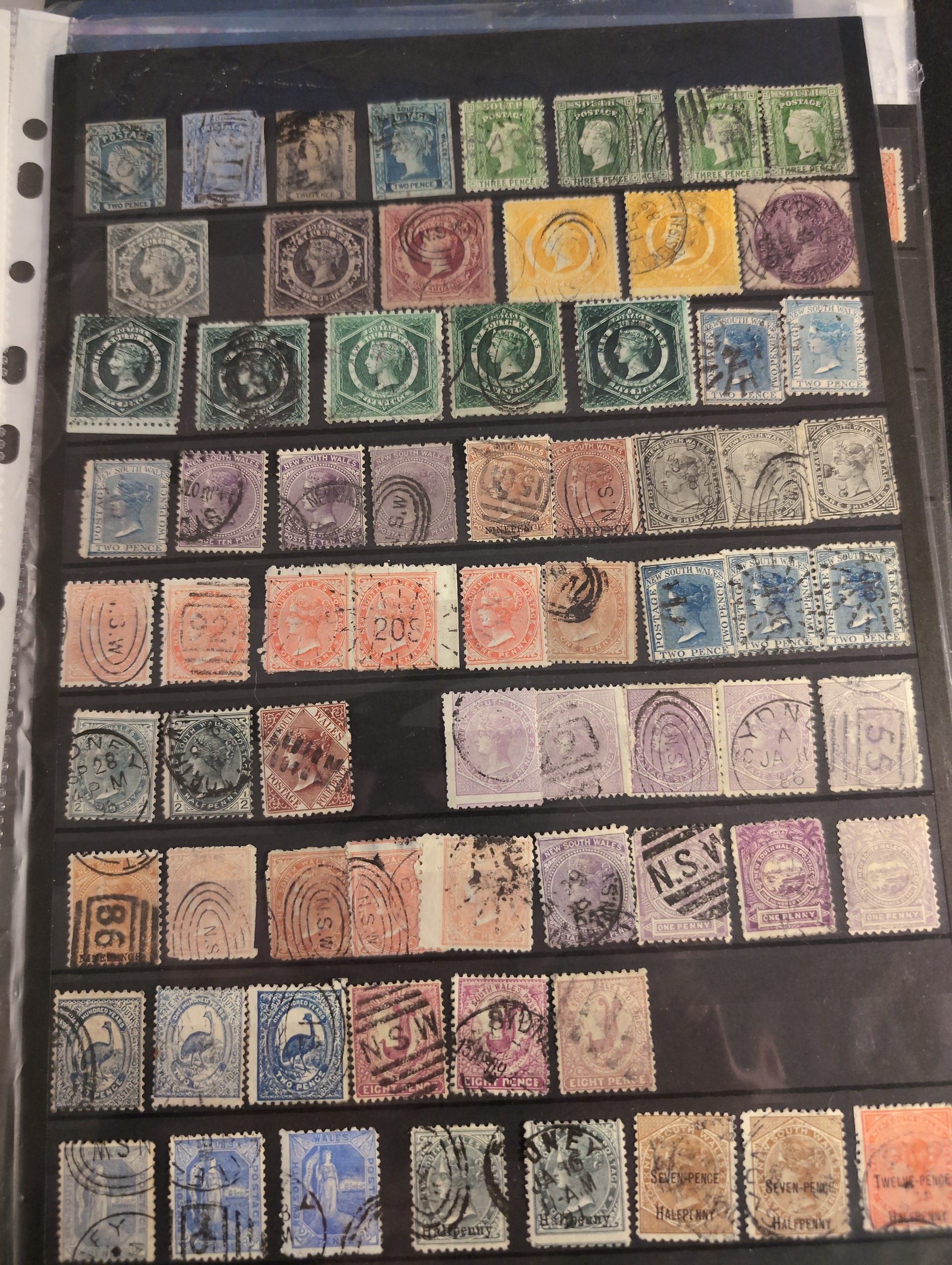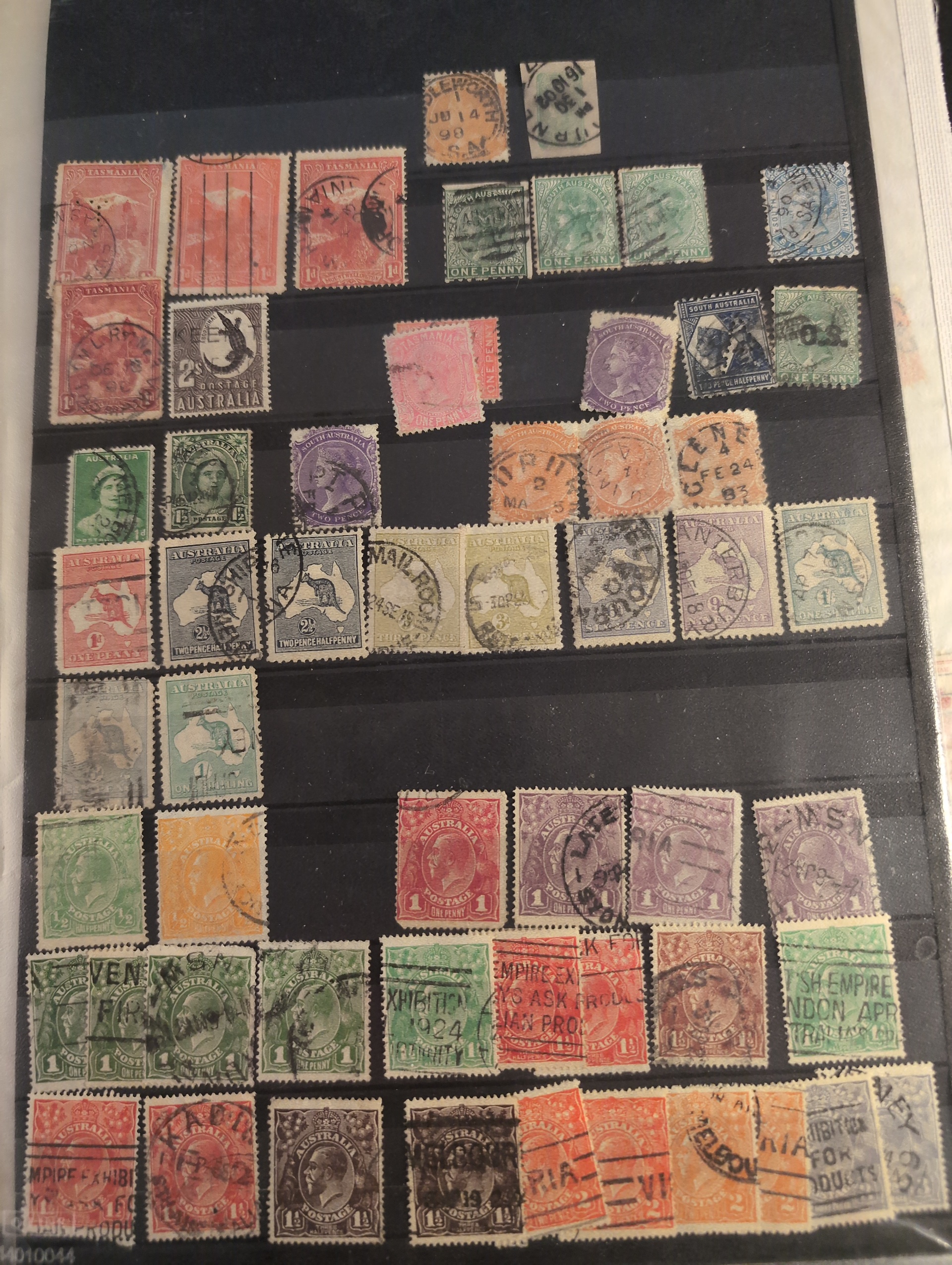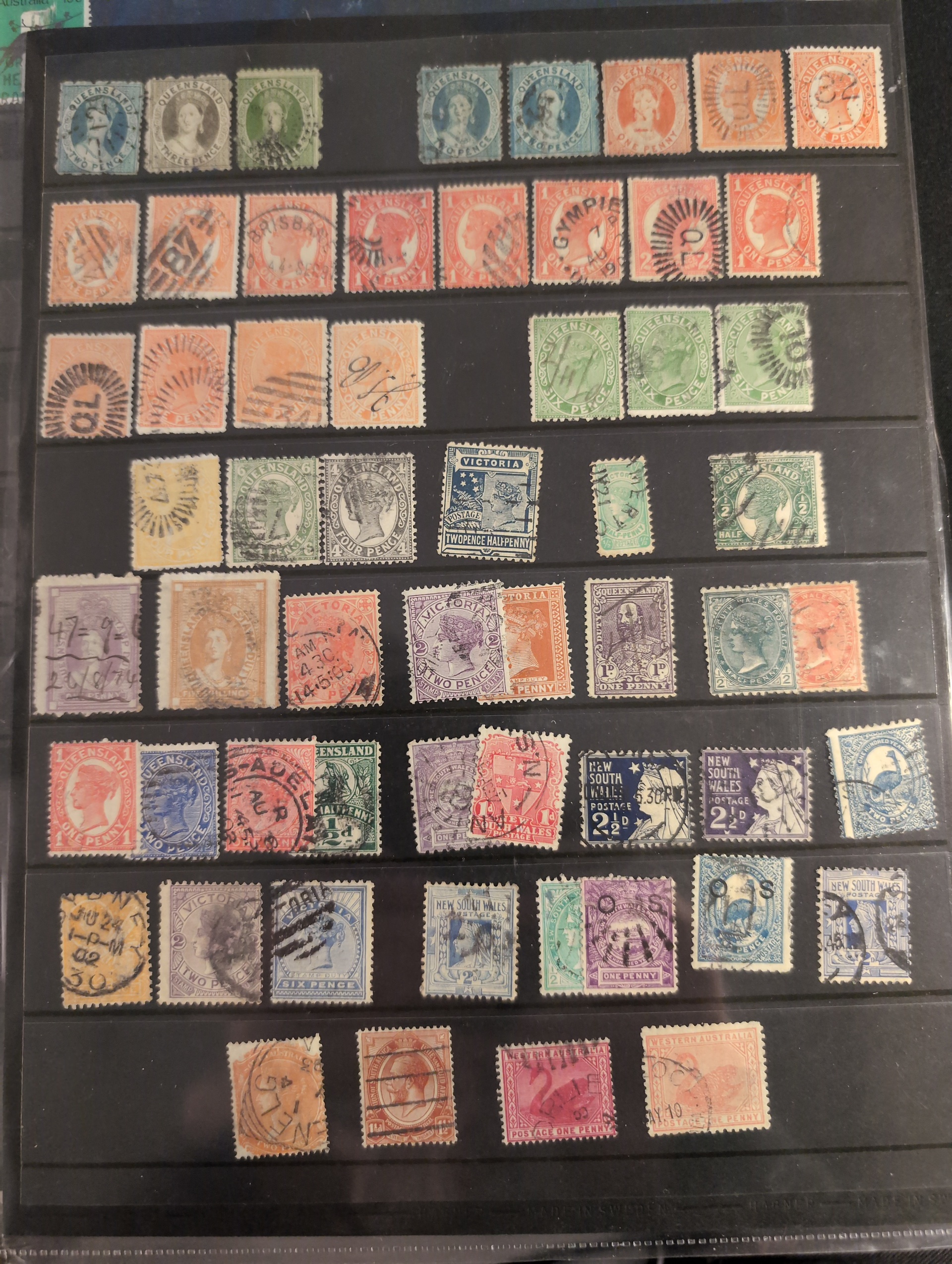 Australia. Accumulation ★★/★/⊙ 1860s–1980s on album pages. Incl. states with a few better. Also some other countries e.g. Penrhyn Island. Somewhat mixed quality. (ca. 1500)