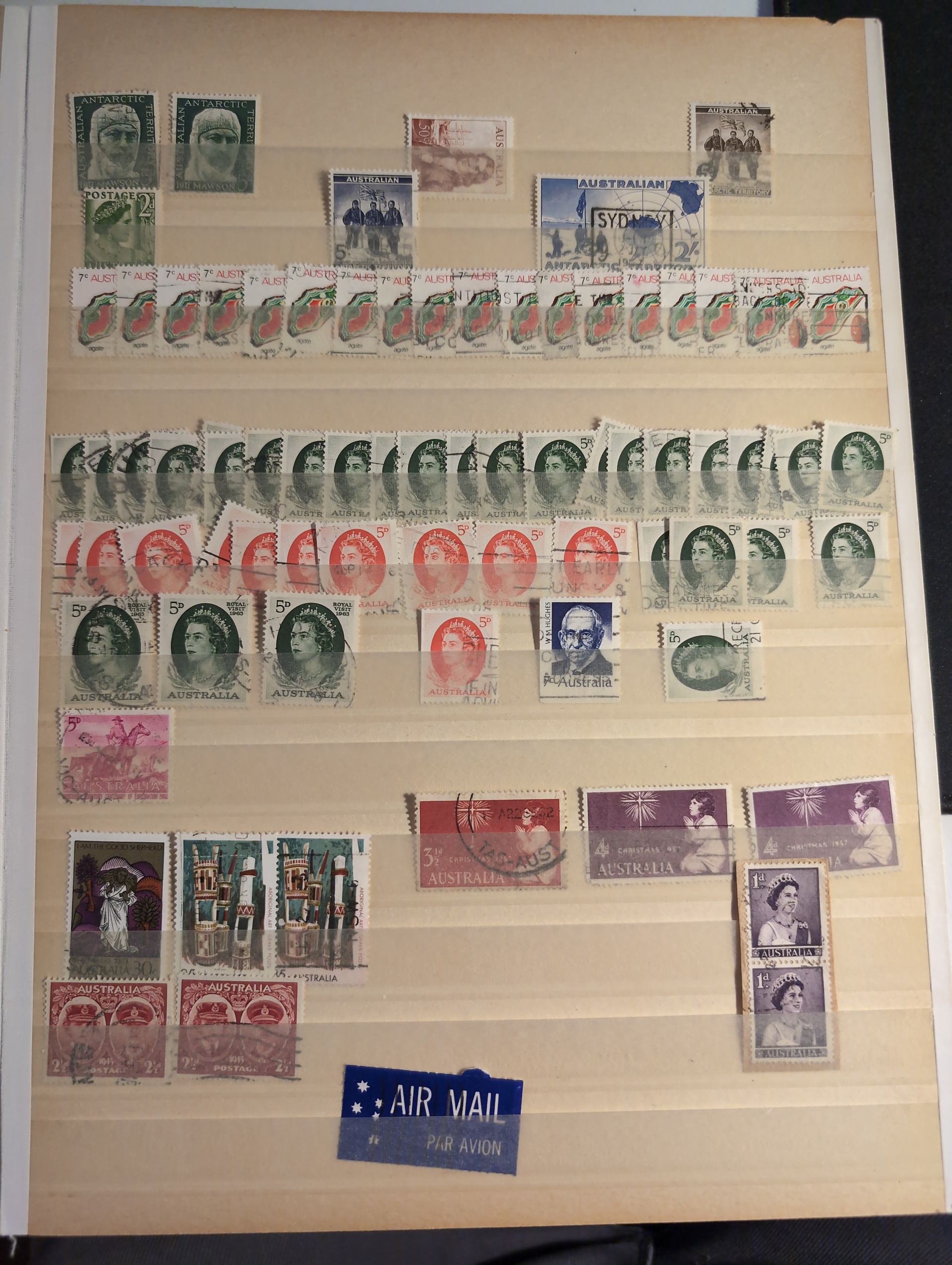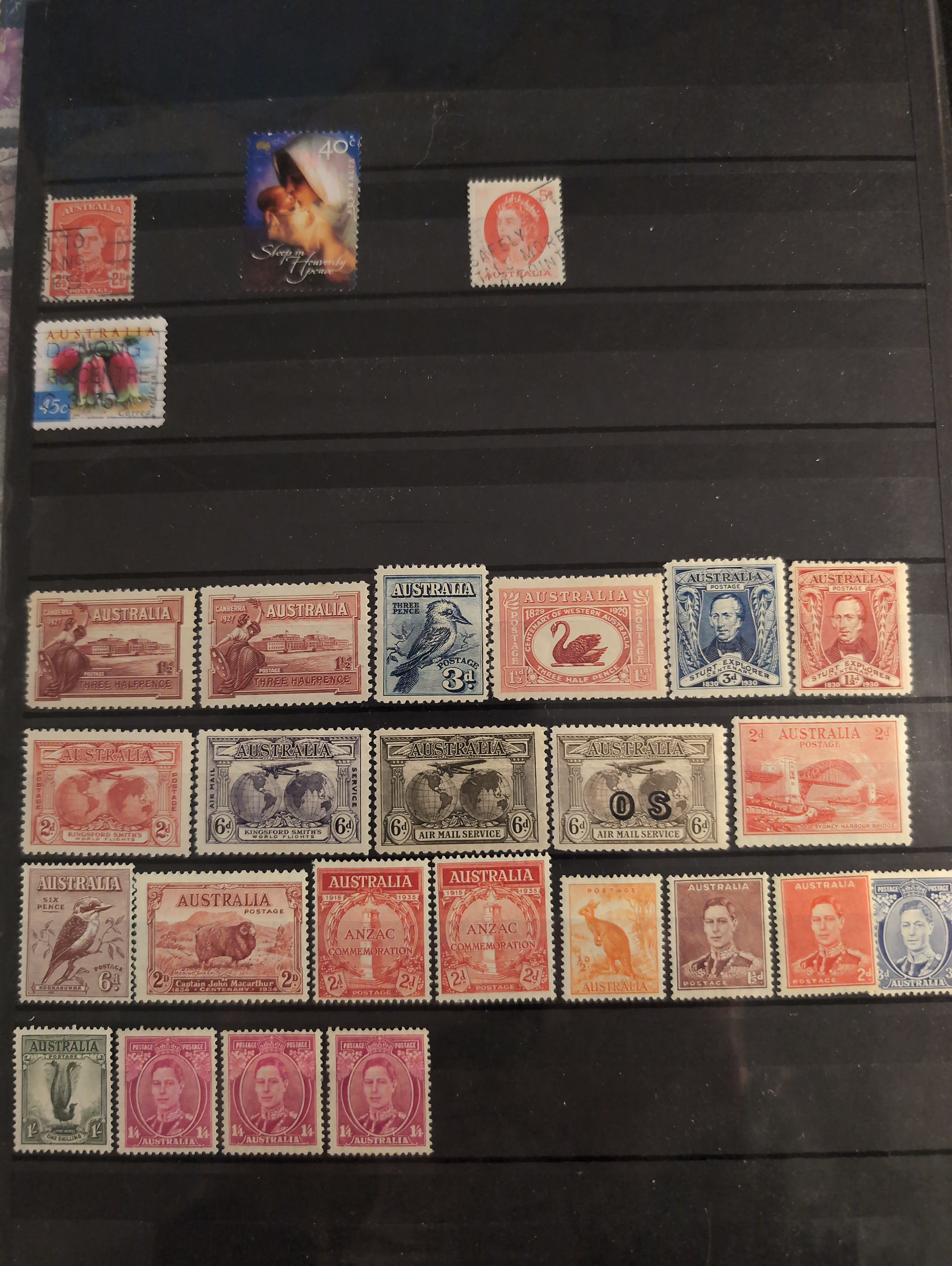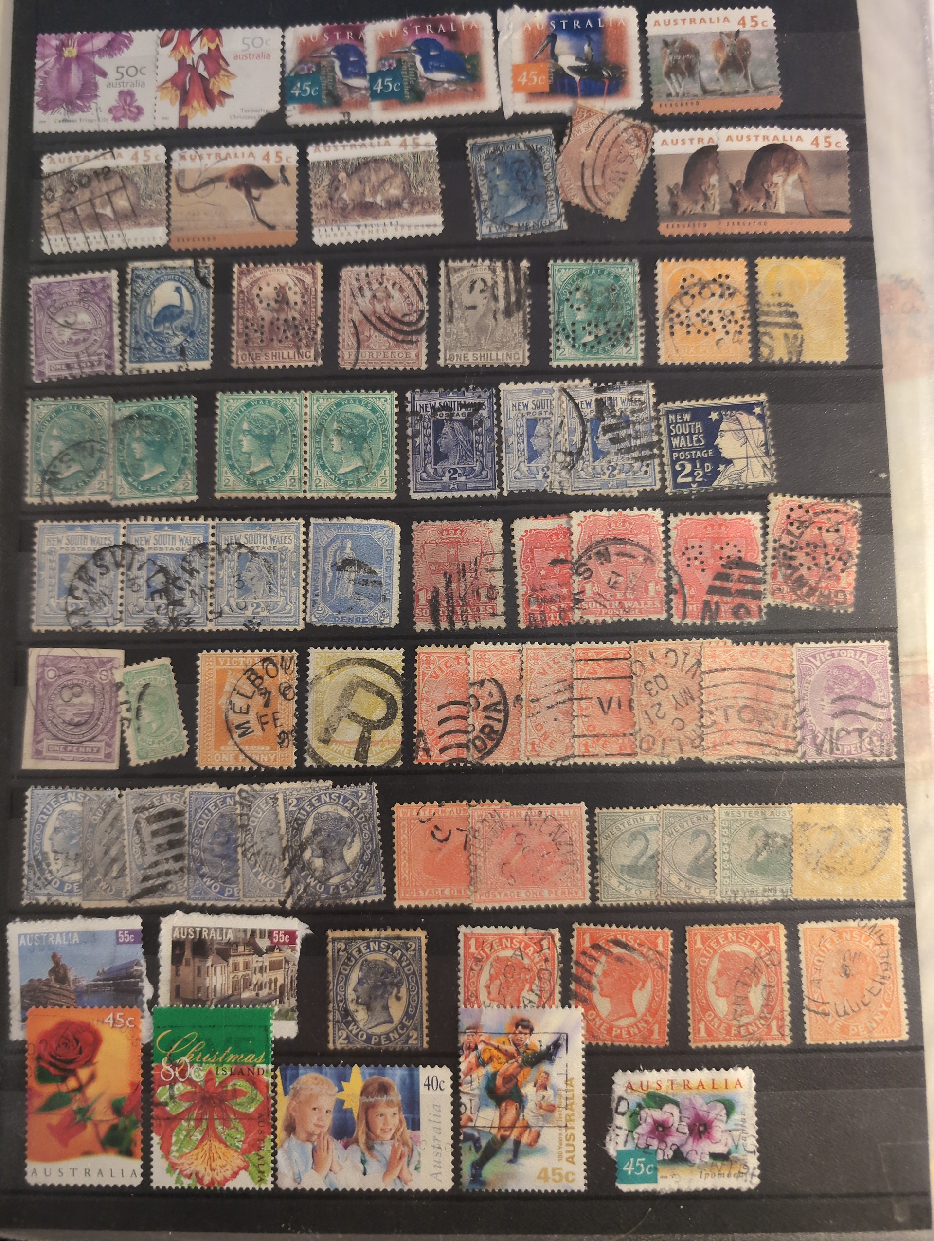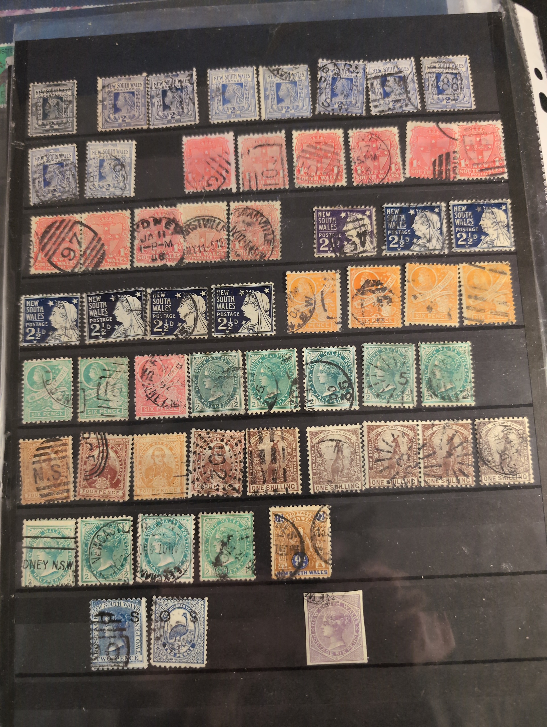 Australia. Accumulation ★★/★/⊙ 1860s–1980s on album pages. Incl. states with a few better. Also some other countries e.g. Penrhyn Island. Somewhat mixed quality. (ca. 1500)