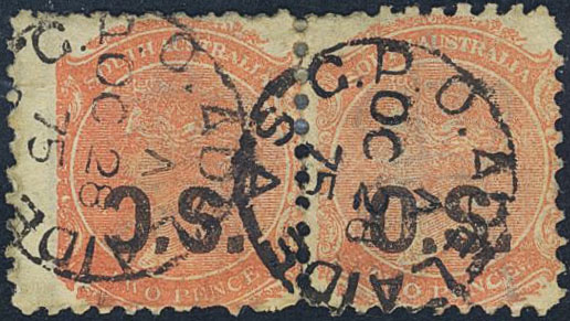 Australia, South Australia. Official Michel 8 used, 1874 O.S. overprint on 2 p Queen Victoria in pair. One with broken "O" variety, recent discovery.