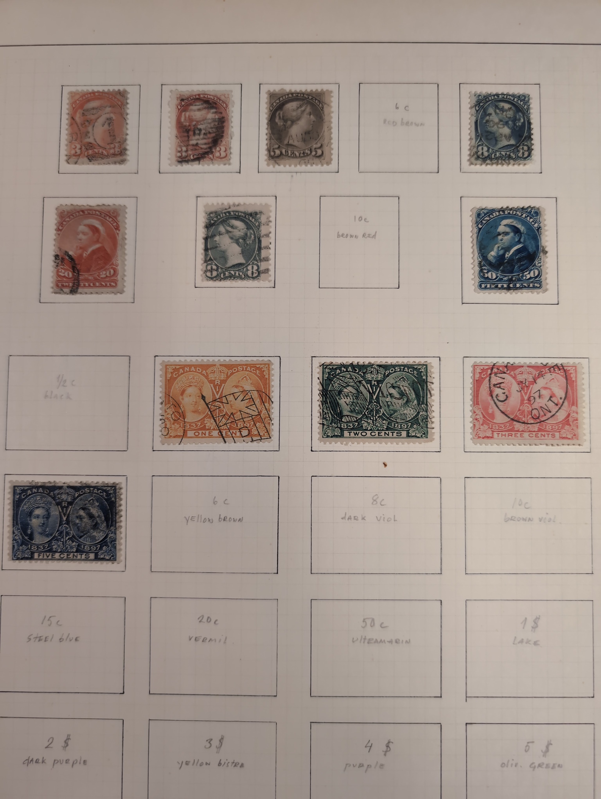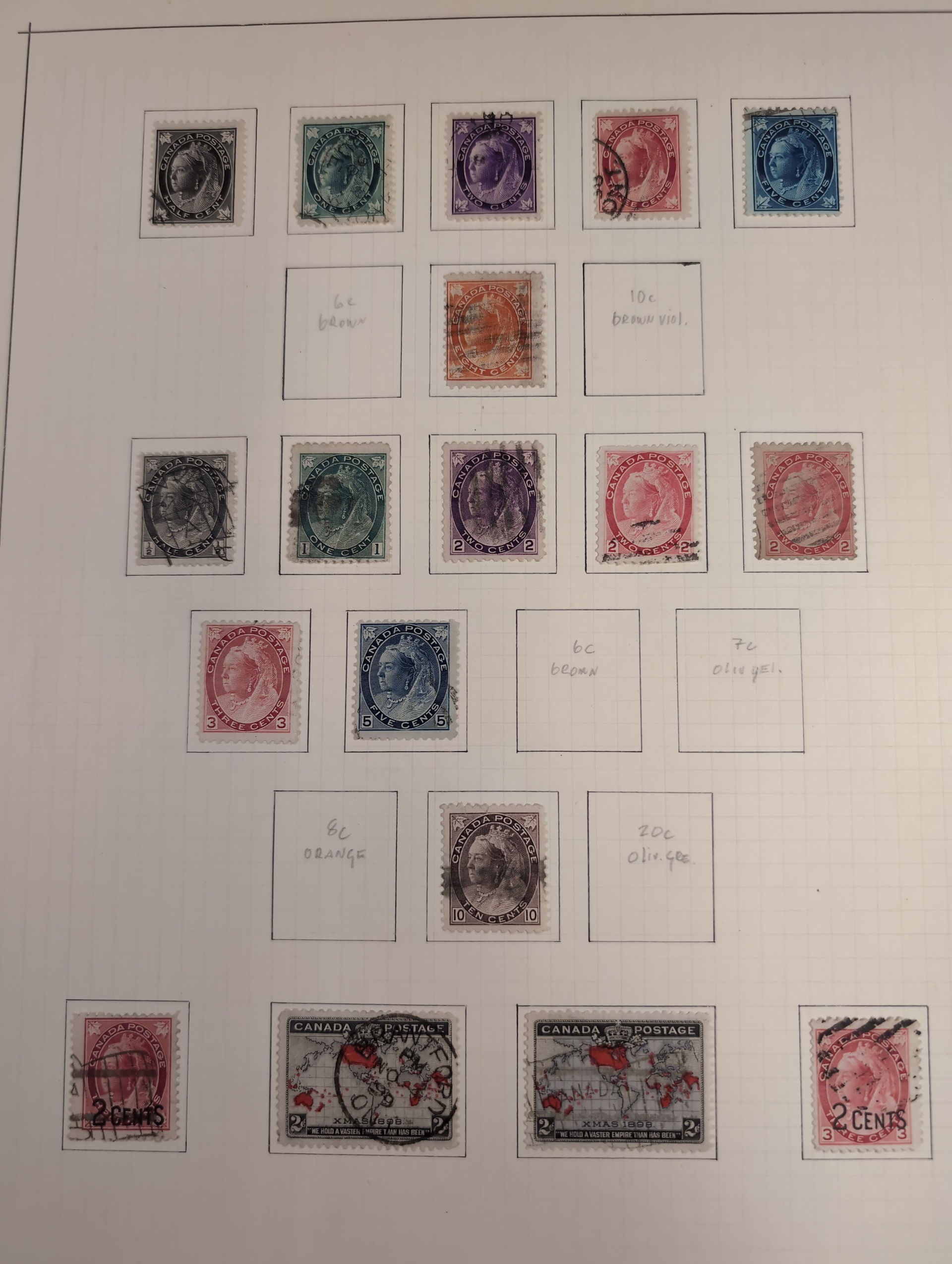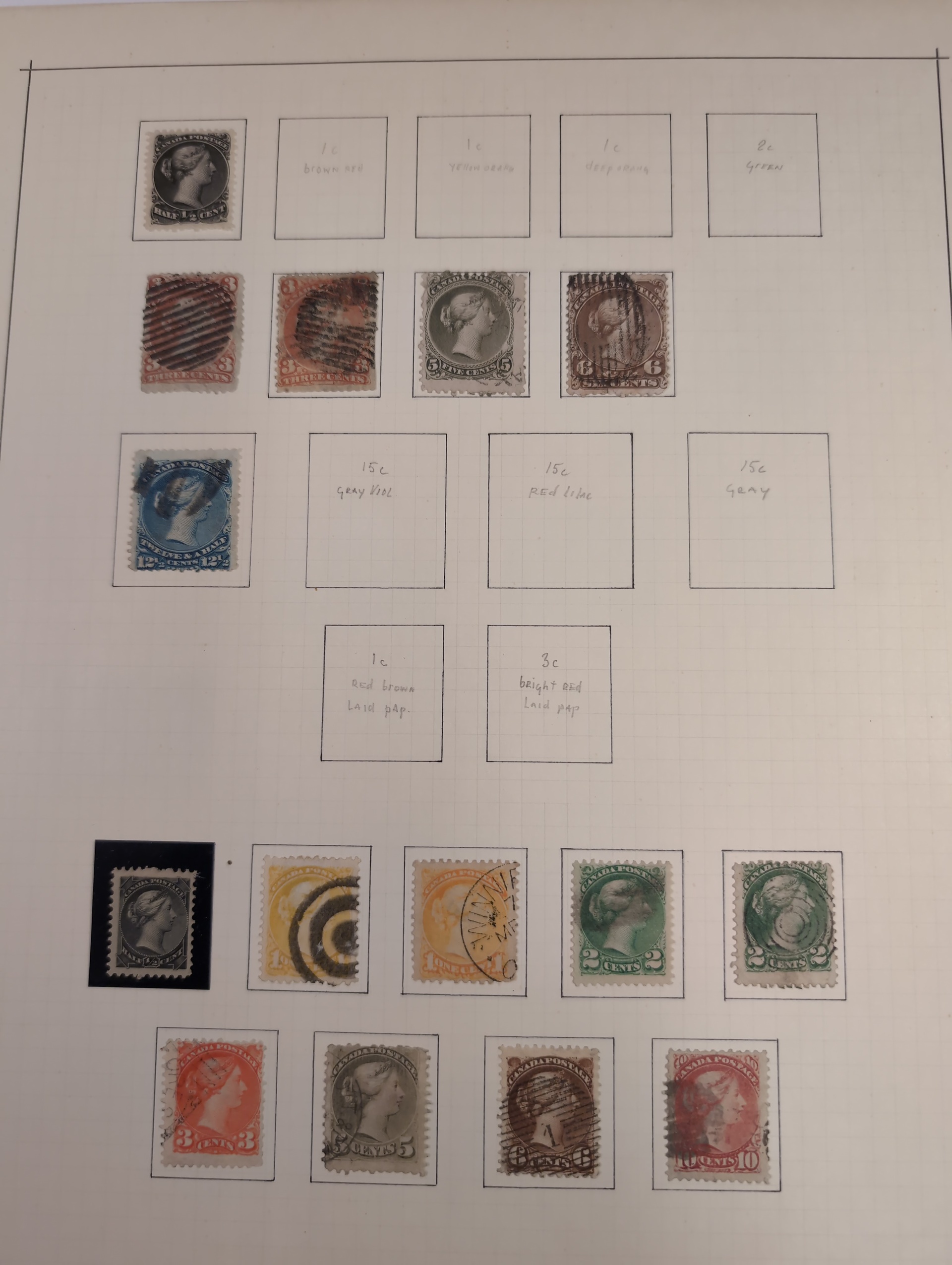 Canada. Collection used 1859–1950s on leaves. Incl some better QV and several $1 KGVI .Please see a selection of scans at www.philea.se. Mostly good quality. (ca. 250)