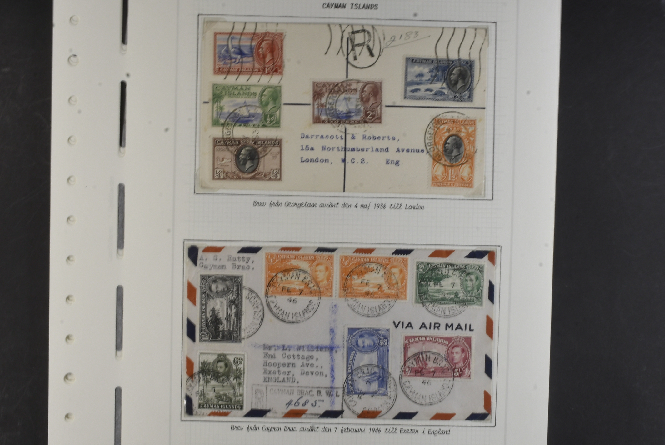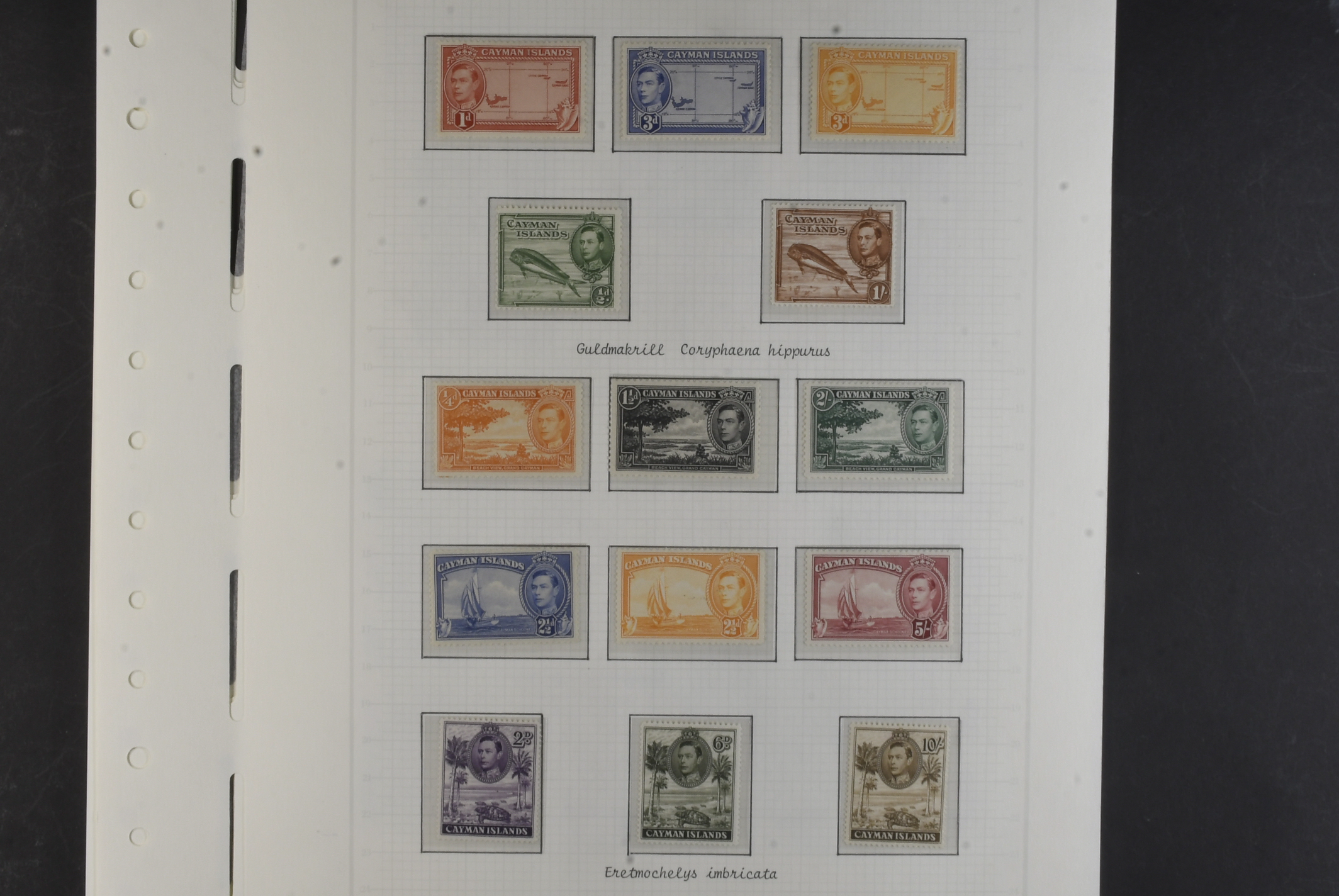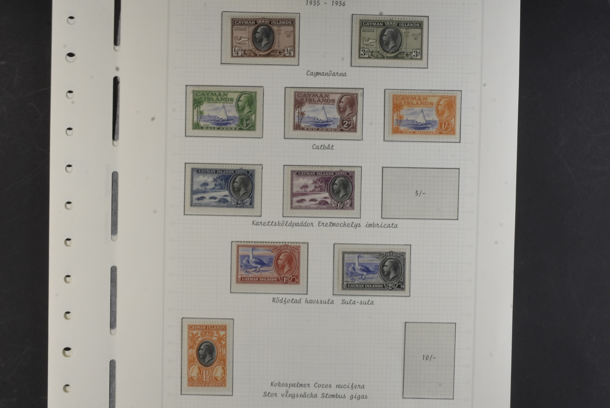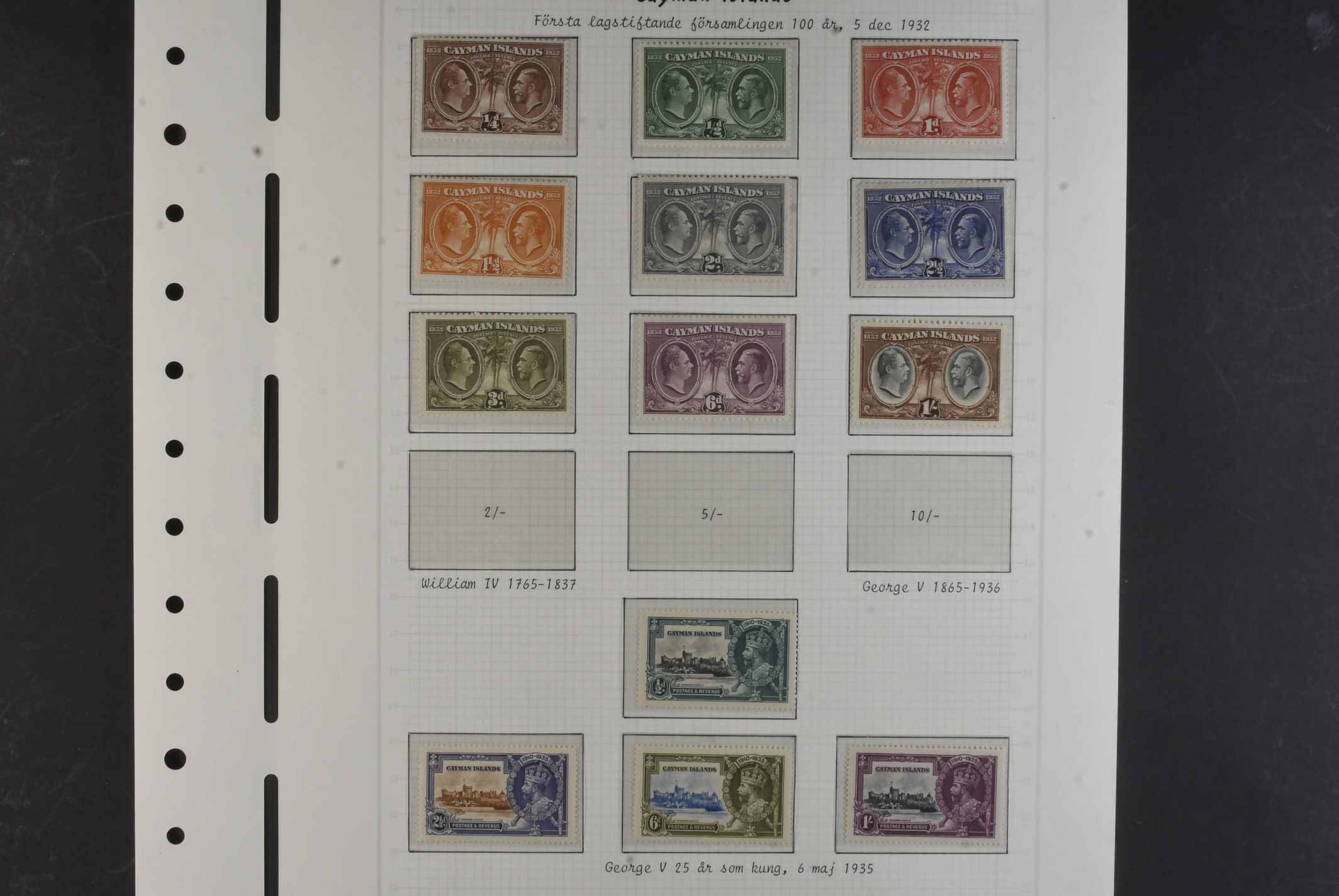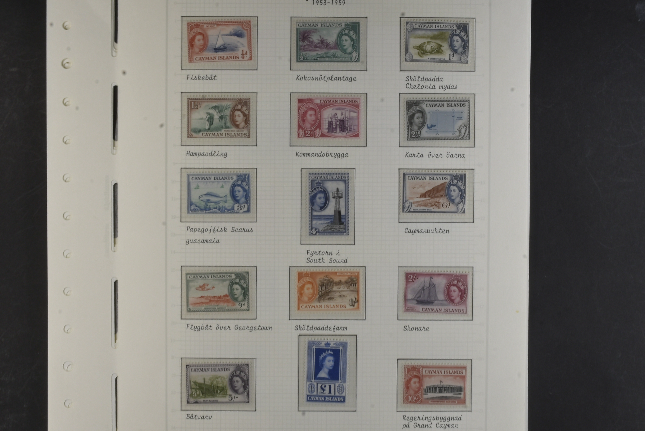 Cayman Islands. Collection ★★/★ 1932–1959 on leaves. 1932 Centenary set to 1 s mh, SJ set um, 1935 KGV set to 2 s mh, 1938 KGVI set mh and QEII 1953 set MNH. The entire lot is presented at www.philea.se. Fine quality. (52)