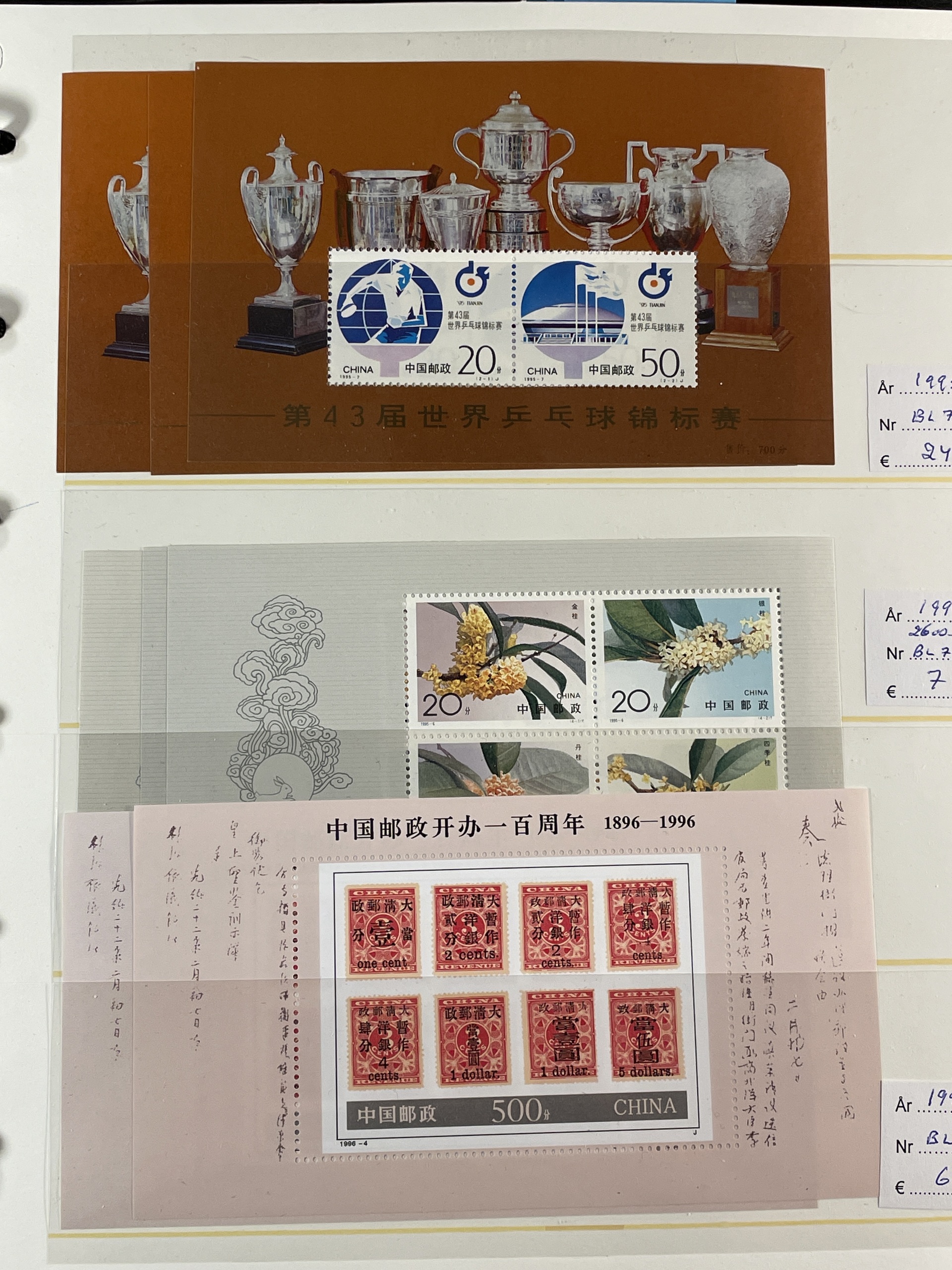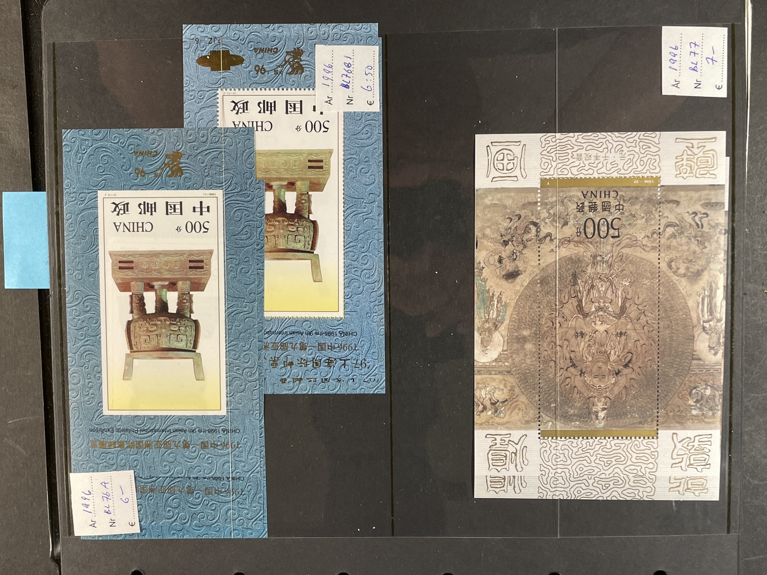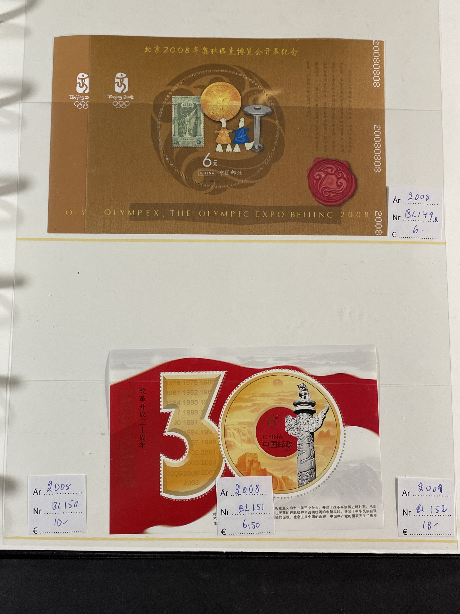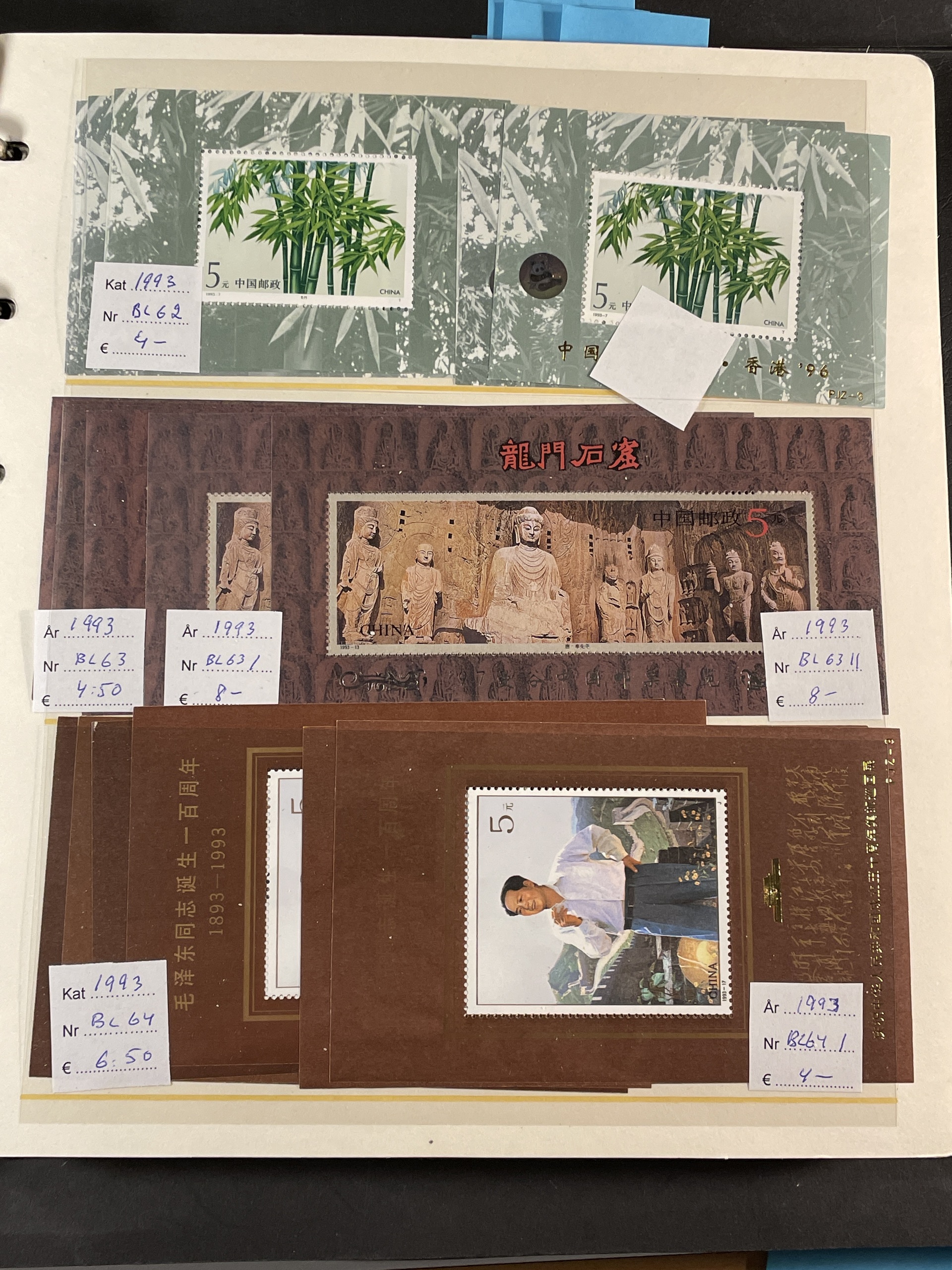 China, People’s Republic. ★★. Collection 1988–93 complete on Leuchtturm sheets, lot s/s 1984–2014 and lot mini sheets, all in three albums. Several a bit better as Emperor Qin Shi Huang set and s/s. Also some Hongkong and Macao s/s and Taiwan s/s 8 1960. Fine quality. Approx. 6 kg.
