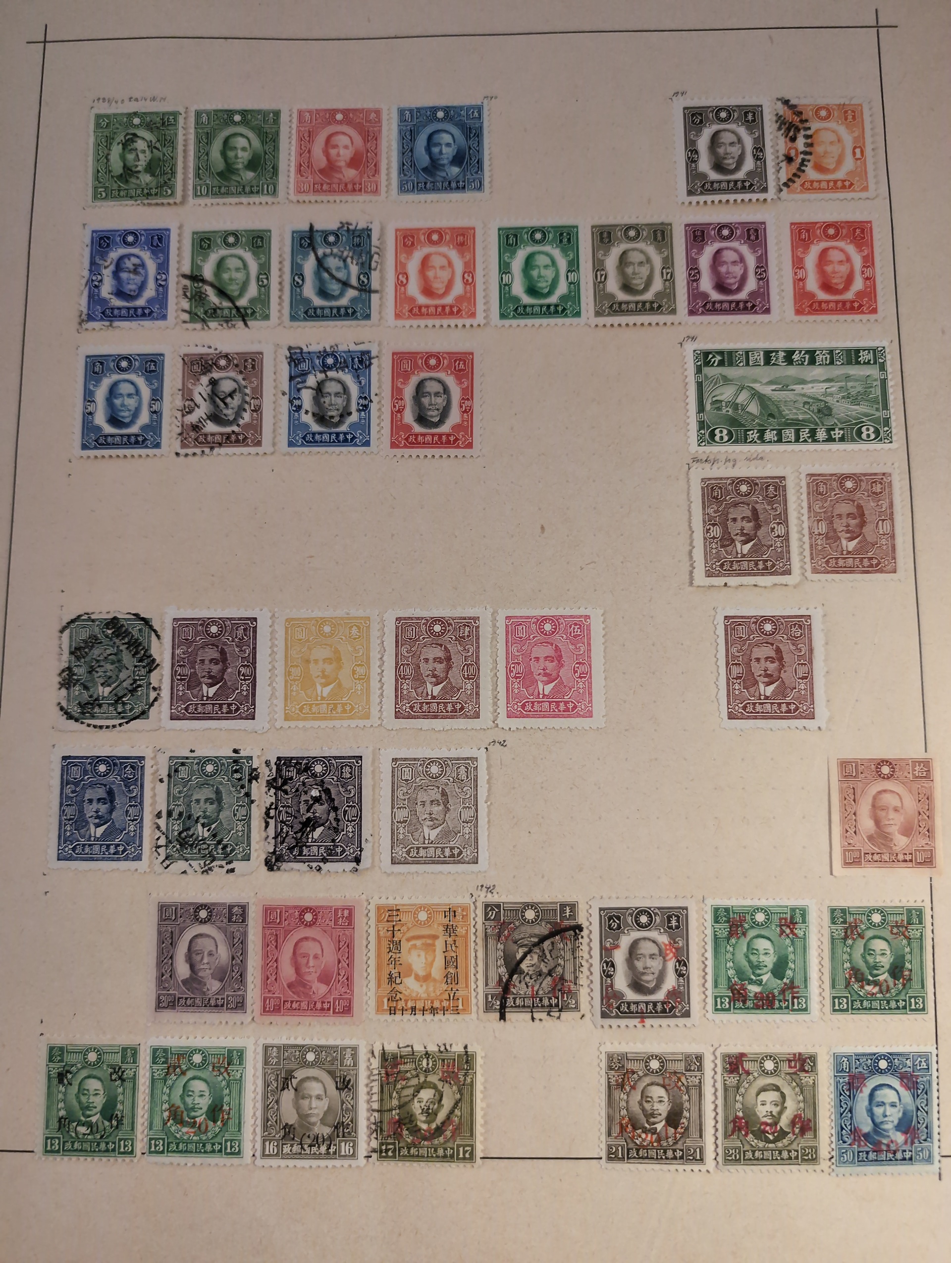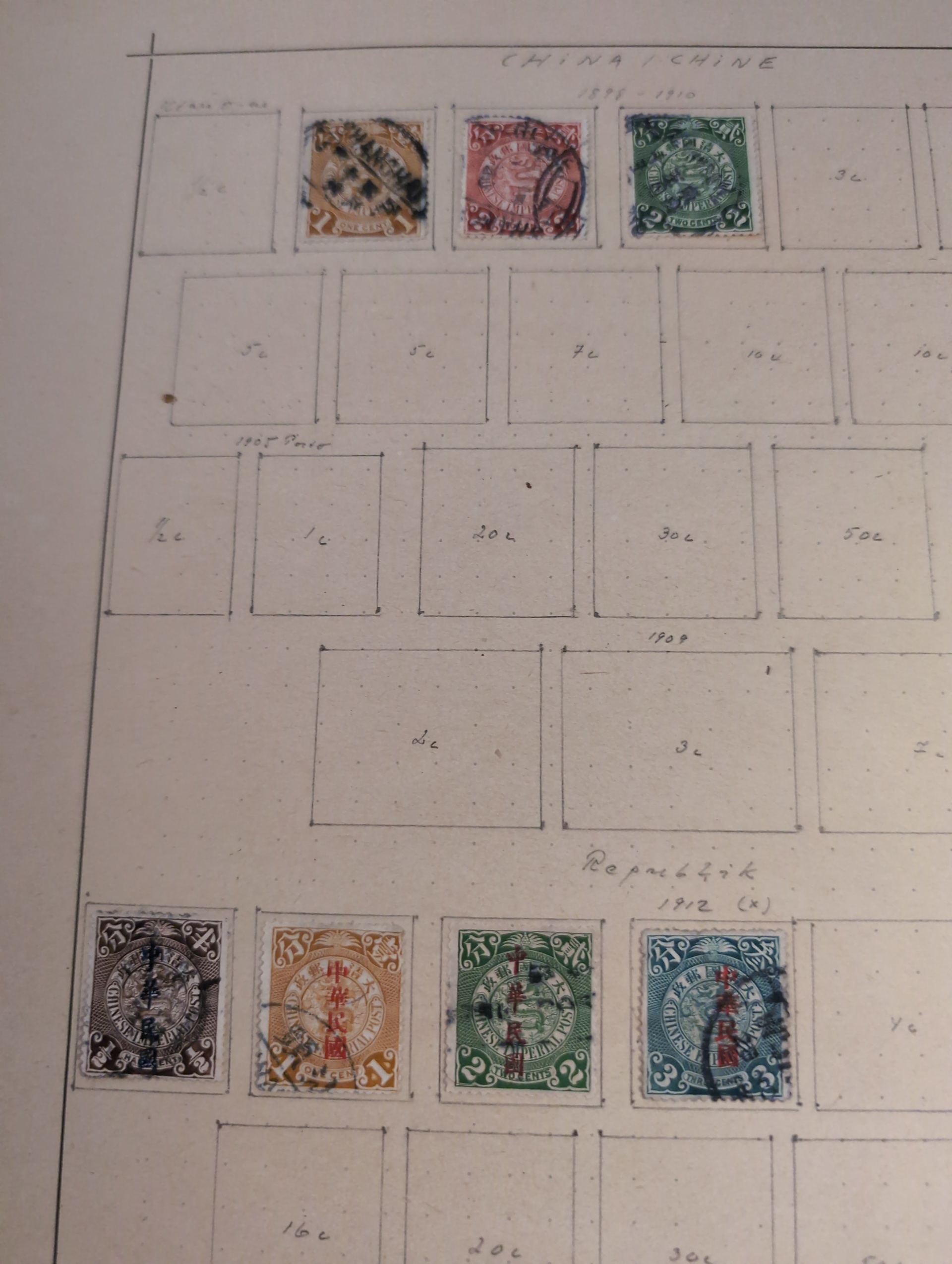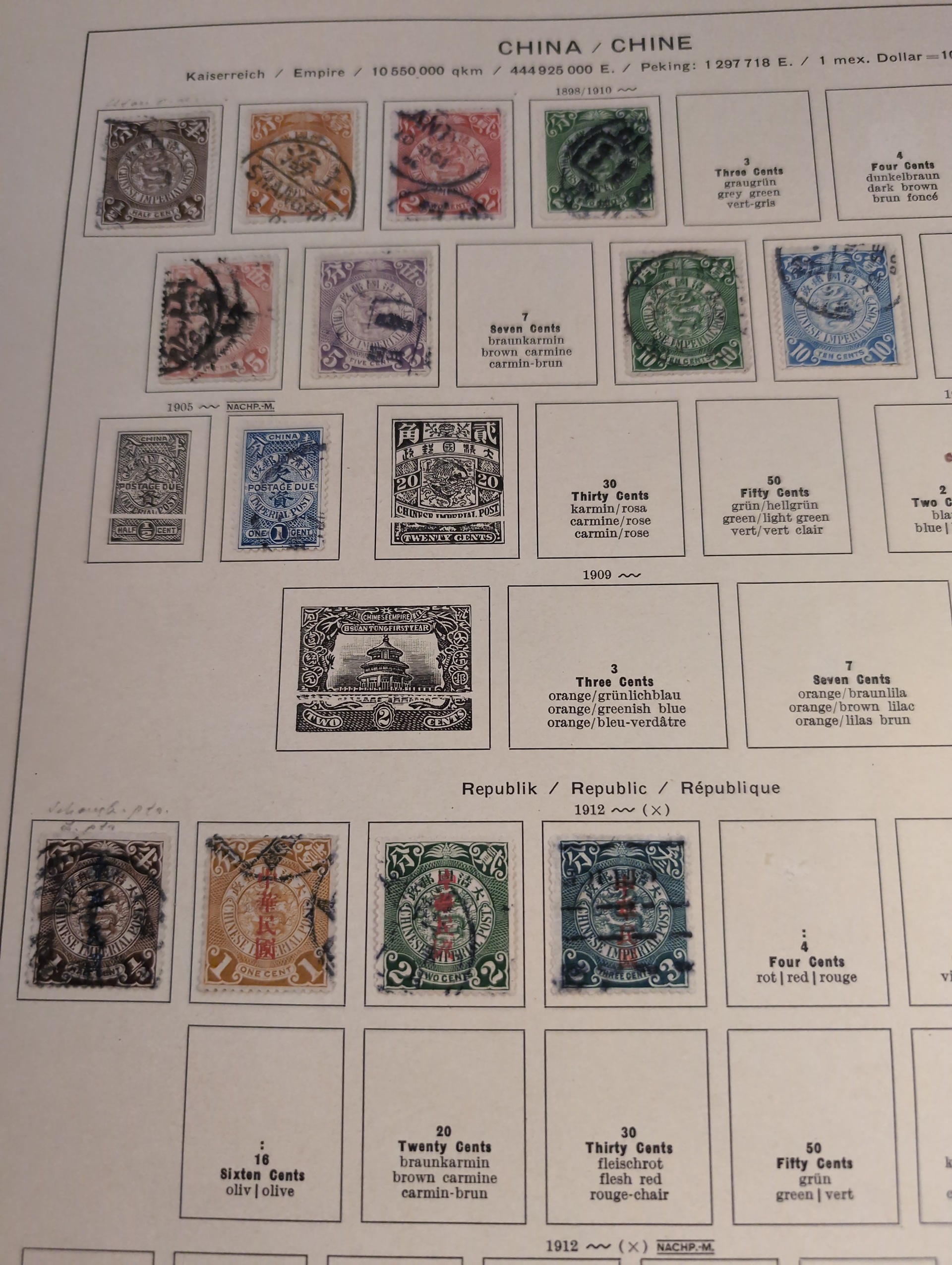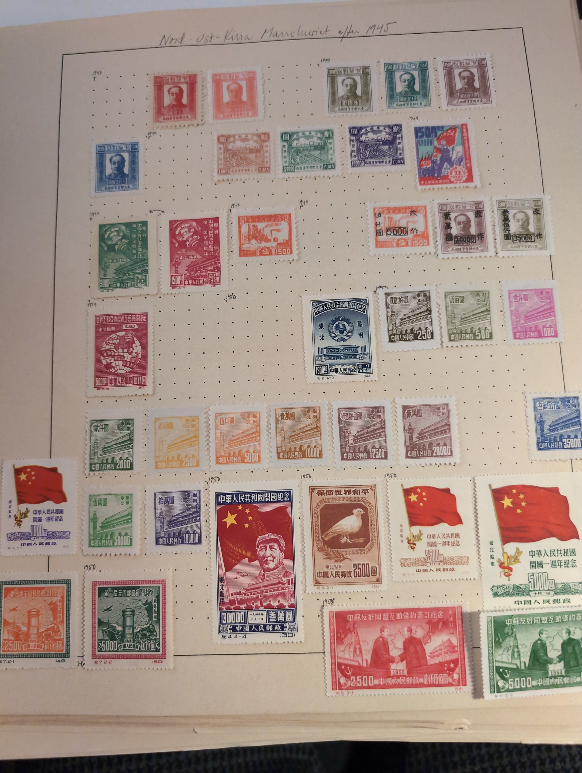 China, mixed. Accumulation ★★/★/⊙ 1900–1980s in box. pile of albums leaves from coiling dragons to 1950s, a few glassine envelopes with duplicates and a couple of album pages with 1980s incl. T.89M NH. Somewhat mixed quality. (500+)