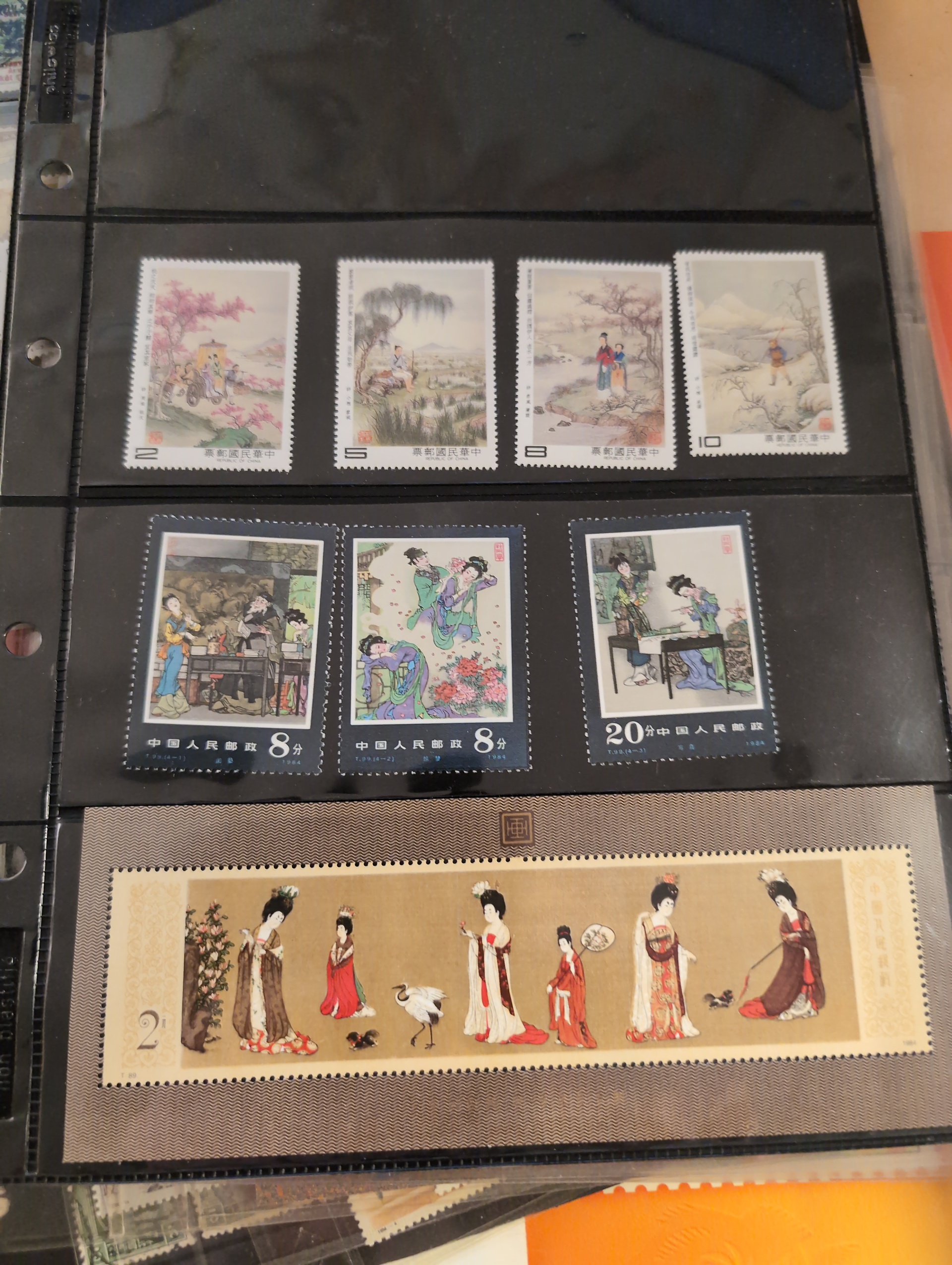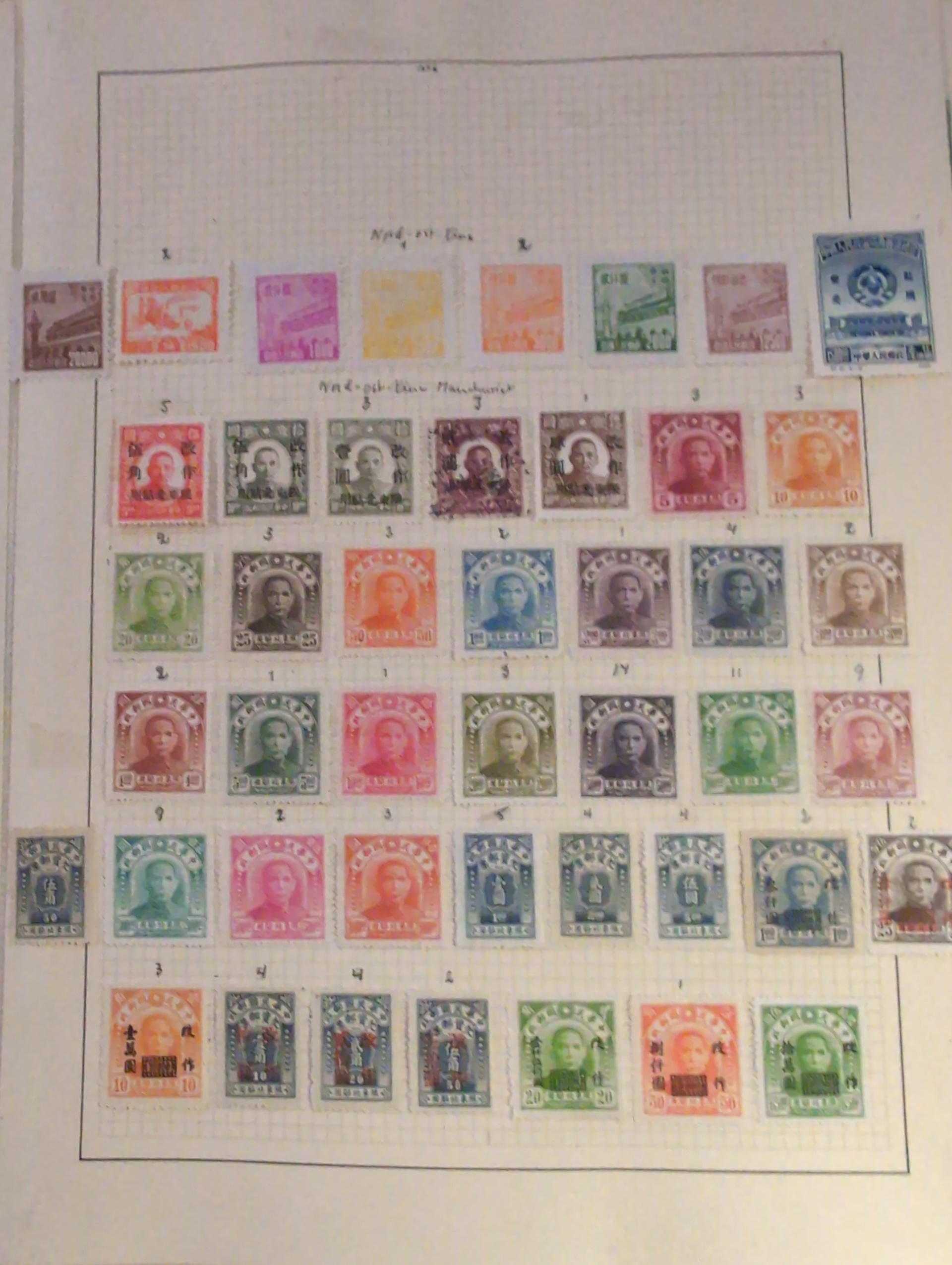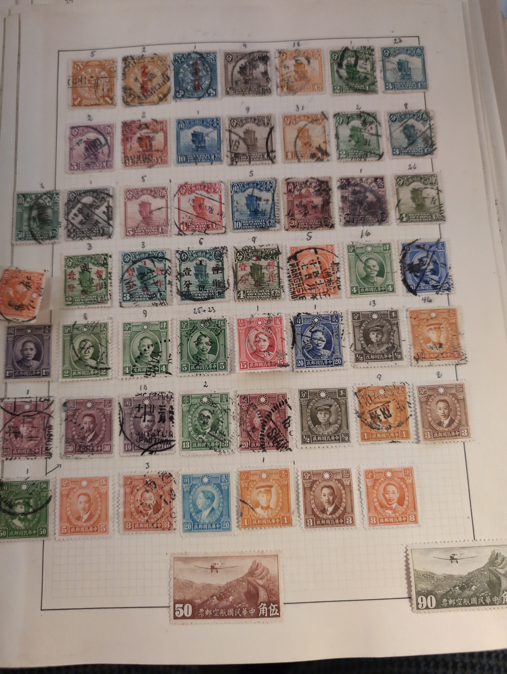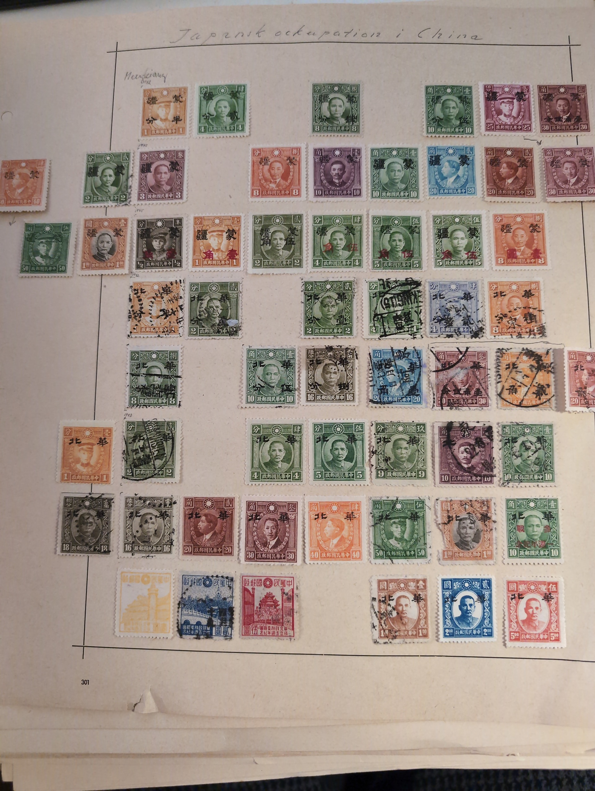 China, mixed. Accumulation ★★/★/⊙ 1900–1980s in box. pile of albums leaves from coiling dragons to 1950s, a few glassine envelopes with duplicates and a couple of album pages with 1980s incl. T.89M NH. Somewhat mixed quality. (500+)