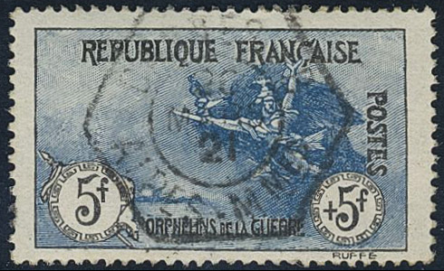France. Michel 135 used, 1917 War orphans 5+5 Fr blue/black. Nice central cancel with a very small part of a second cancel at left. EUR 1300
