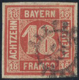 Germany, Bavaria. Michel 13 used, 1862 18 kr dark vermilion. Good margins. EUR 240