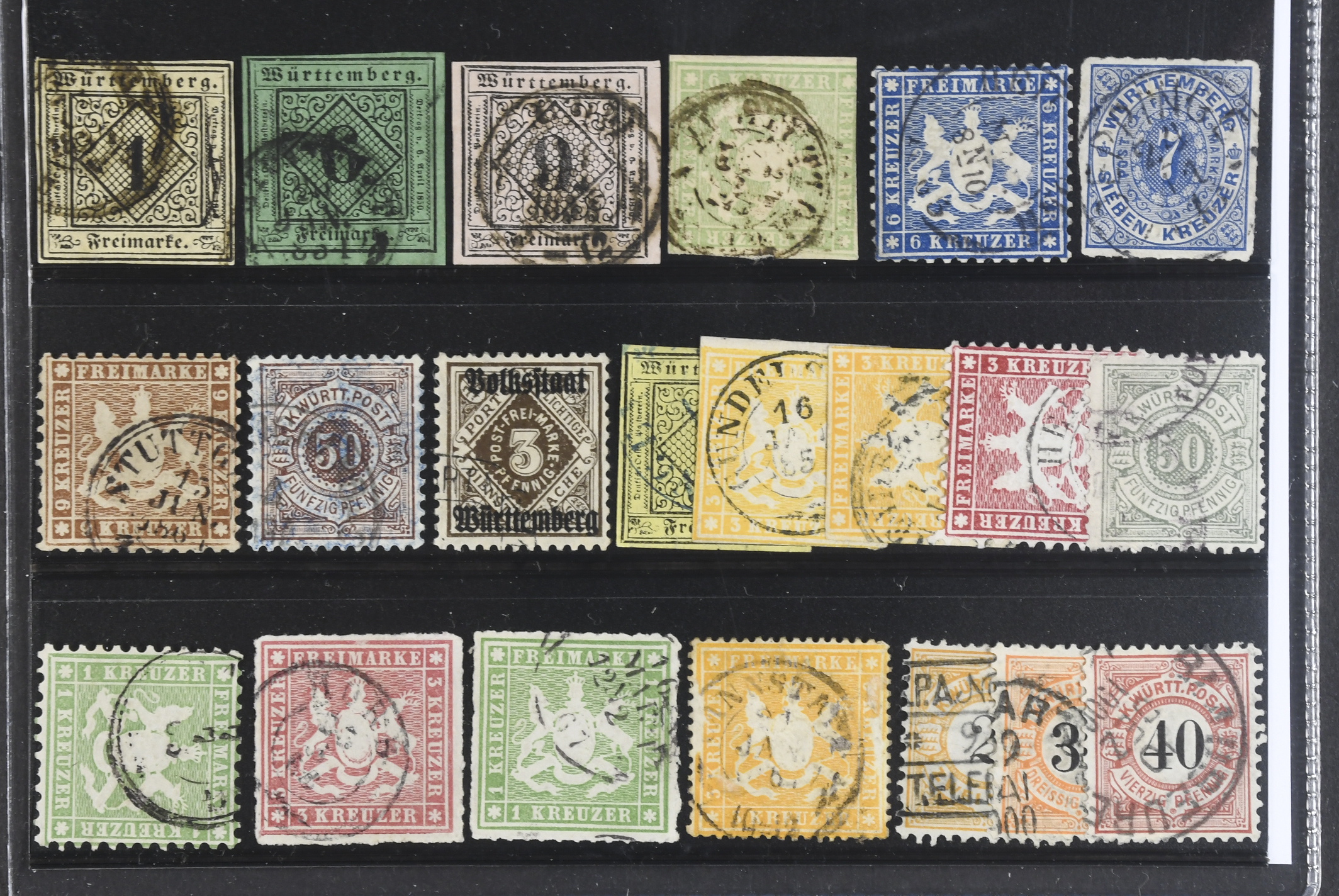 Germany, Württemberg. Used 1851–1919. All different, e.g. Mi 1, 3–4, 8, 27–28, 39, 58, 135. Mostly good quality. Mi € 711 (21)