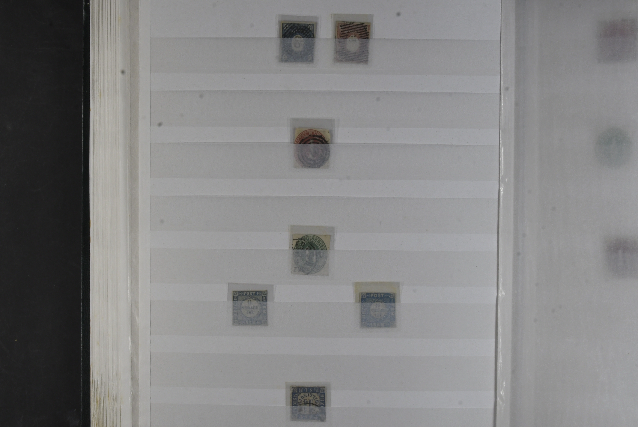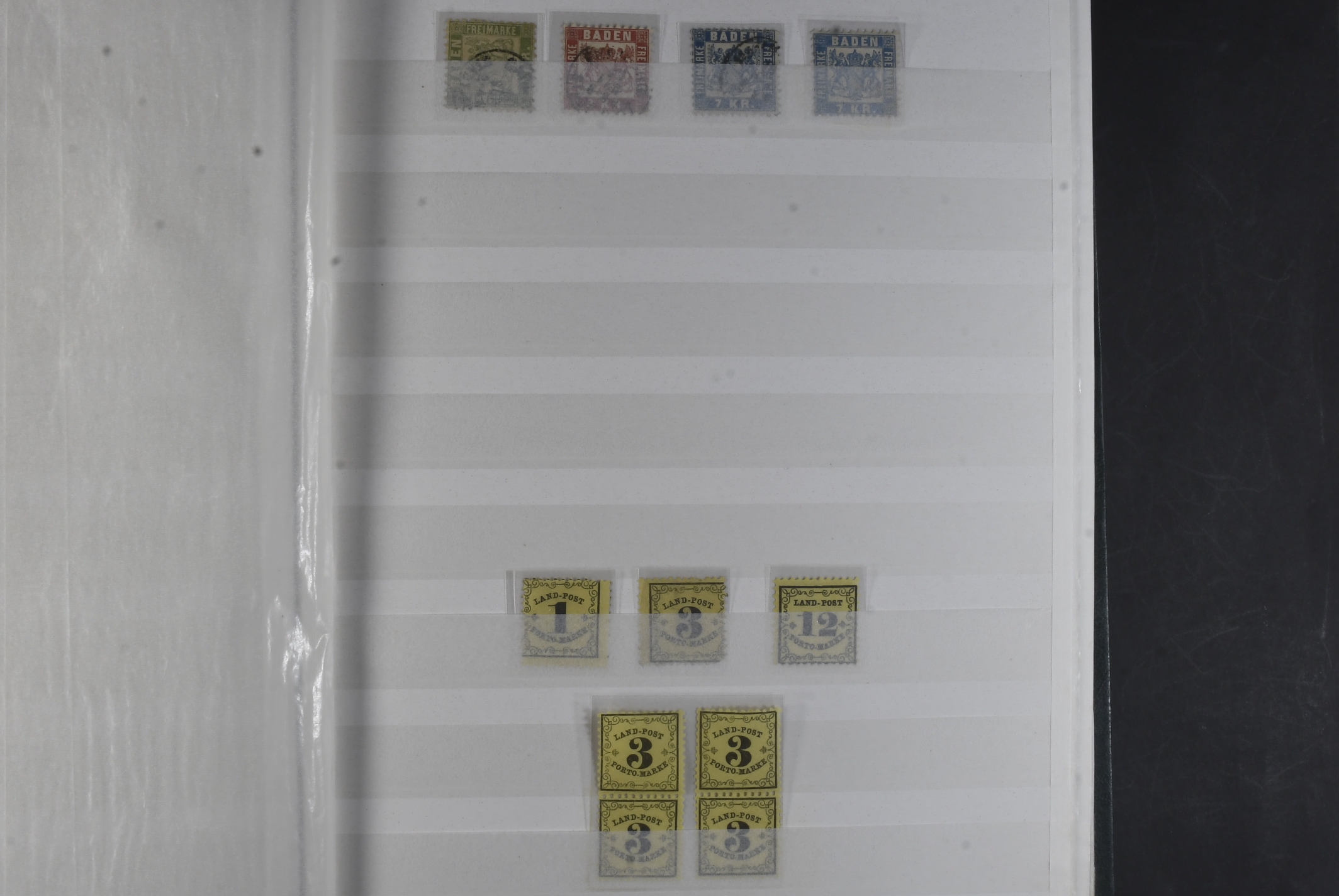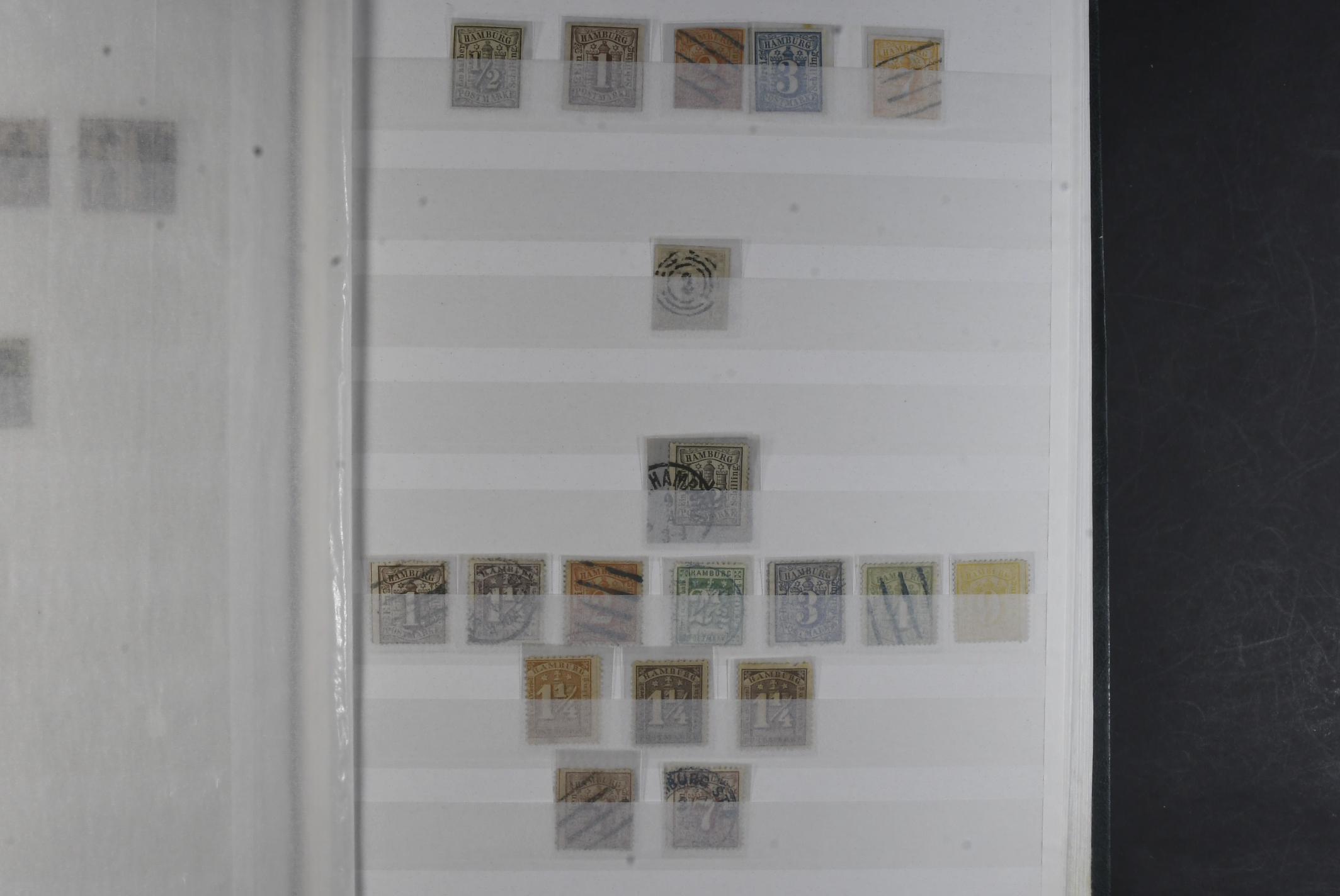 Germany, states. Collection ★★/★/⊙ 1850–1923 in large stockbook. Baden, Braunschweig, Hamburg, Hannover, Helgoland, Oldenburg Prussia and much more. Better stamps, some with signs but also falsaries and new prints. Please see a selection of scans at www.philea.se. Somewhat mixed quality.