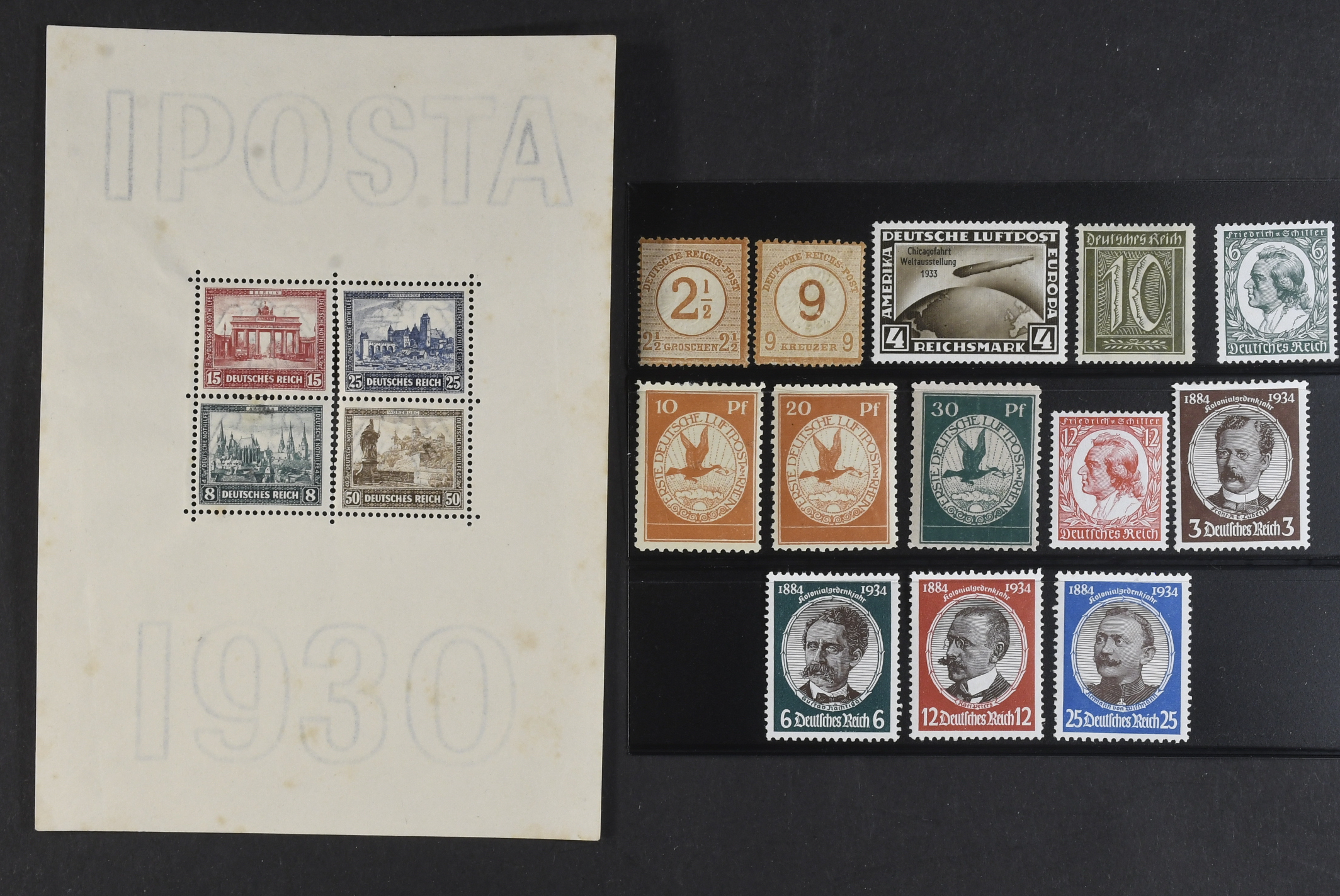Germany, Reich. ★ 1874–1934. All different, e.g. Mi 29–30, I–III, 446–49 souv. sheet 1 (some spots), 498. Mostly good quality. Mi € 1.003 (14)