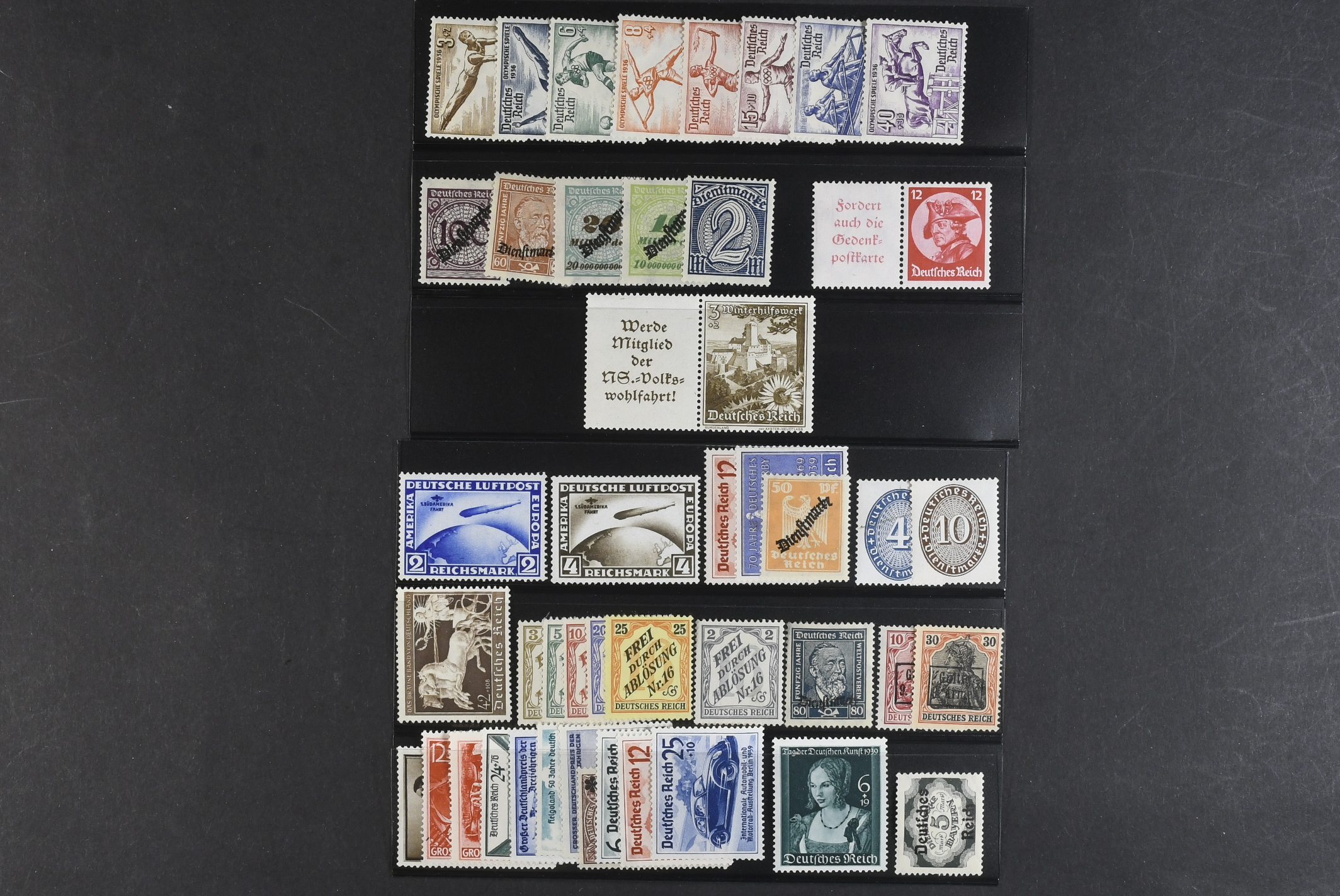 Germany, Reich. ★ 1920–1945. All different, e.g. Mi 497–98, 696, 698, 747, W45, officials 9–14, 111, 113, 130–31. Mostly good quality. Mi € 667 (45)