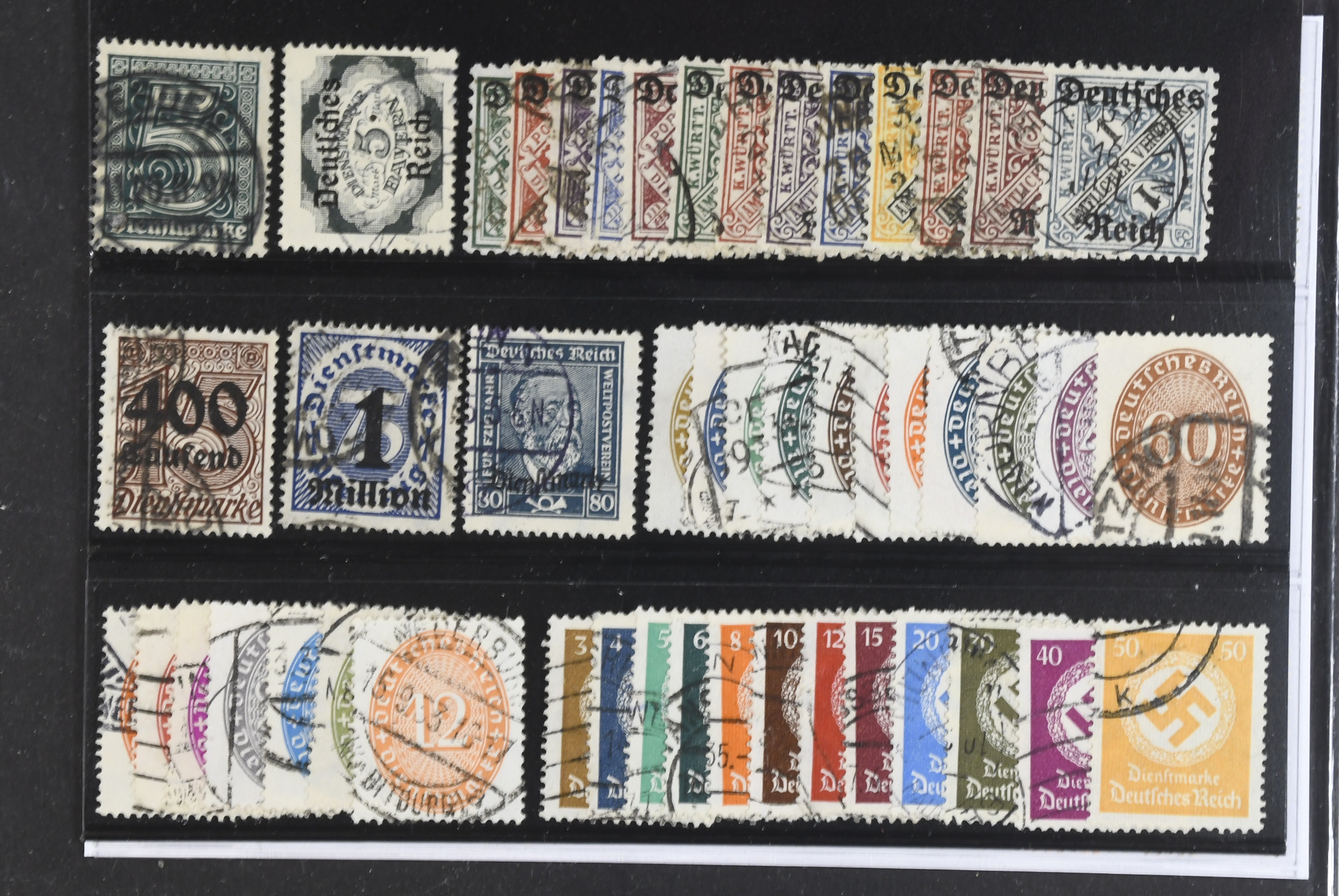 Germany, Reich. Used 1903–1944. Officials. All different, e.g. Mi 23, 51, 52–64, 94 (signed), 96 (signed), 113, 114–31, 132–43, 166–67. Mostly good quality. Mi € 1070 if all cancellations are genuine (76)