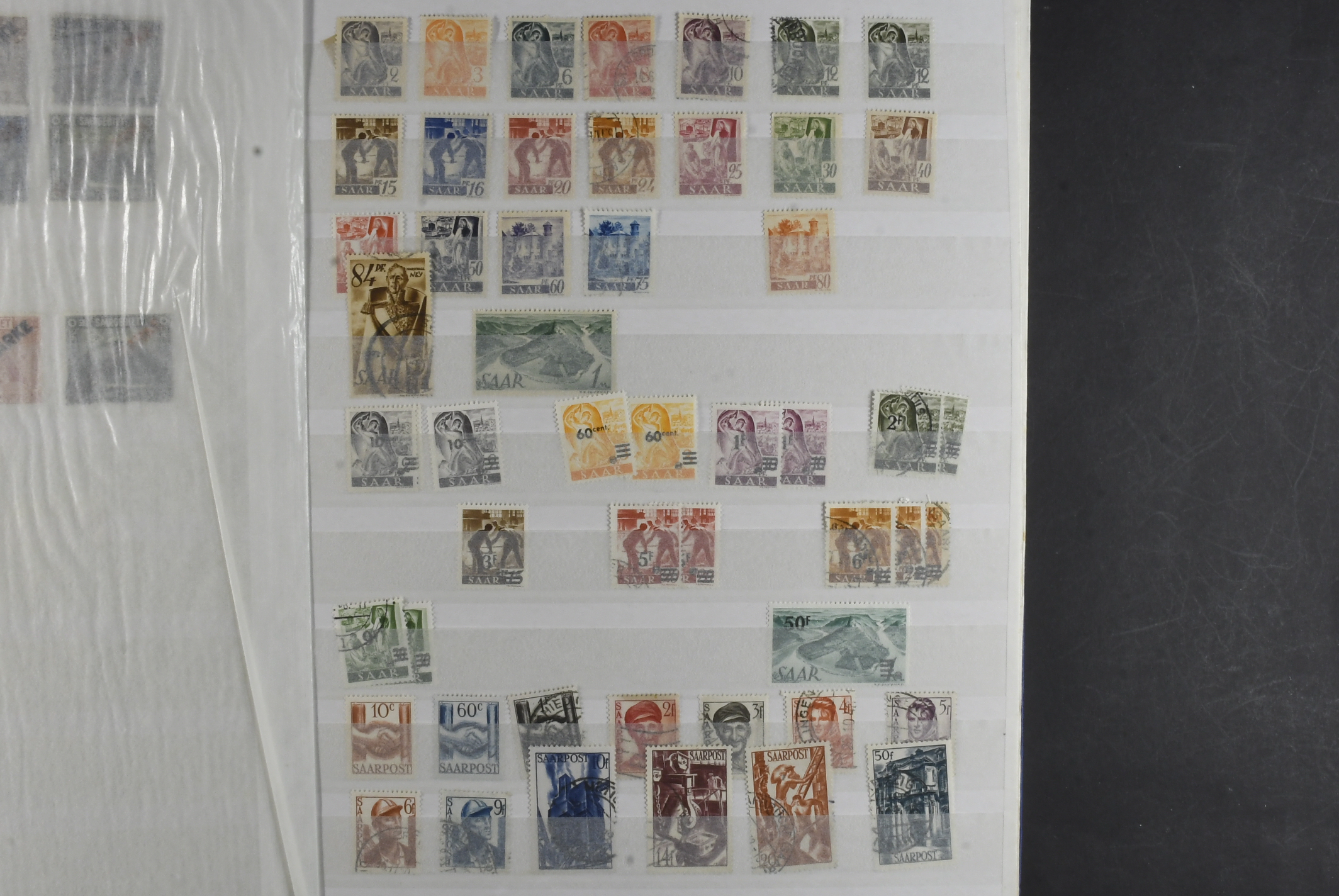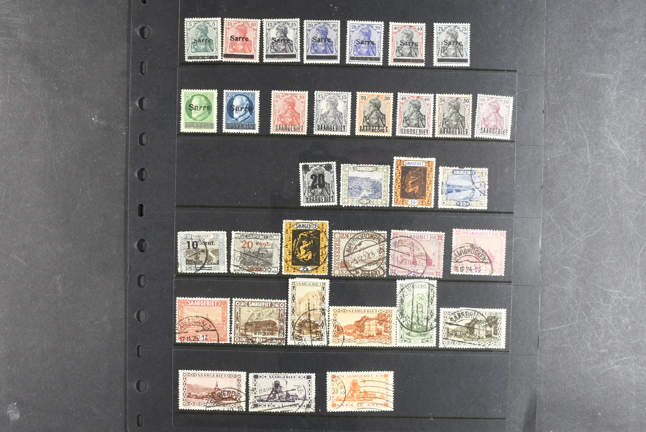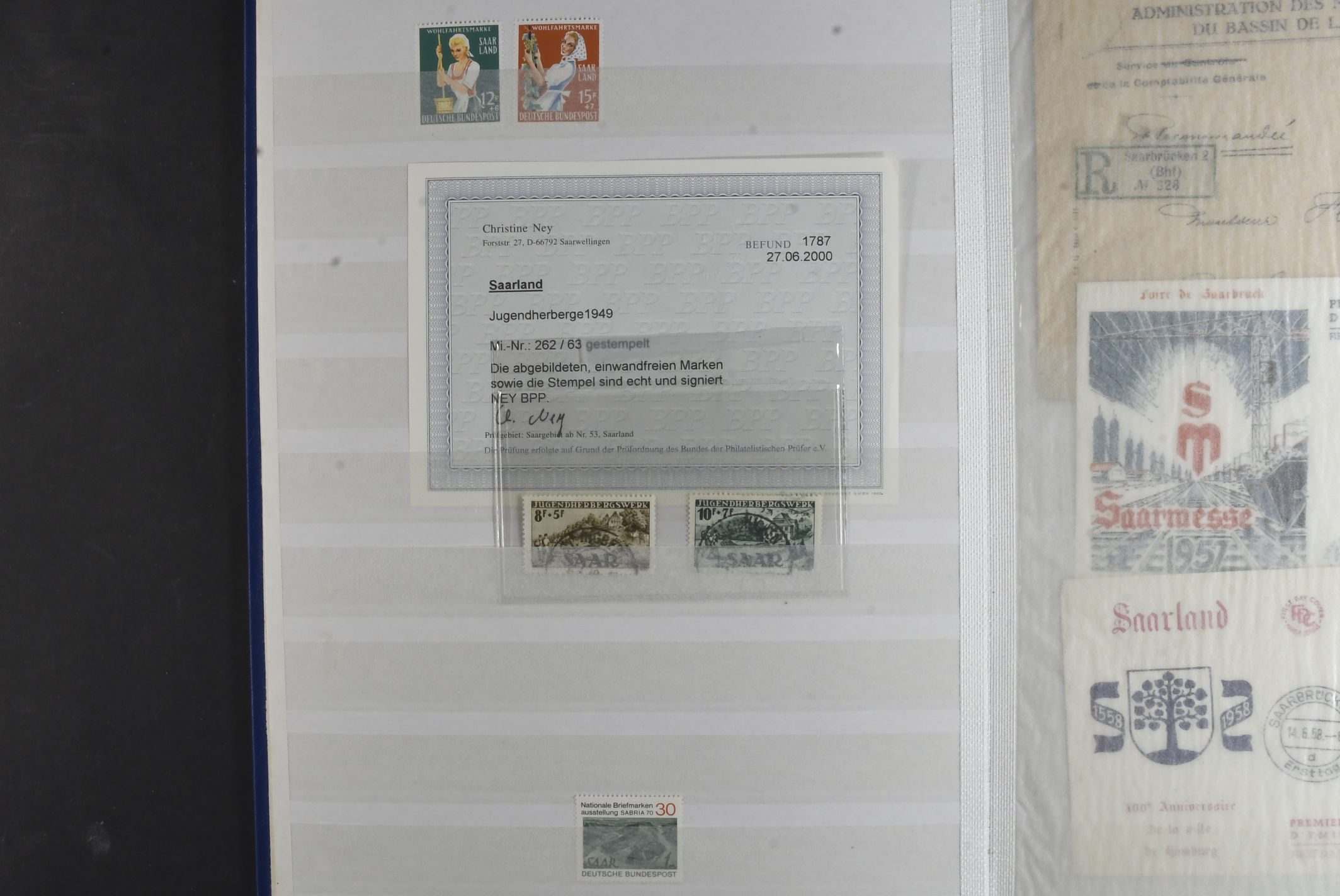 Germany, Saar. Collection/accumulation ★★/★/⊙ 1920–1955 in stockbook. Incl. all four periods (1920-35 under French governance, 1935-45 as a part of Reich, 1945-57 under French governance, 1957- as a part of GFR). Stockbook + two loose album leaves. Includes Saarland 262–63 o with opinion. See a number of images on www.philea.se. Fine quality. (>200)