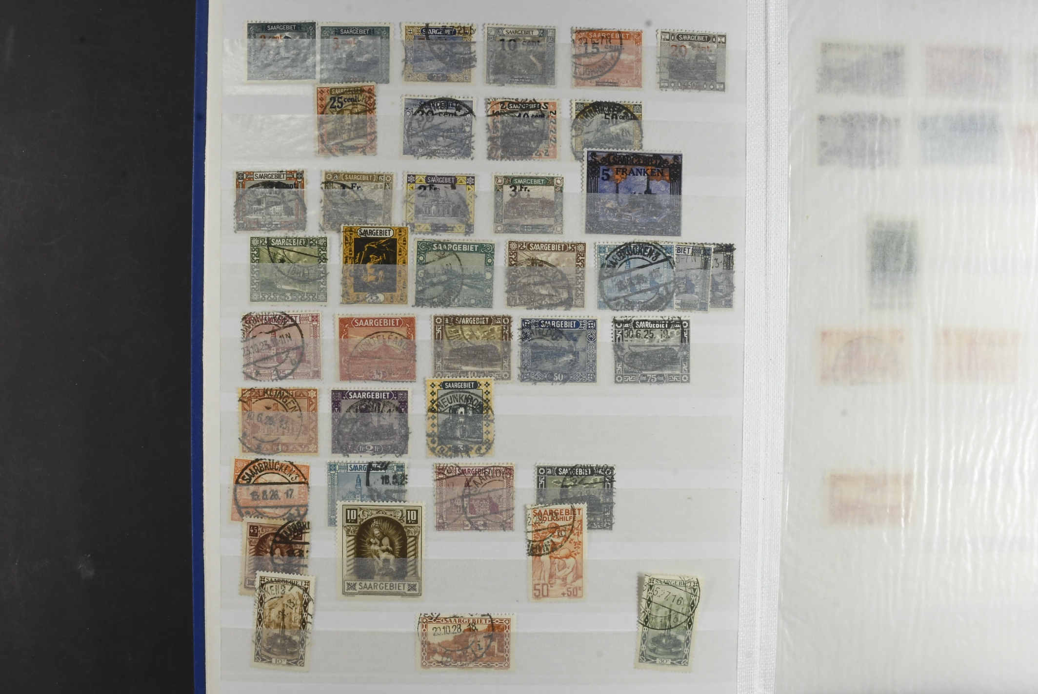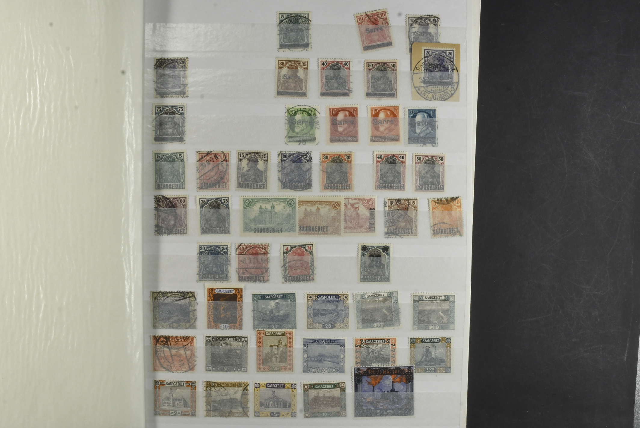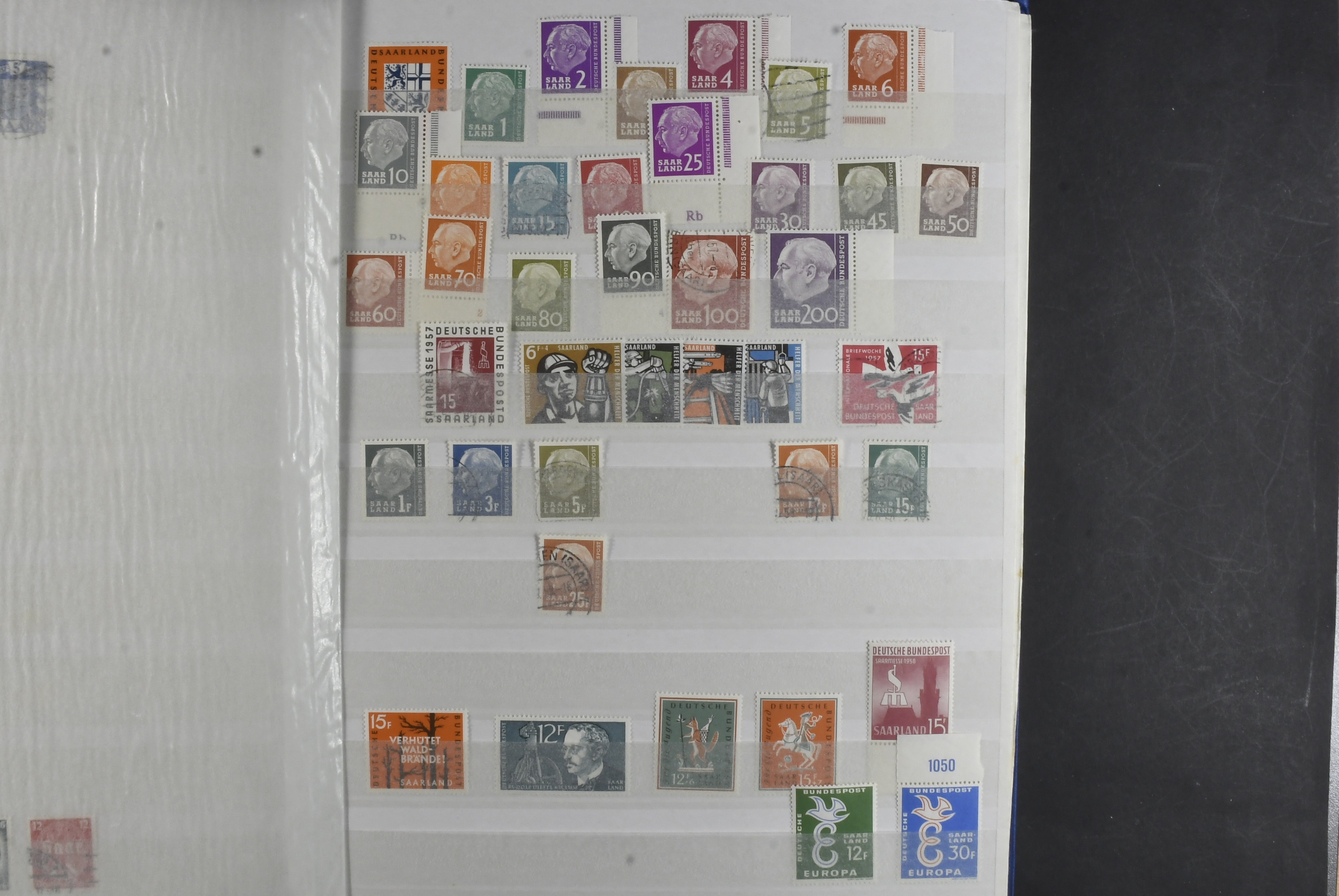 Germany, Saar. Collection/accumulation ★★/★/⊙ 1920–1955 in stockbook. Incl. all four periods (1920-35 under French governance, 1935-45 as a part of Reich, 1945-57 under French governance, 1957- as a part of GFR). Stockbook + two loose album leaves. Includes Saarland 262–63 o with opinion. See a number of images on www.philea.se. Fine quality. (>200)