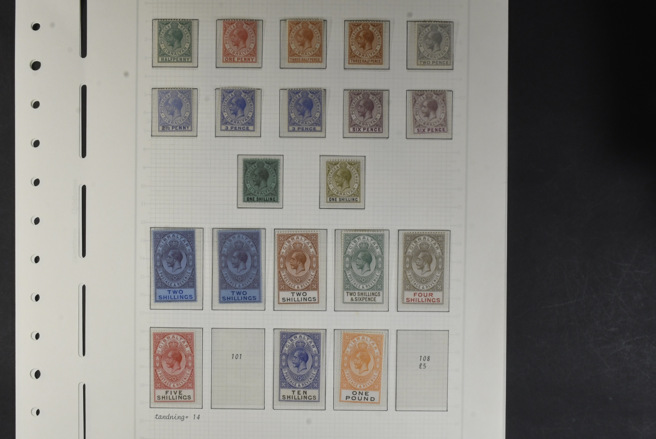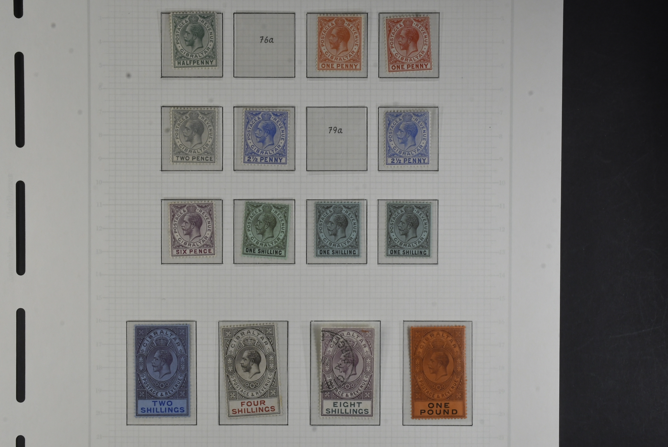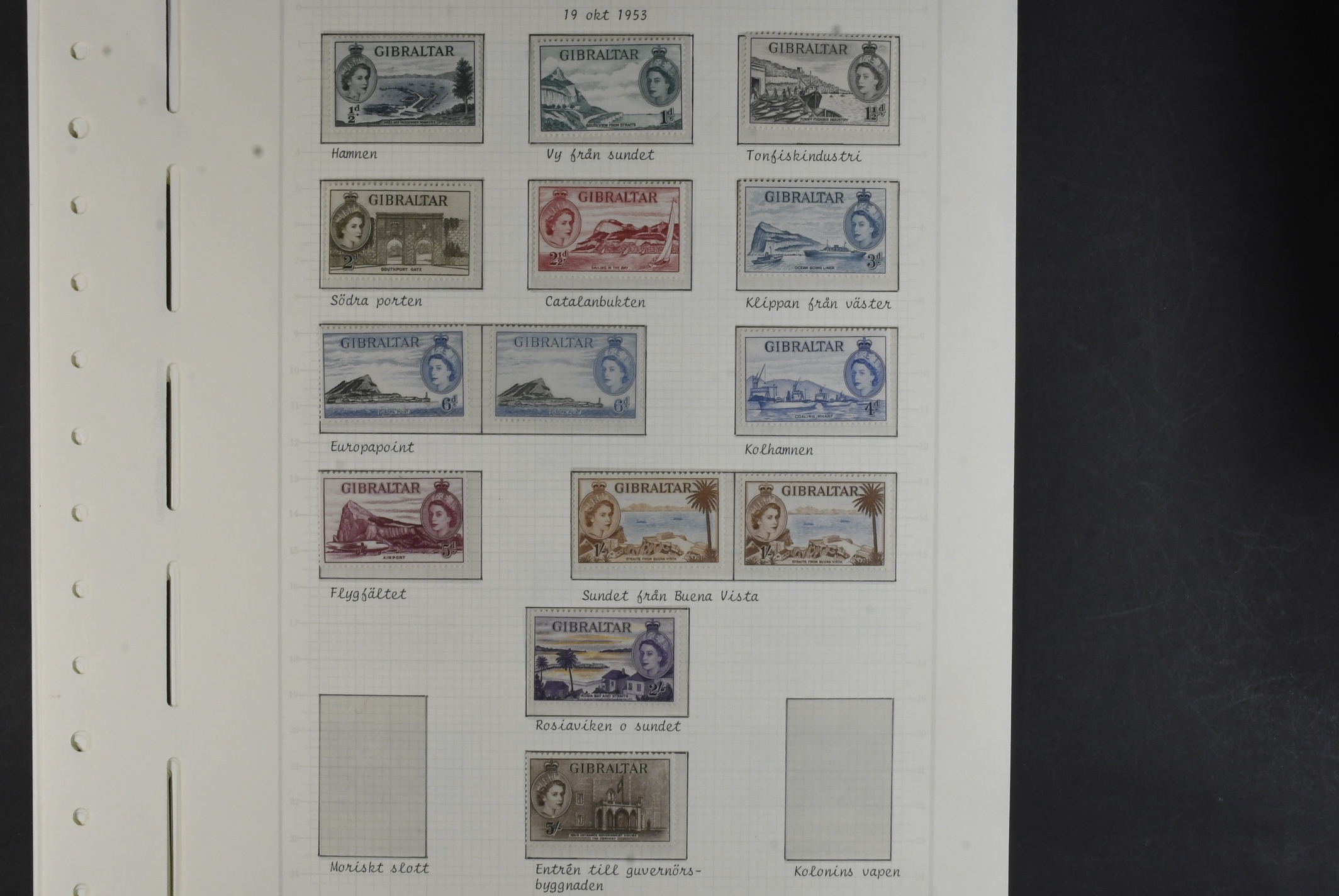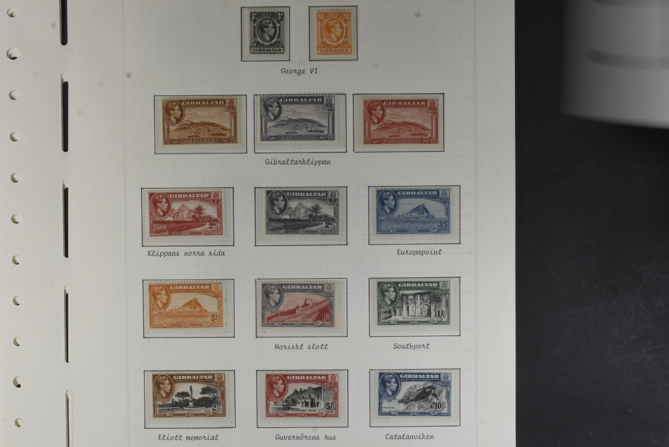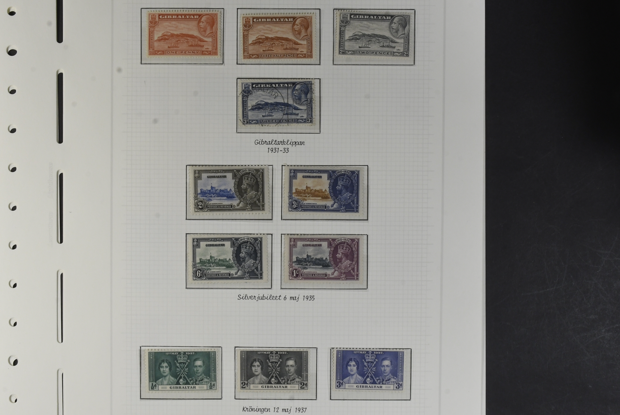 Gibraltar. Collection mostly ★ 1912–1953 on leaves with stamp mounts. KGV–QEII with several £ values. incl. SG 83 *, 84 ¤, 85 *, 100 *, 107 *, 121–131 *. The entire lot is presented at www.philea.se. Mostly fine quality. (72)
