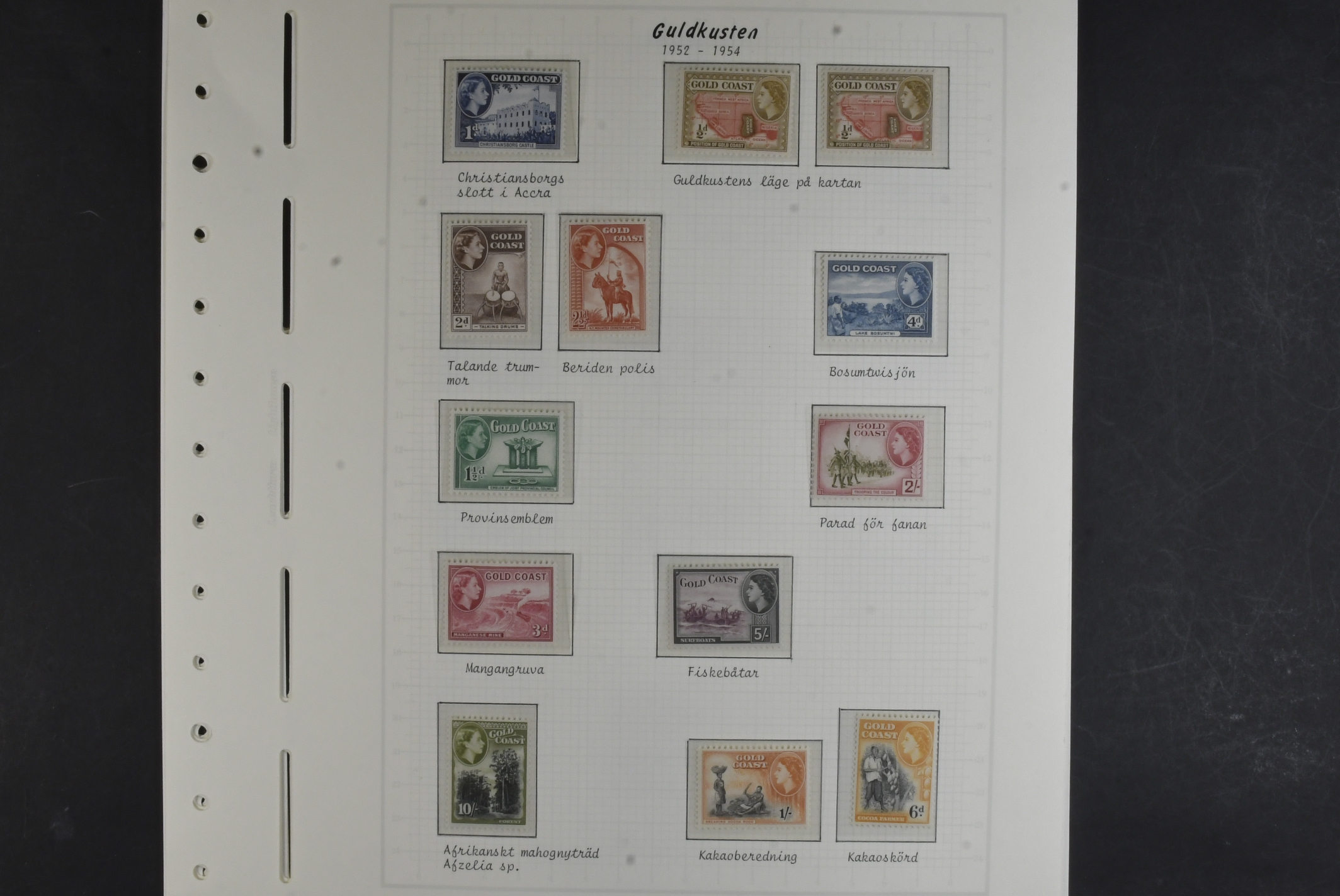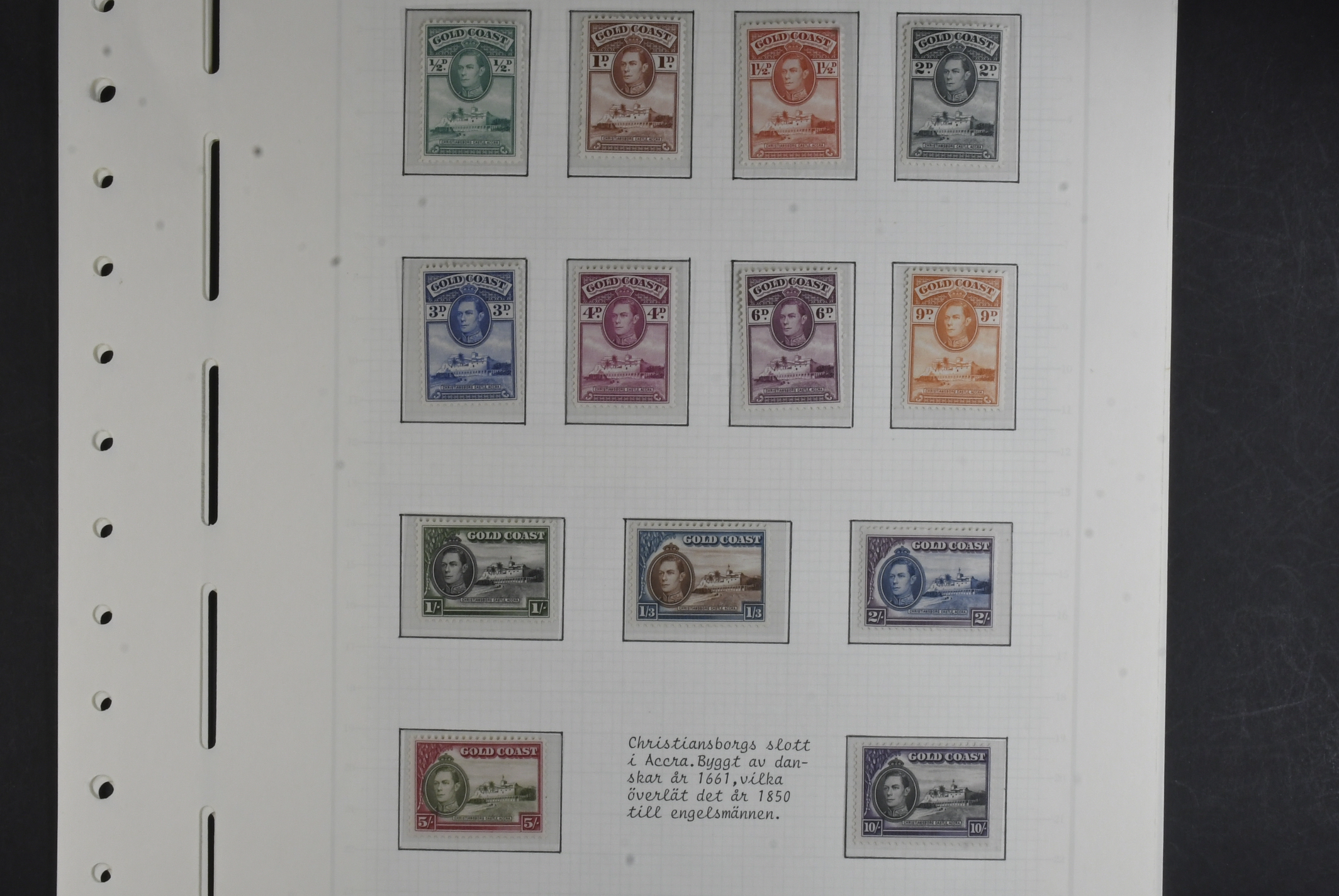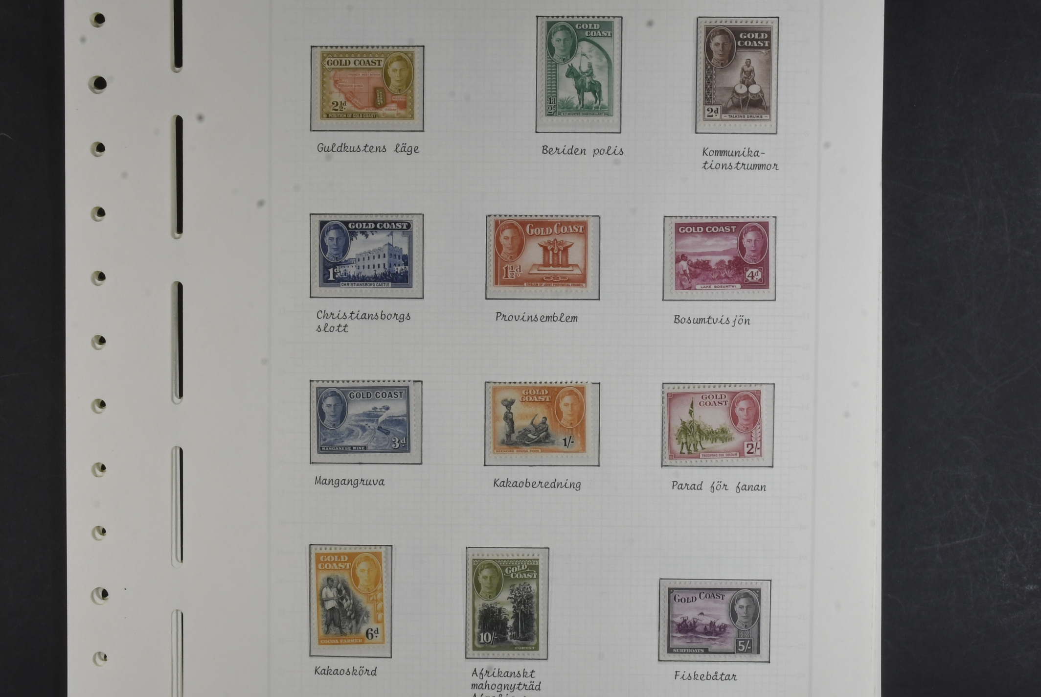 Gold Coast. Collection ★★/★ 1938–1953 on leaves with stamp mounts. KGV, KGVI and QEII with long sets 103–112 *, 120a–132 *, 135–146 *, 153–164 ** and four covers. The entire lot is presented at www.philea.se. Mostly fine quality. (58)