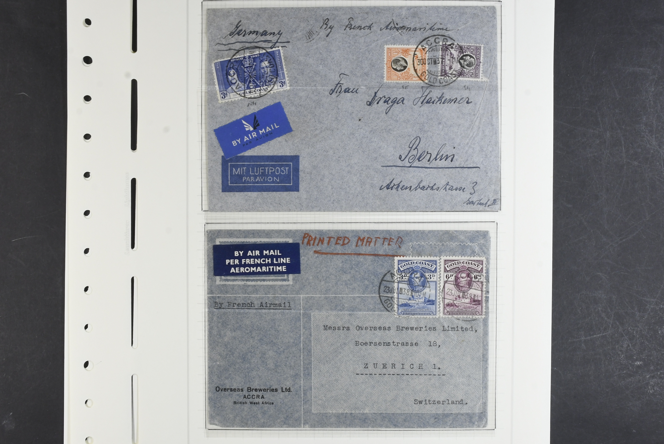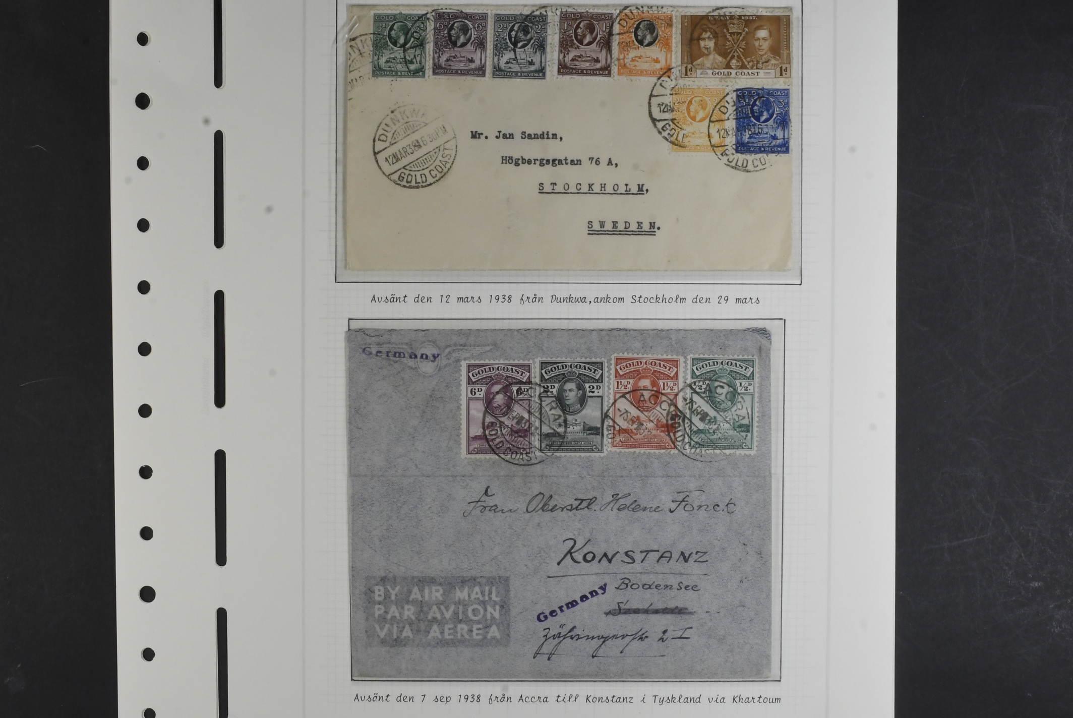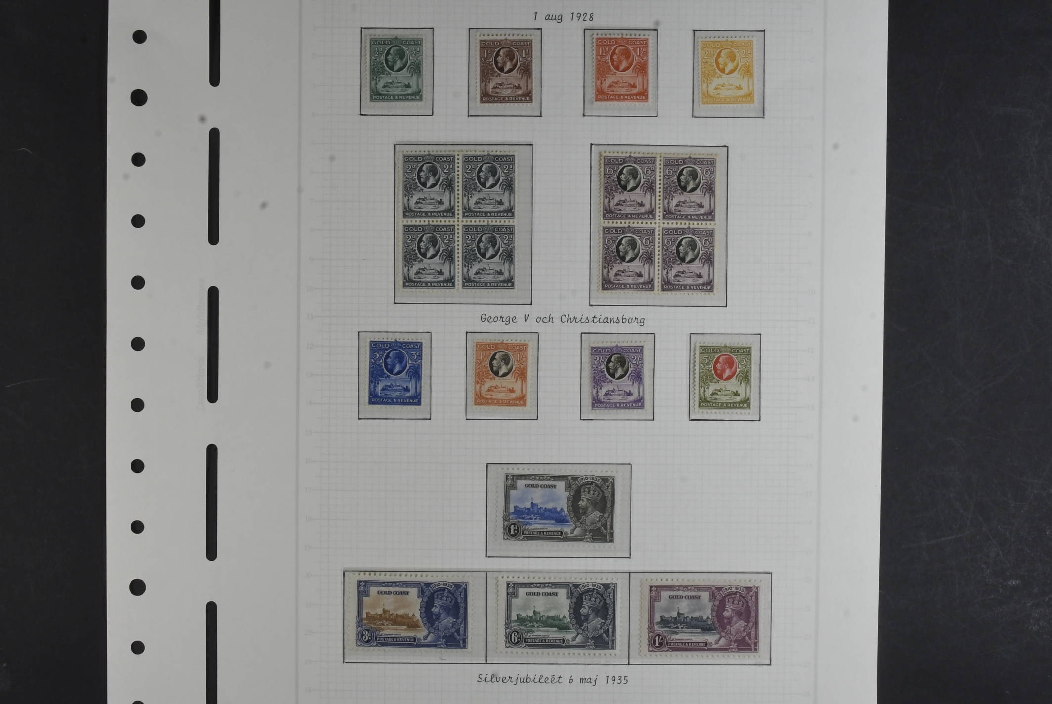 Gold Coast. Collection ★★/★ 1938–1953 on leaves with stamp mounts. KGV, KGVI and QEII with long sets 103–112 *, 120a–132 *, 135–146 *, 153–164 ** and four covers. The entire lot is presented at www.philea.se. Mostly fine quality. (58)