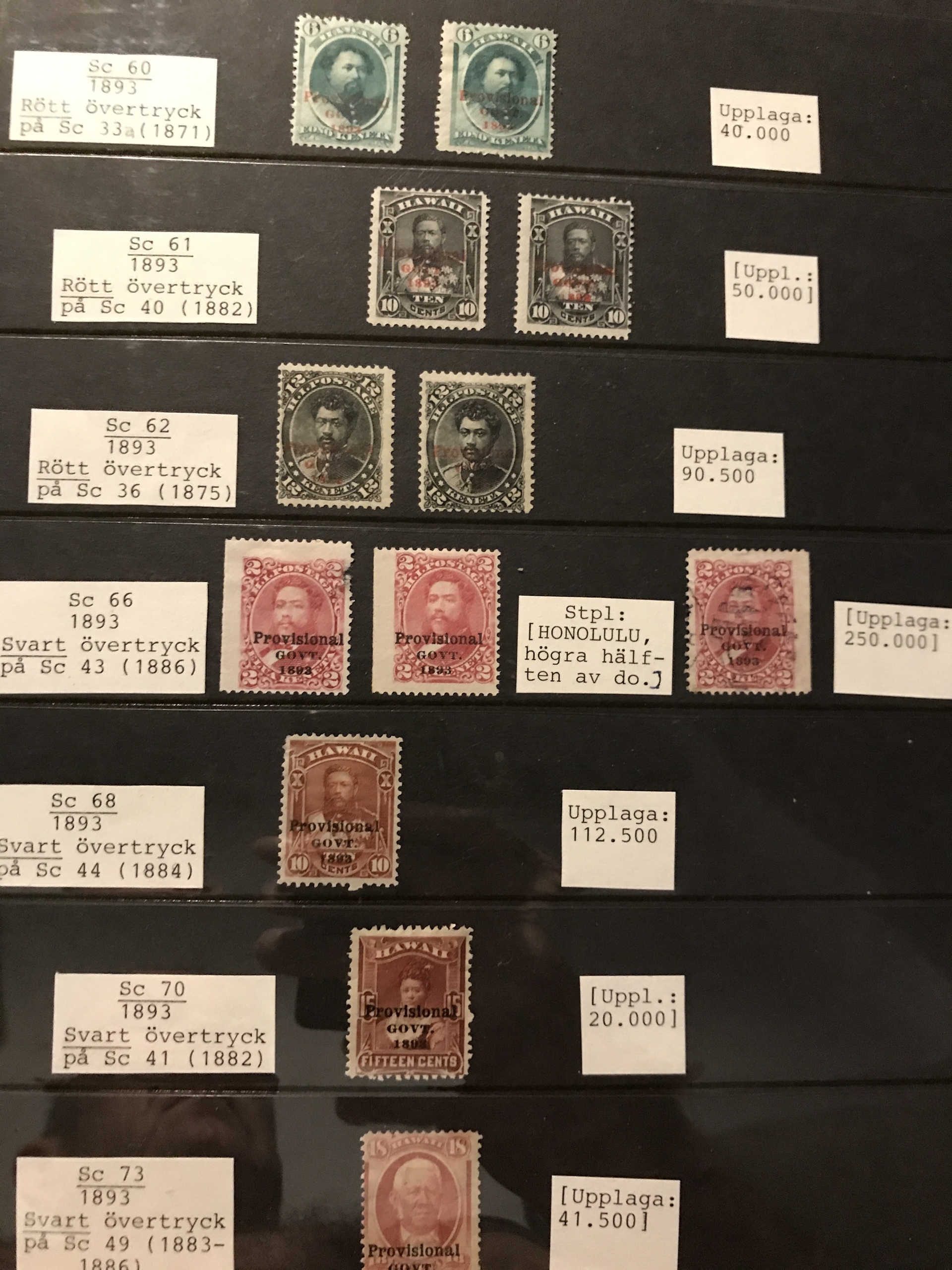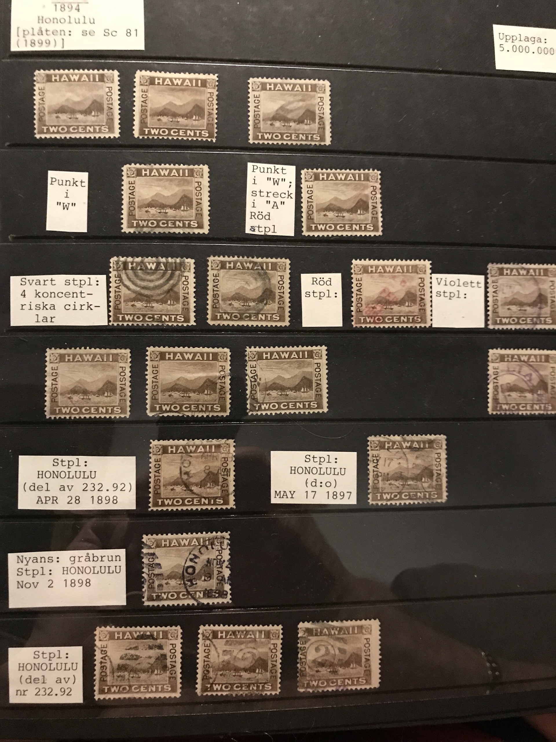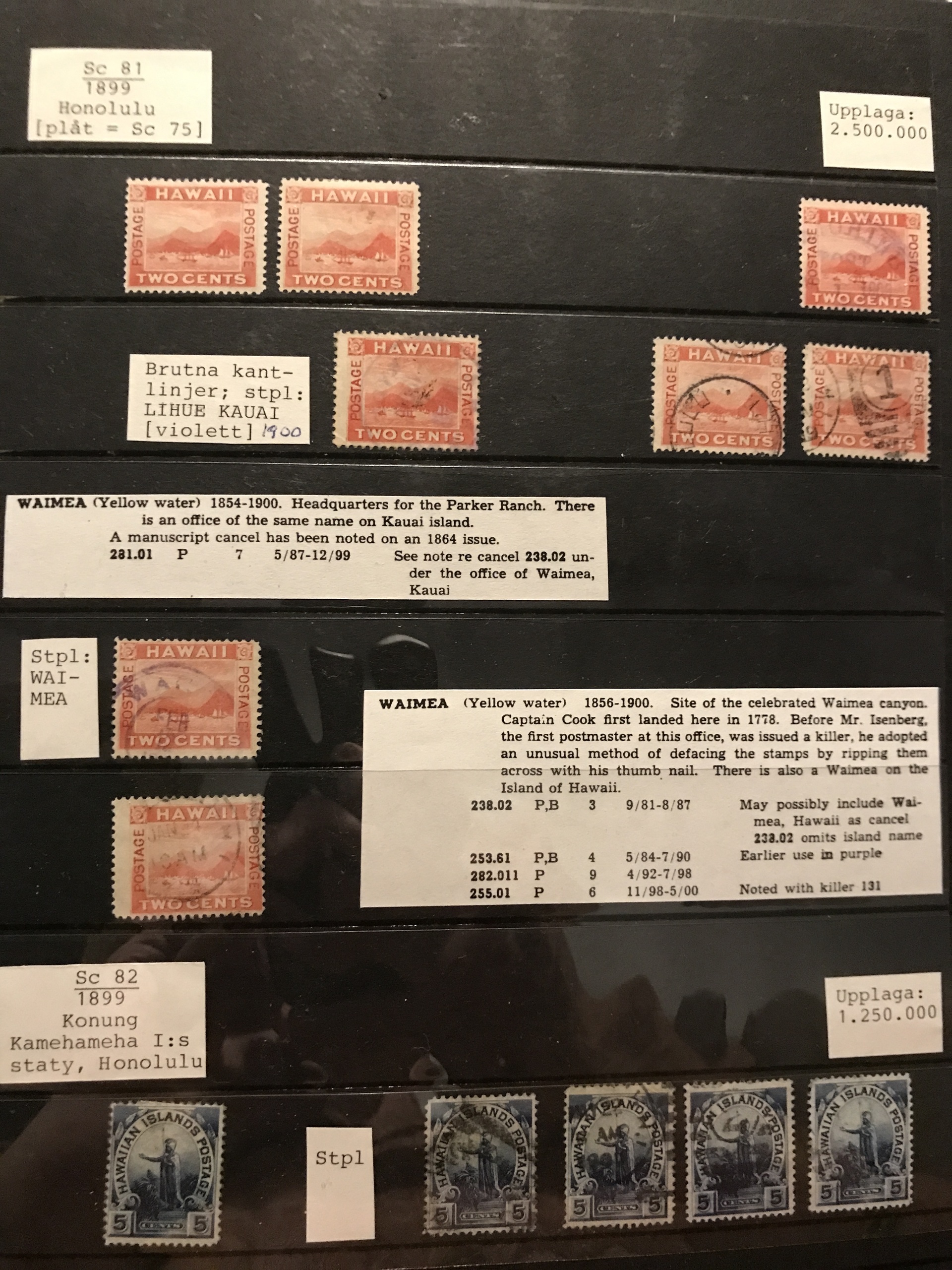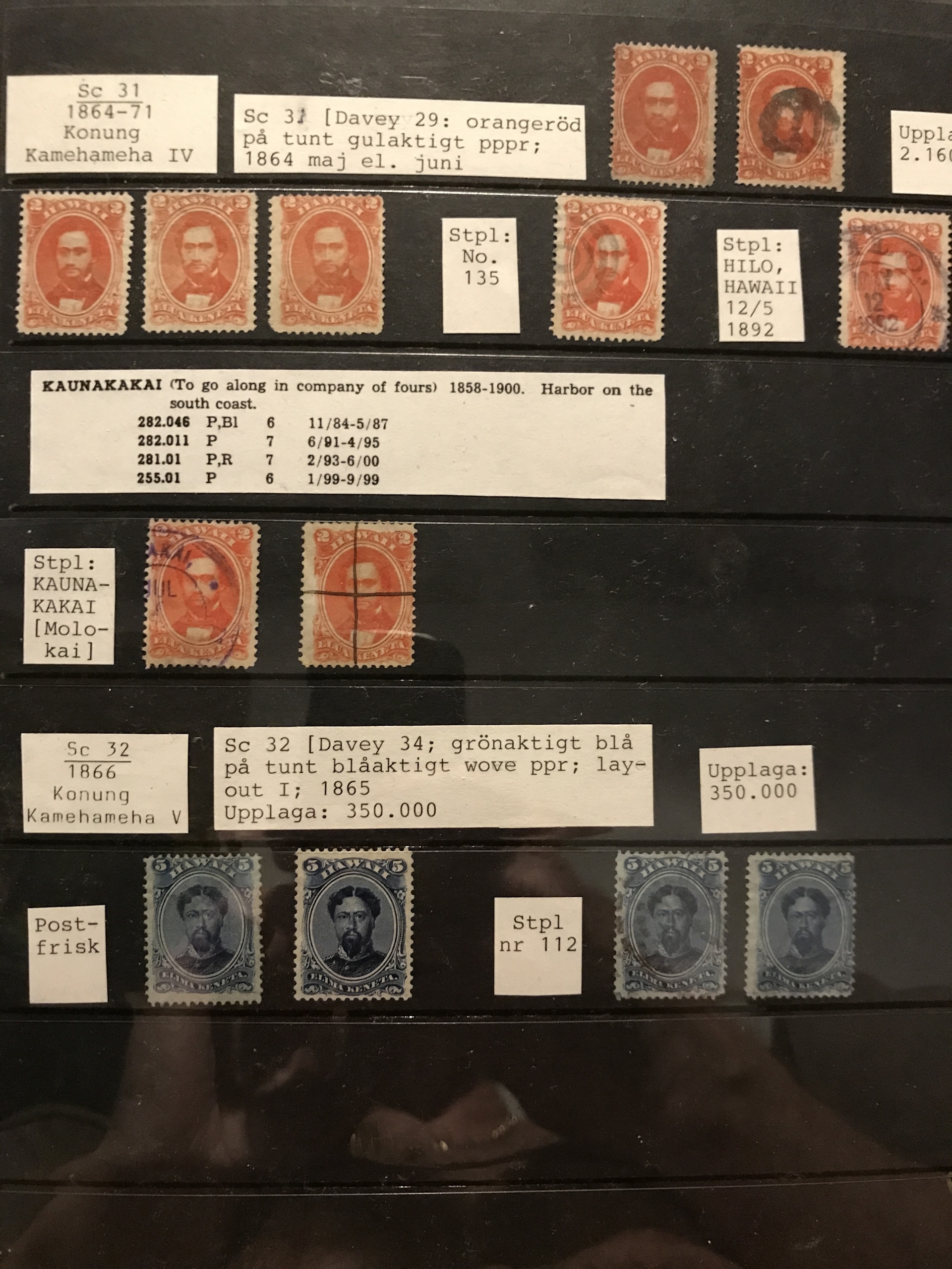 U.S.A., Hawaii. ★/⊙. Specialized collection 1868–99 in visir binder incl. dupl. and nine unused postal stationery items. Also some modern covers, etc. Please see a selection of scans at www.philea.se. (300)