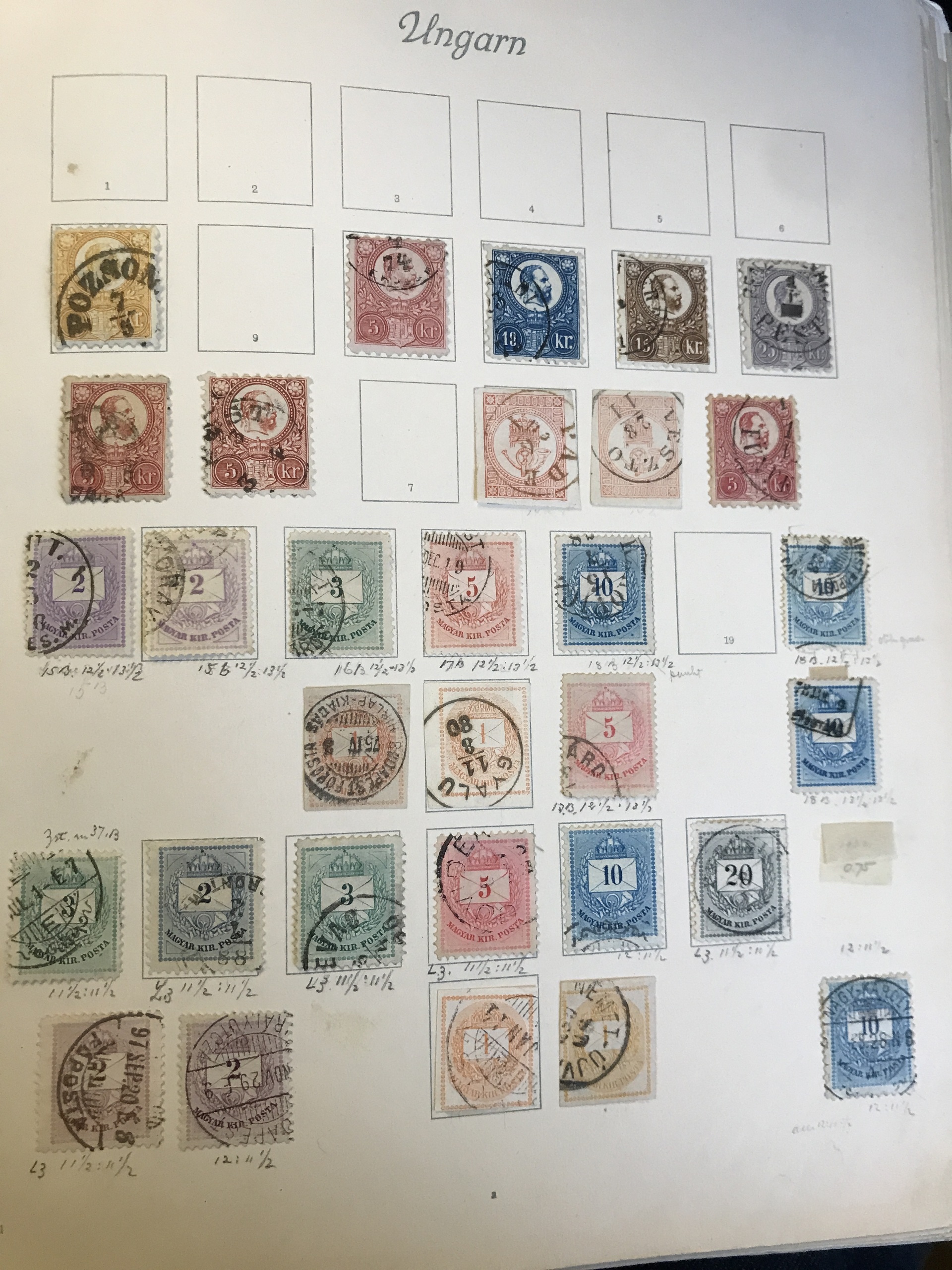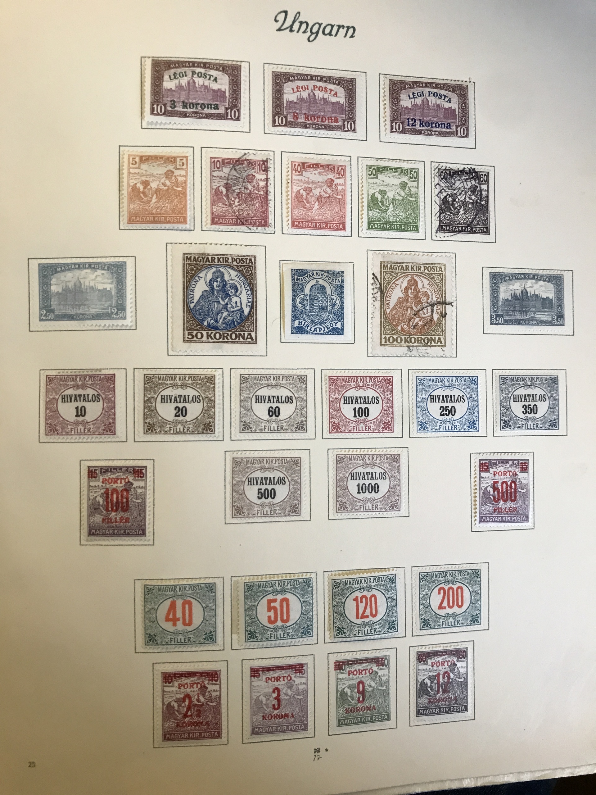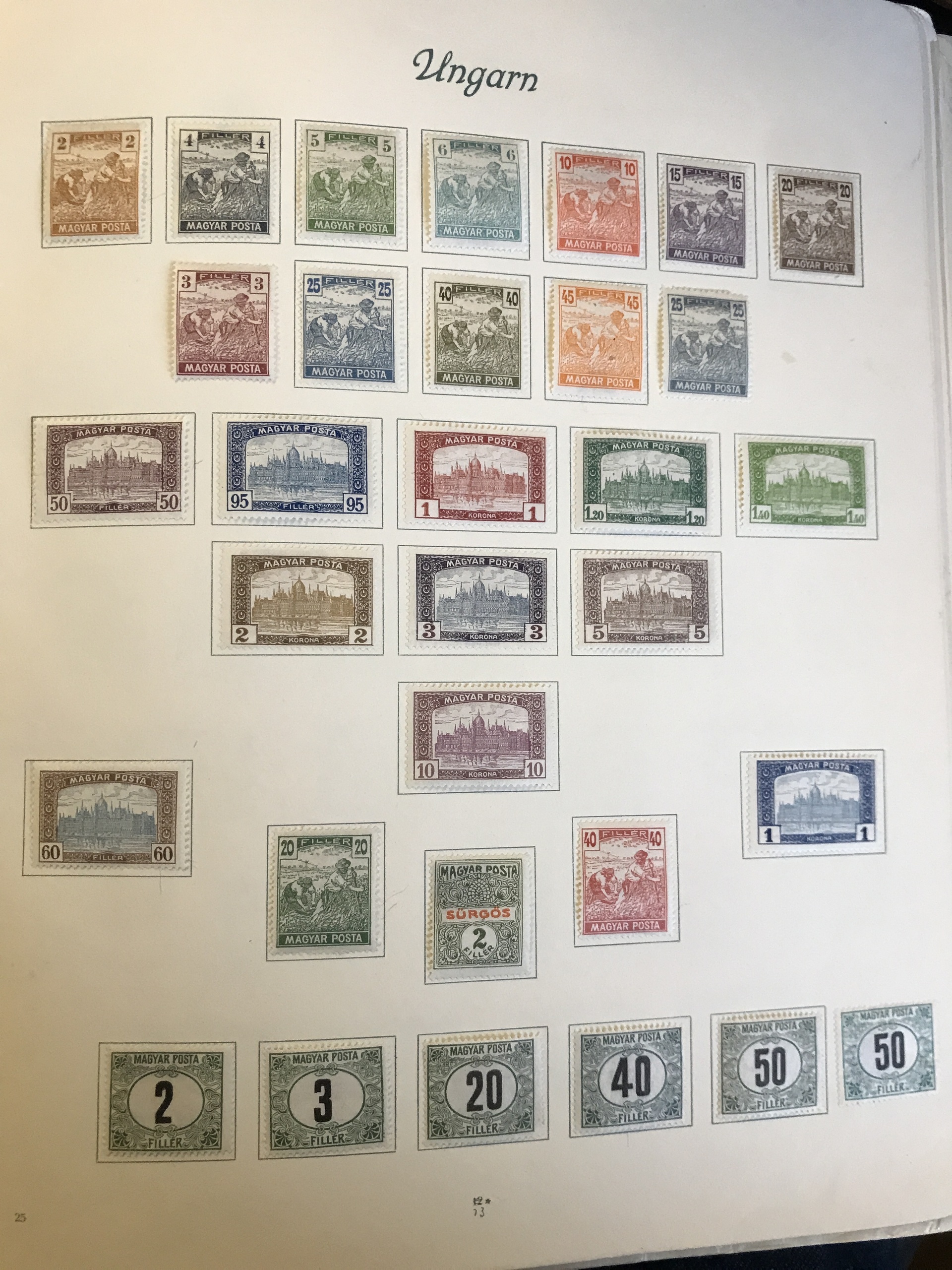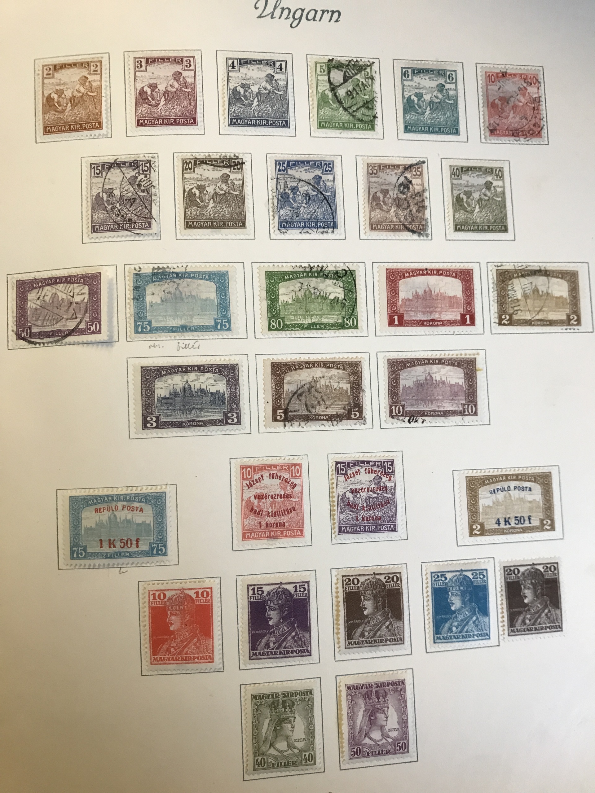 Hungary. ★/⊙. Old collection 1871–1947 in album incl. e.g. eight Franz Josef issues, Mi478–79 and 484–87 used, back-of the book incl. French occupation and some Baranya, etc. Also some leaves with dupl. (>1000)