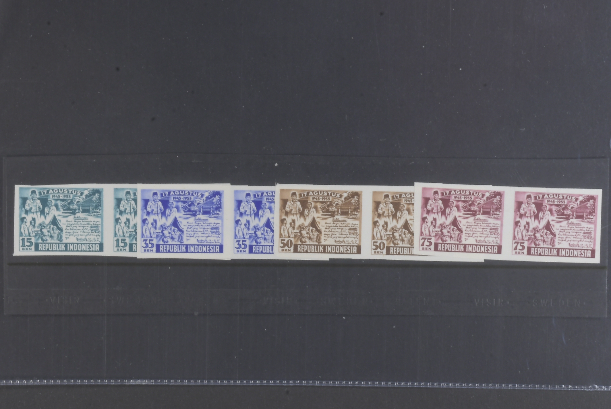 Indonesia. Michel 143–46 ★★, 1955 Republoc 10 years SET imperf proofs in pairs. Catalogue value €1500.