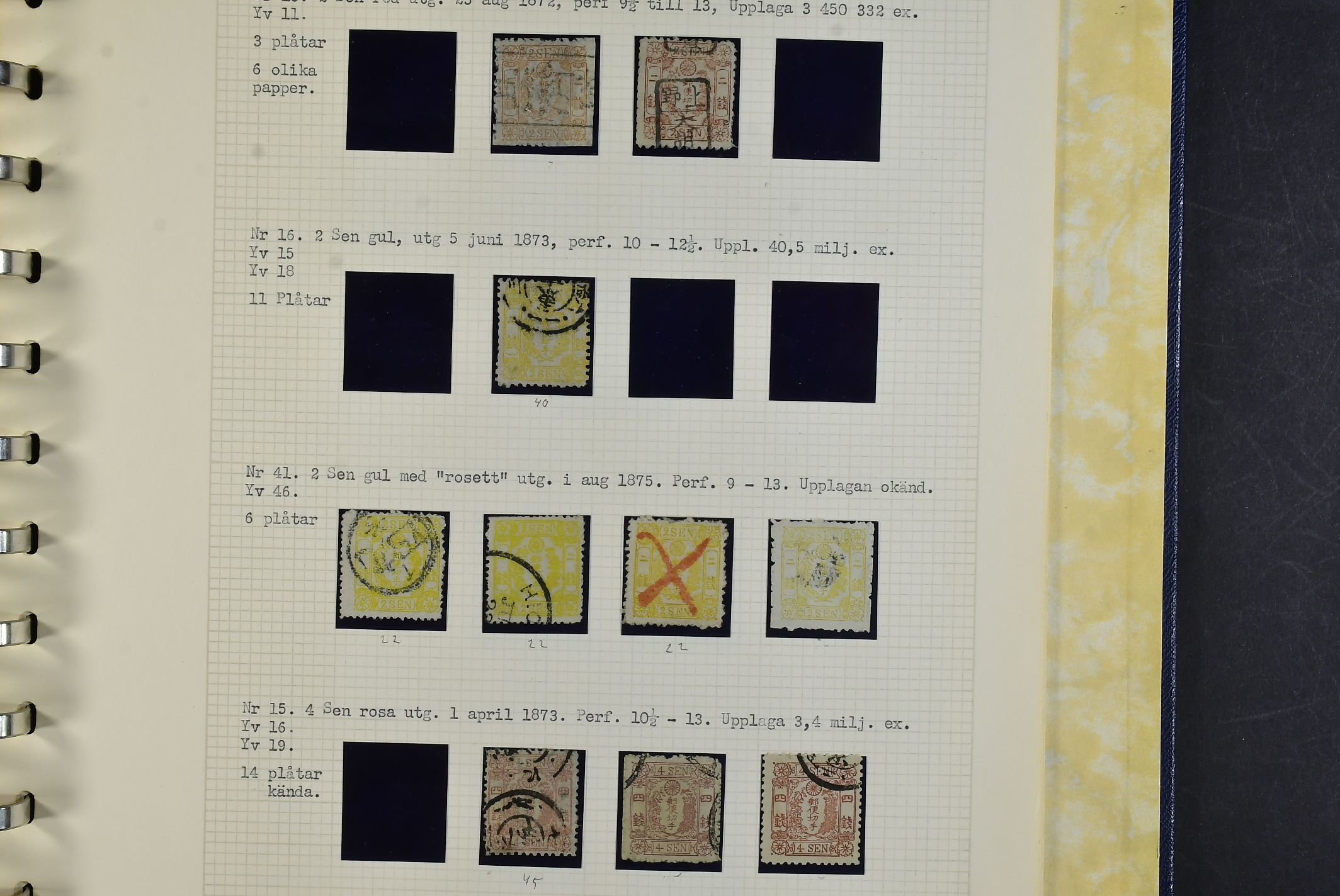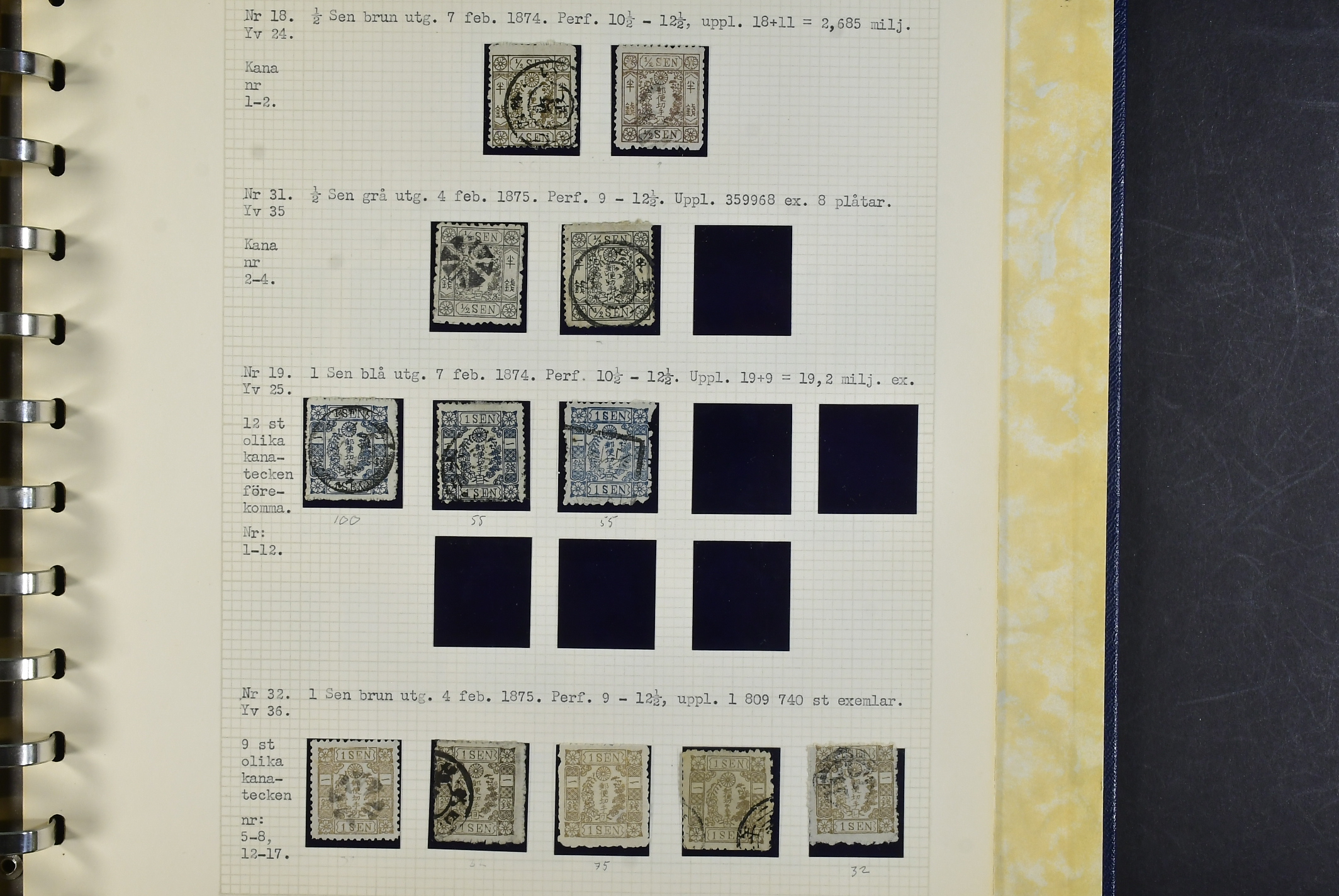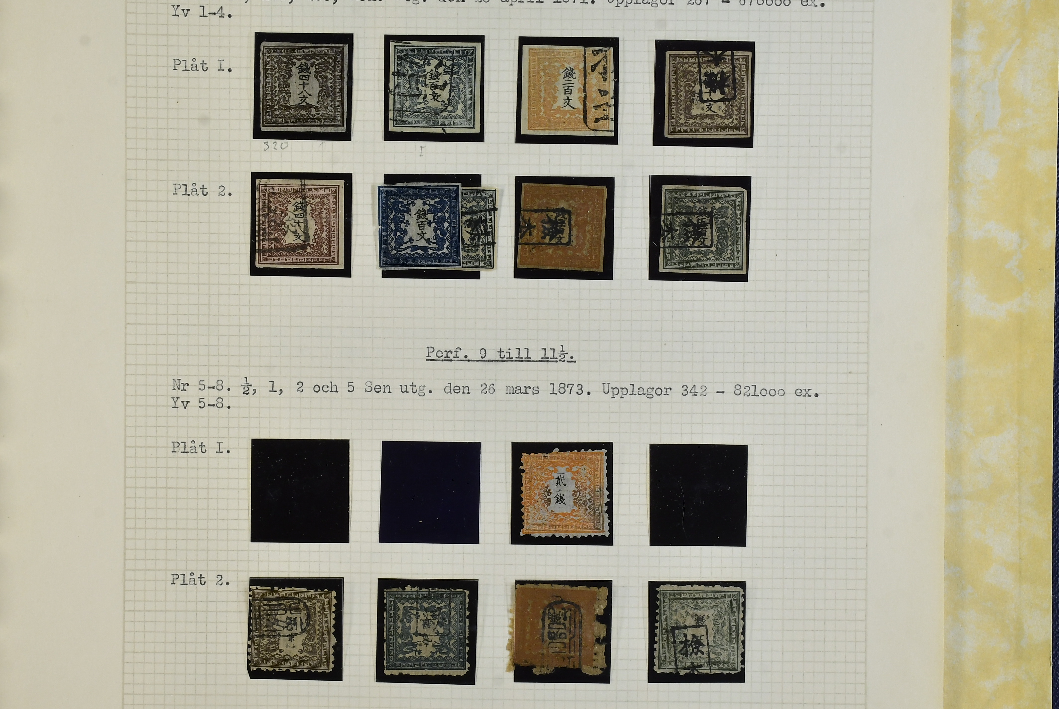 Japan. Collection used 1871–1875 in album. A few genuine stamps, Not many are marked forgeries. excellent study material. Inspection is recommended. The entire lot is presented at www.philea.se. Mostly good quality. (74)