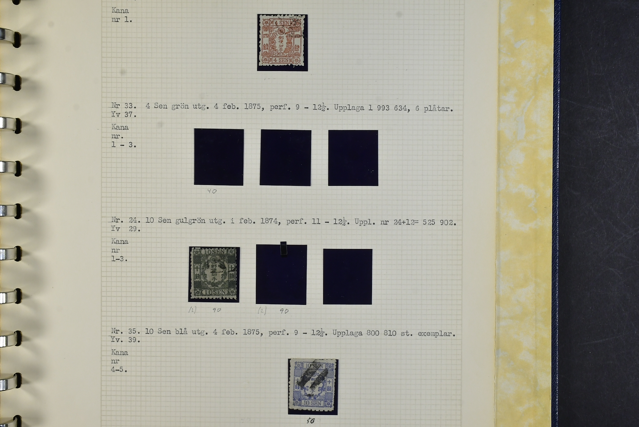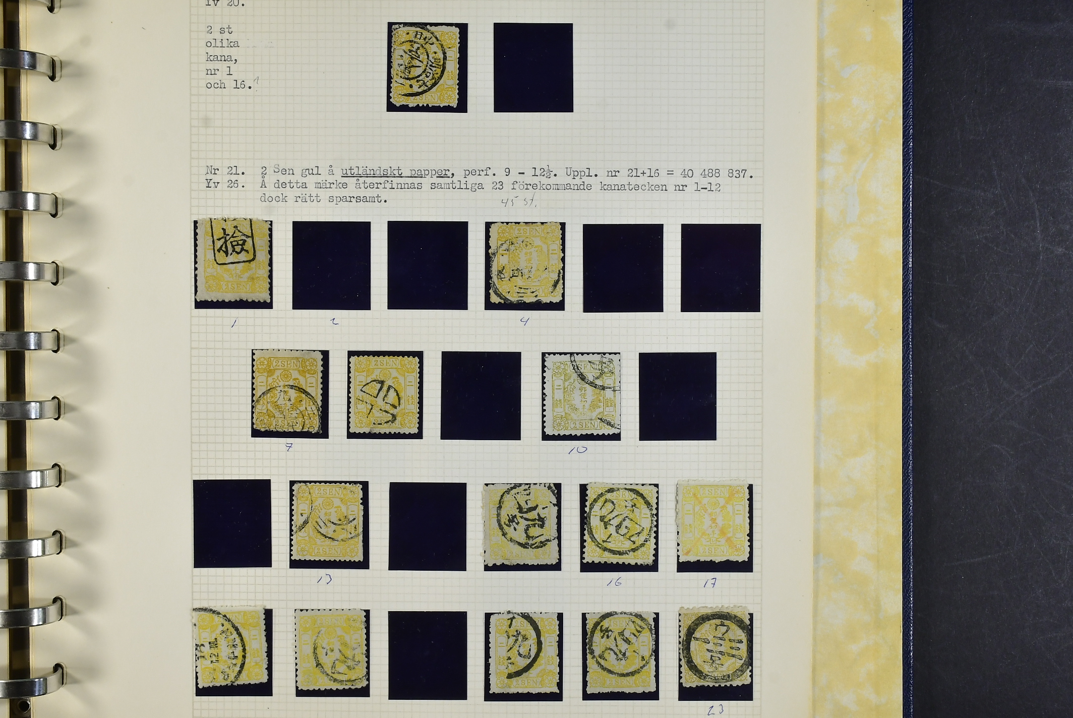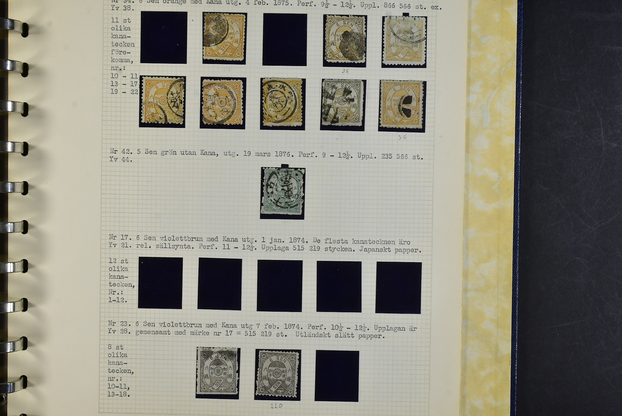Japan. Collection used 1871–1875 in album. A few genuine stamps, Not many are marked forgeries. excellent study material. Inspection is recommended. The entire lot is presented at www.philea.se. Mostly good quality. (74)