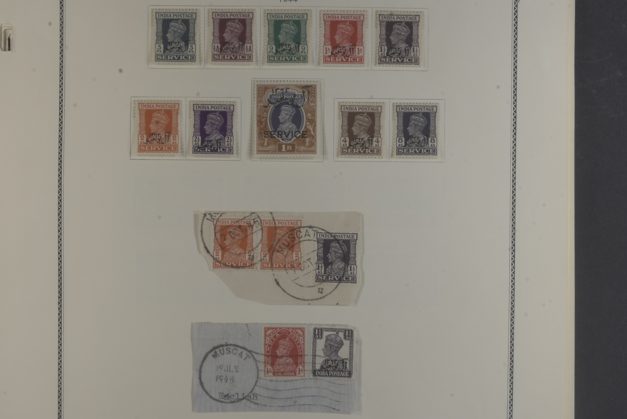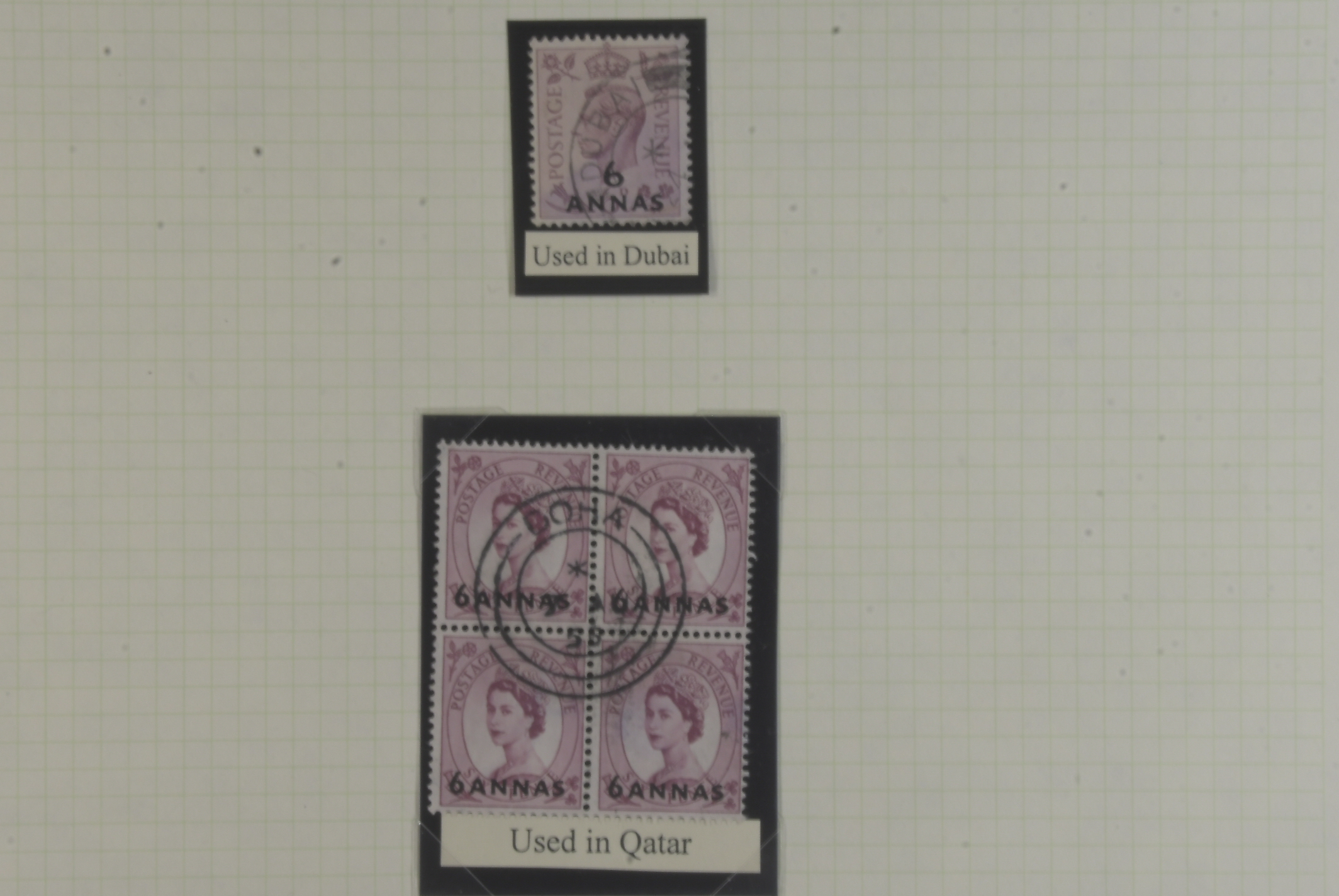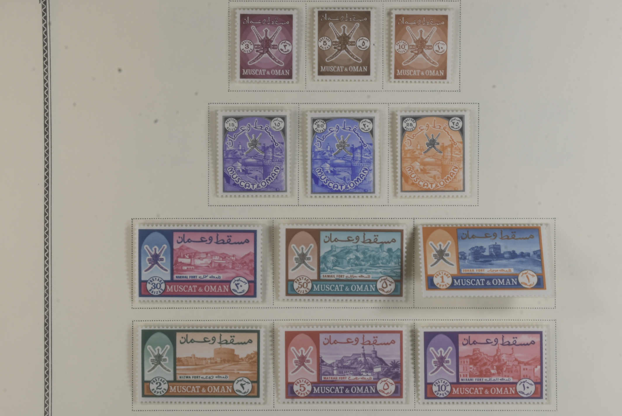 Kuwait. Collection mostly ★★ 1944–66 on seven leaves. comprehensive collection KGVI virtually complete, QEII overwhelmingly MNH inc different o/ps on the castles. Fascinating Muscat KGVI 6a and block of 4 QEII 6a used in Doha, Qatar, also seldom seen 1969 Oman set complete etc. Good quality.