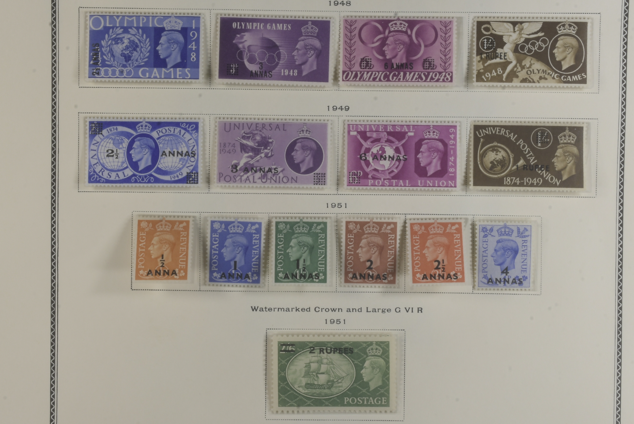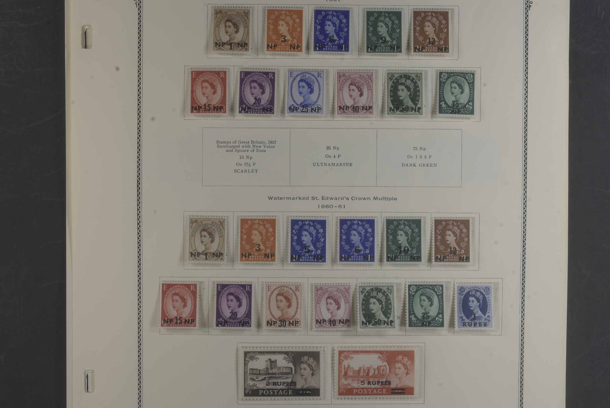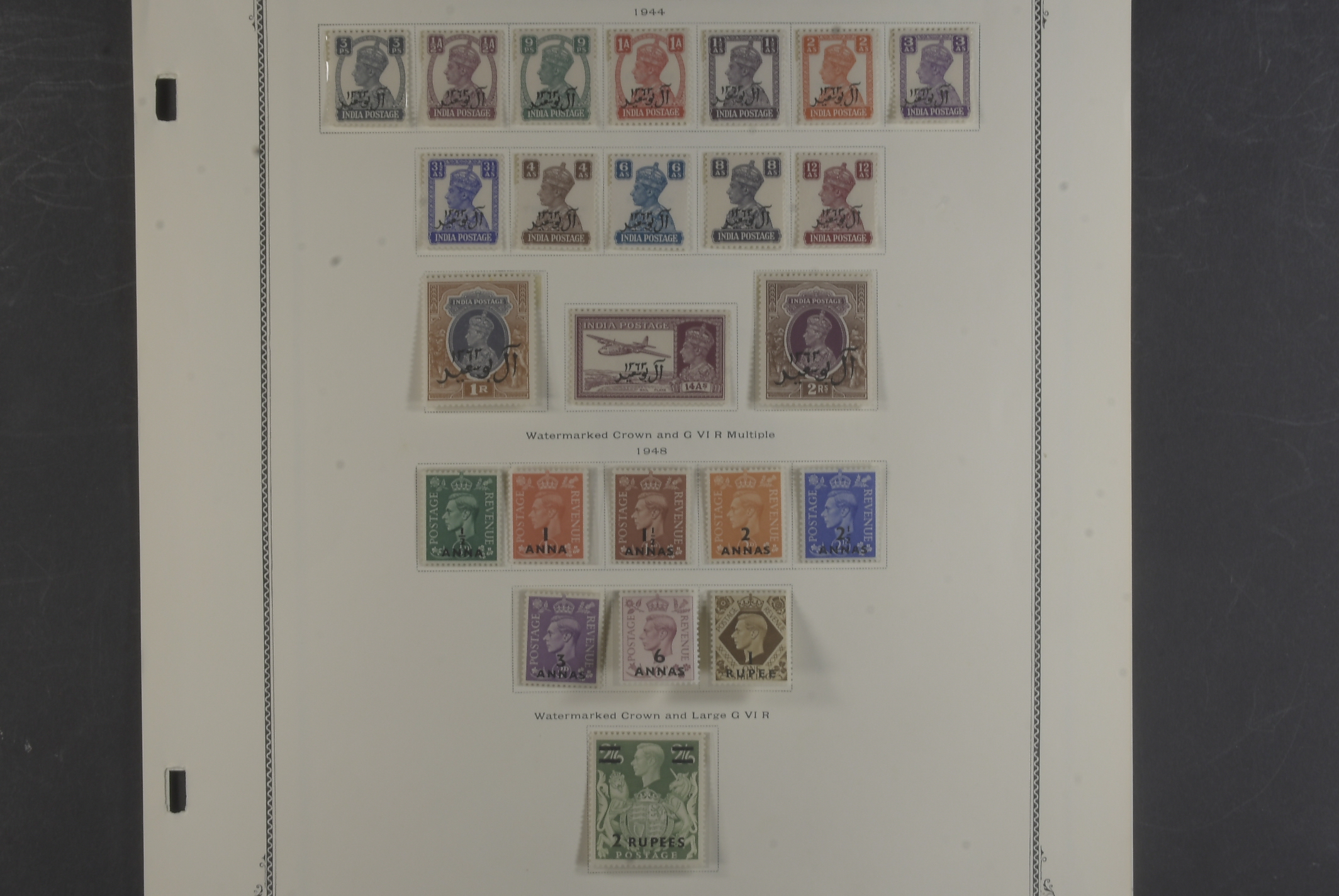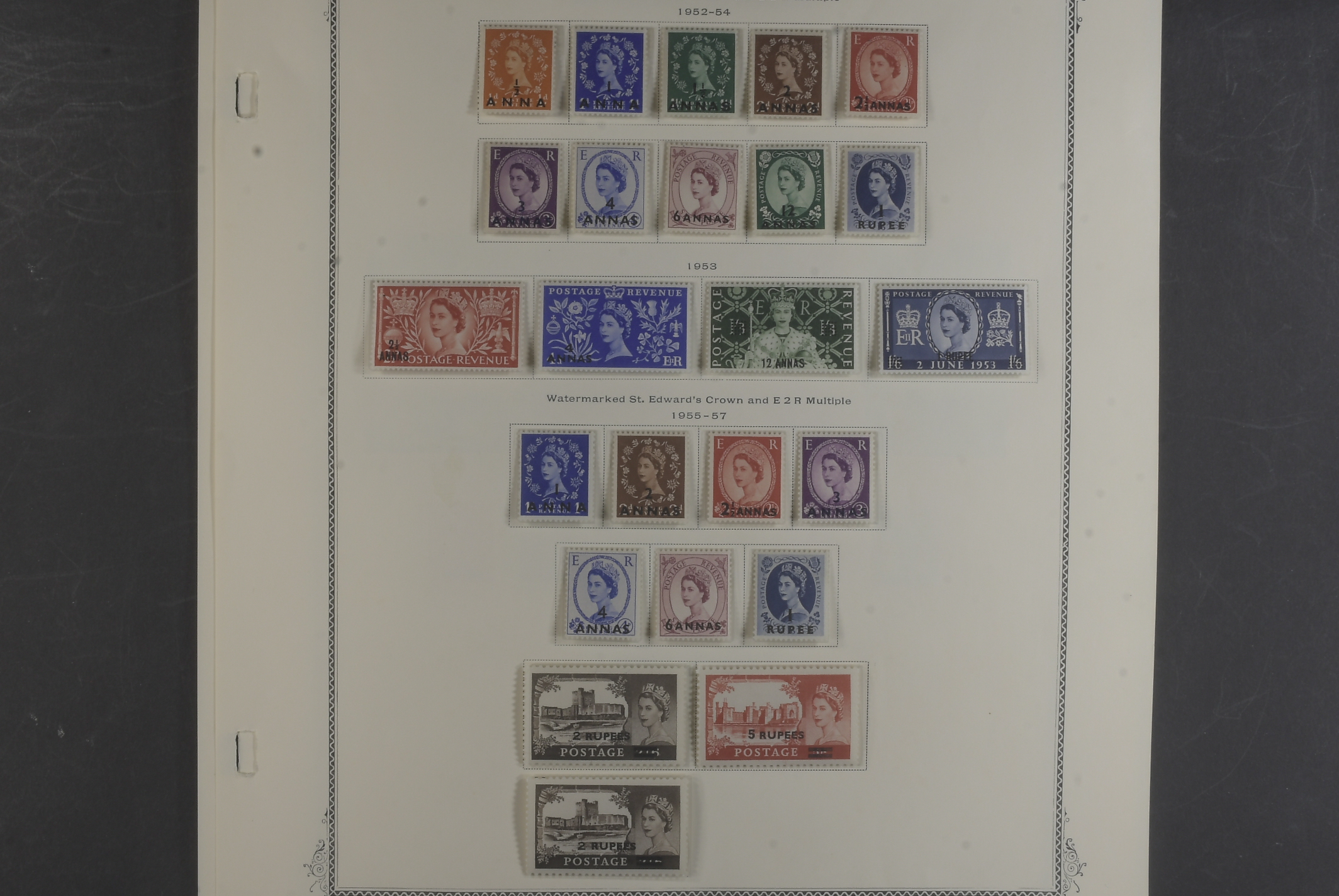 Kuwait. Collection mostly ★★ 1944–66 on seven leaves. comprehensive collection KGVI virtually complete, QEII overwhelmingly MNH inc different o/ps on the castles. Fascinating Muscat KGVI 6a and block of 4 QEII 6a used in Doha, Qatar, also seldom seen 1969 Oman set complete etc. Good quality.
