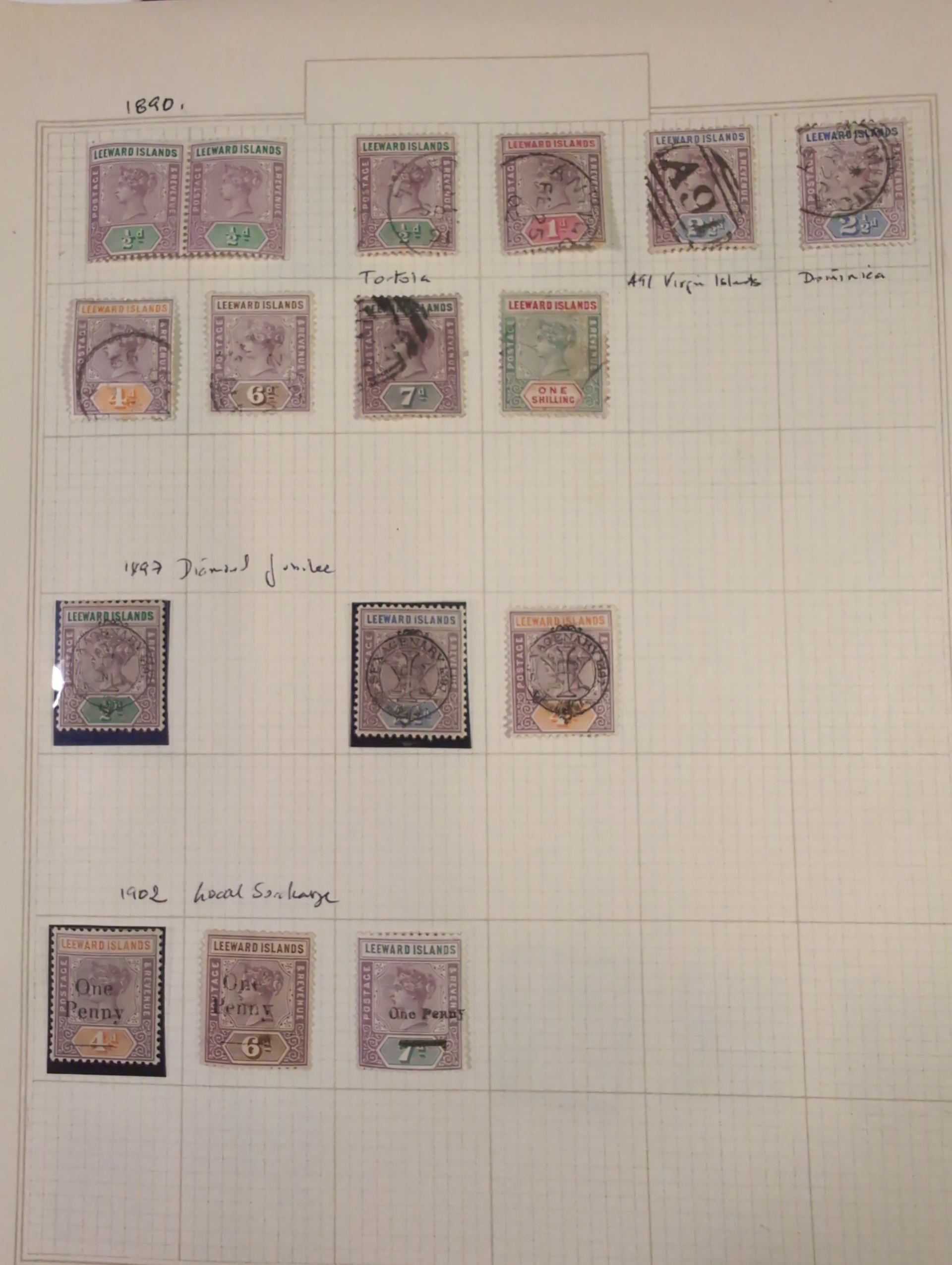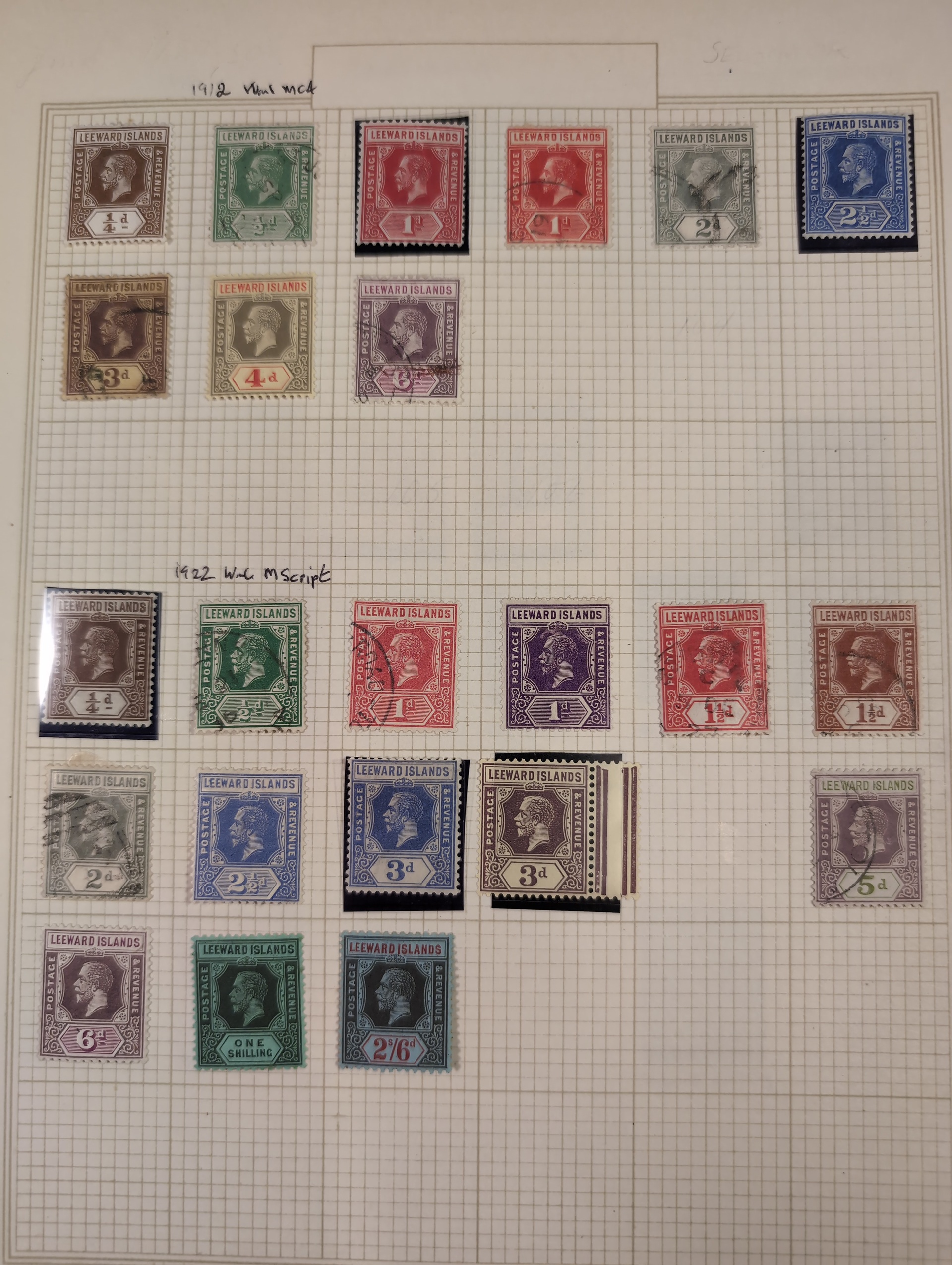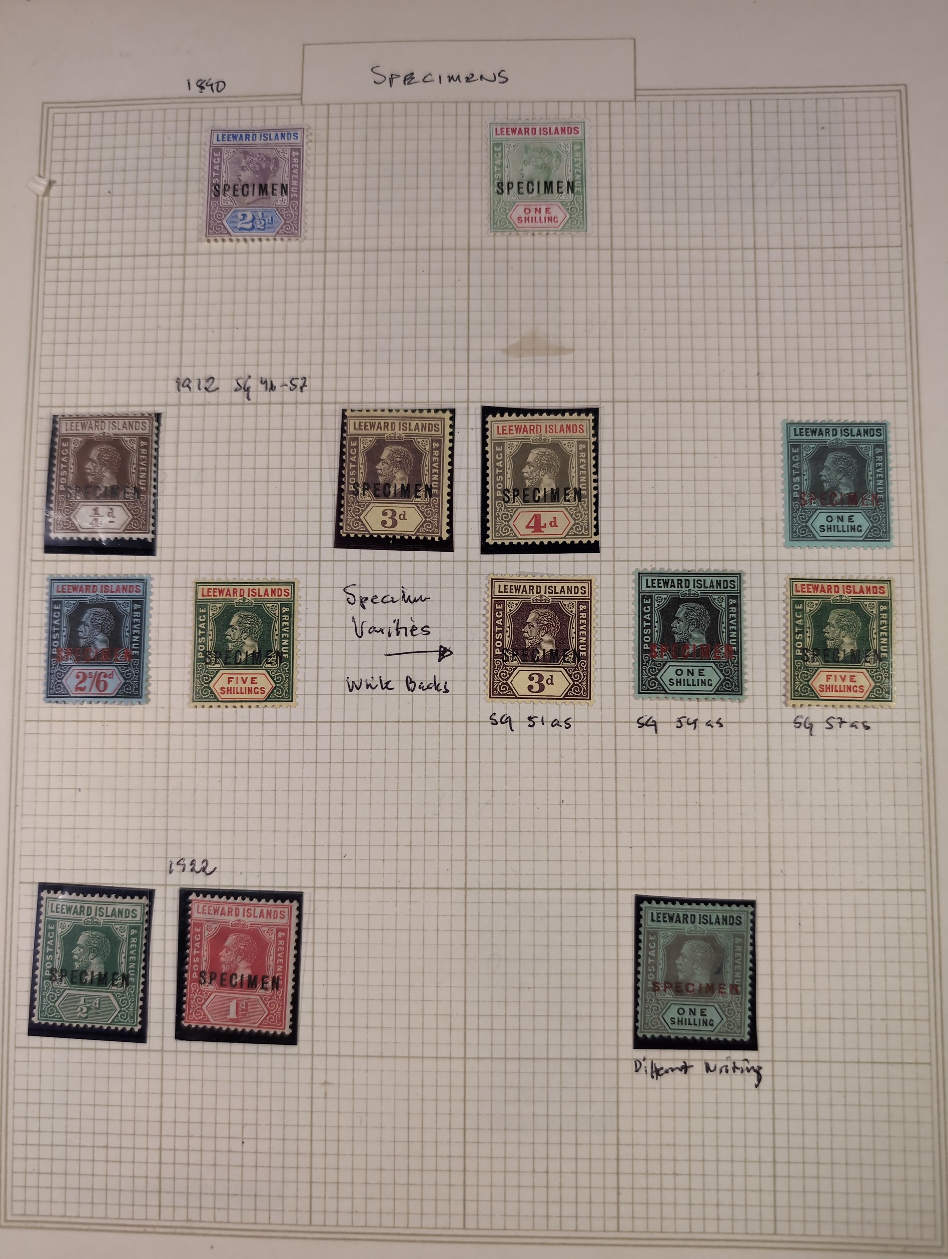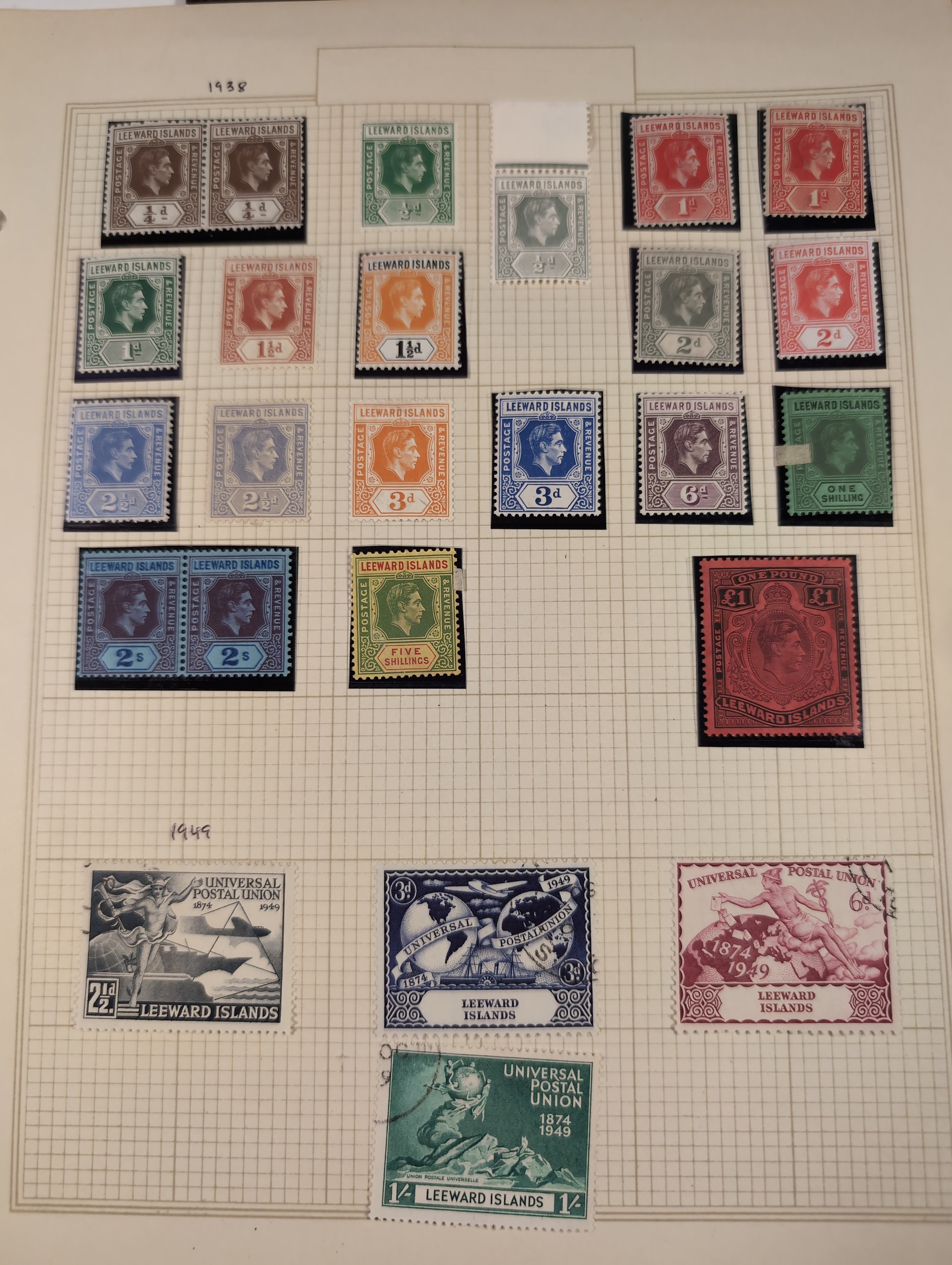 Leeward Islands. Collection ★/⊙ 1890–1949 on leaves. Incl. some better, KGVI up to £1 and one page with Specimen overprints. Please see a selection of scans at www.philea.se. Good quality. (80–100)