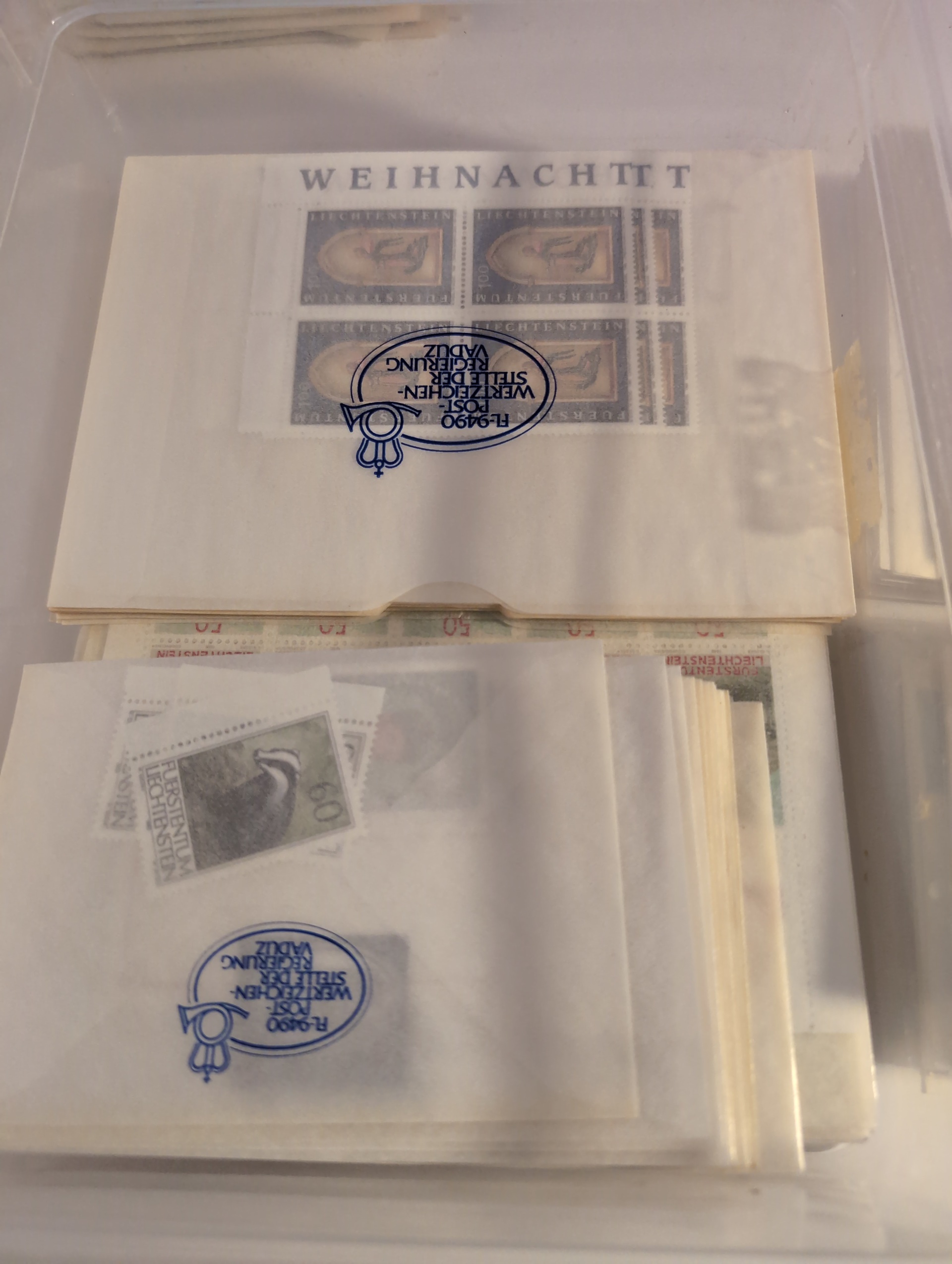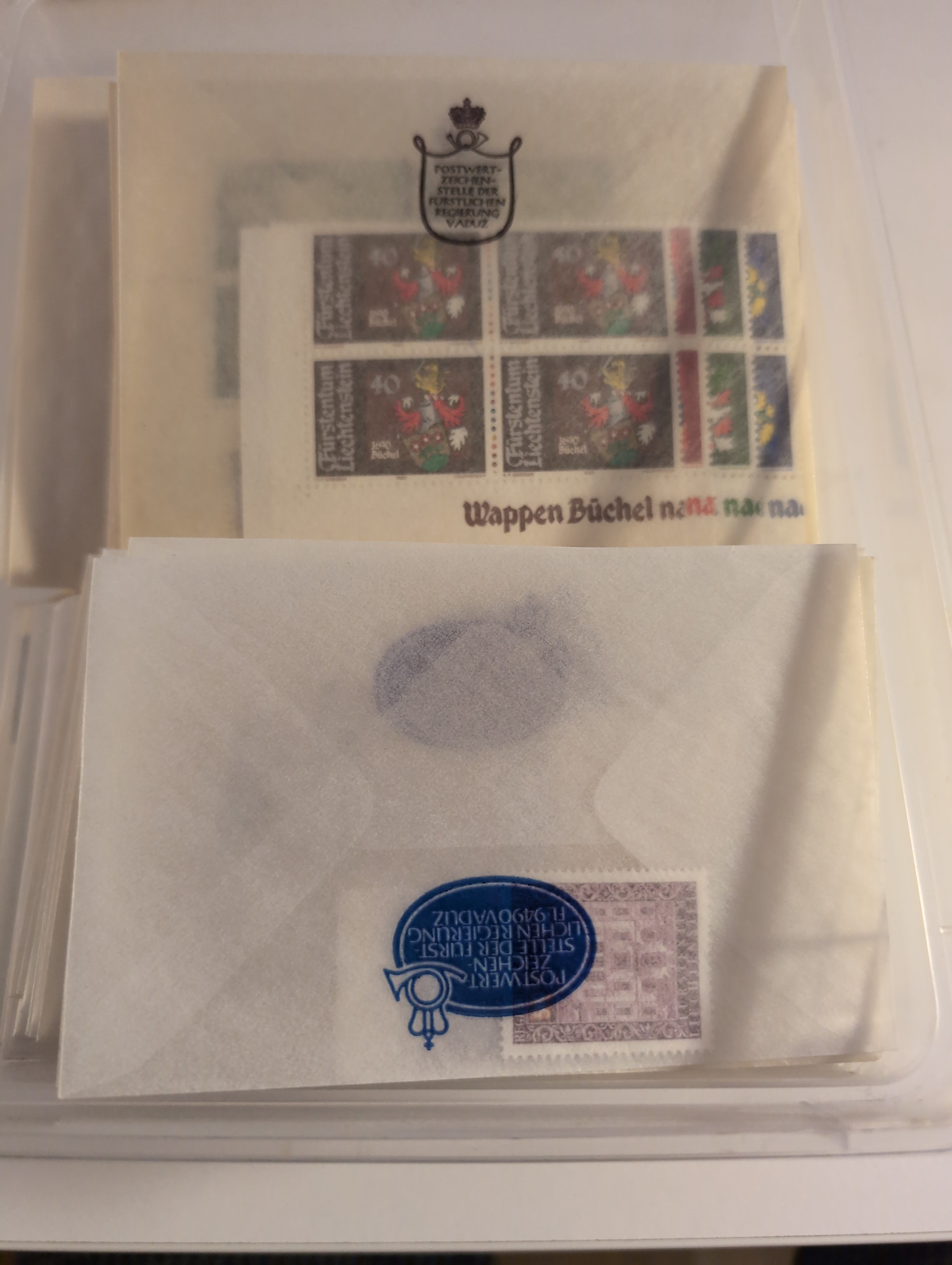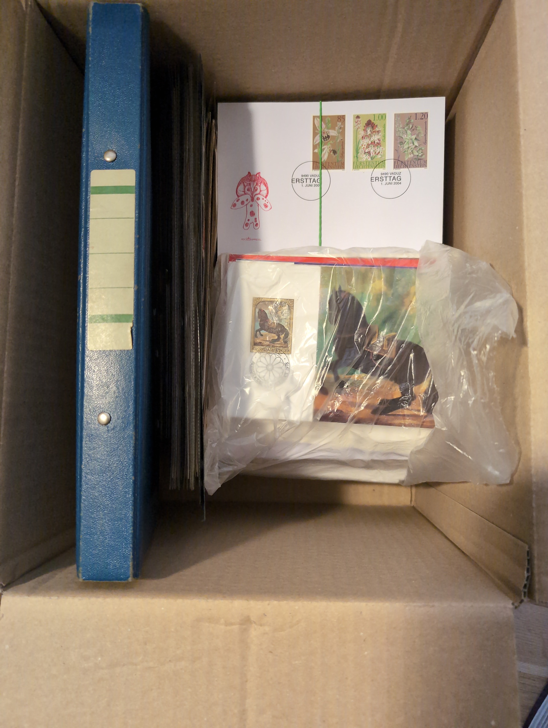 Liechtenstein. Accumulation ★★/★/⊙ 1917–2004 in box. One leadger with covers and cards mostly FDCs incl. a few better. Packet with some better stamps on stockcards. a pile of modern FDCs and a box with modern stamps incl. a lot of blocks of four, hughe face value. CHF 3000+ according to list, Please see a selection of scans at www.philea.se. Mostly fine quality. Approx. 5 kg. (1000S)
