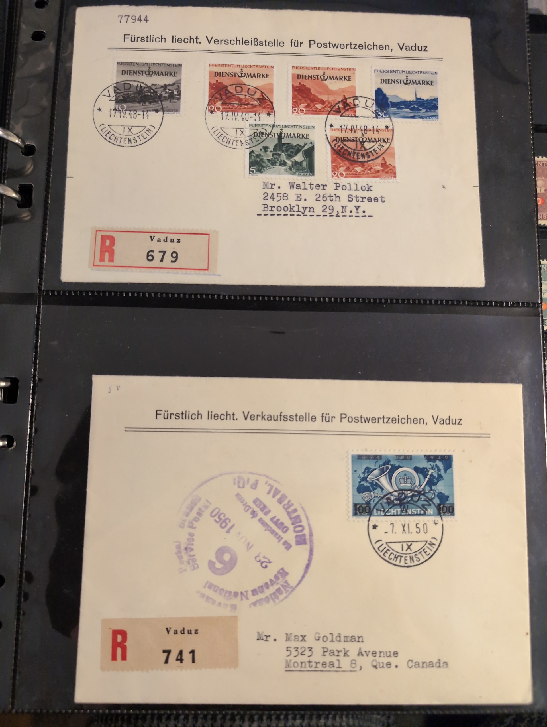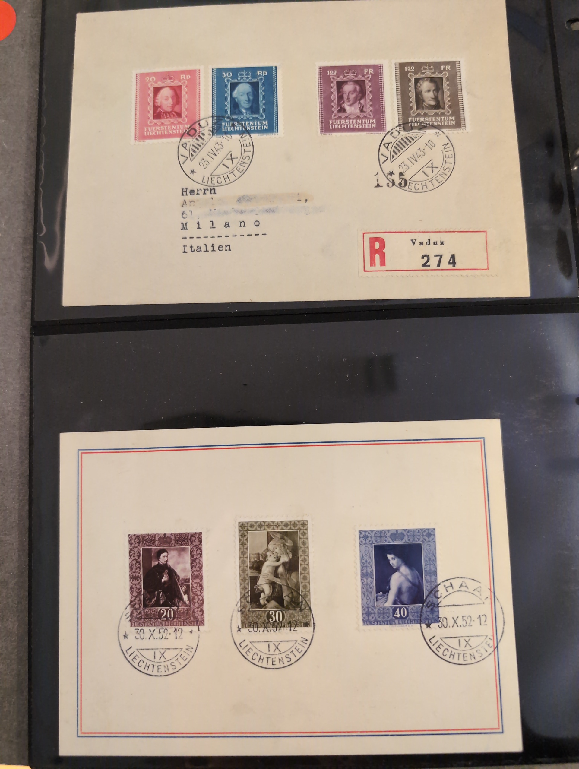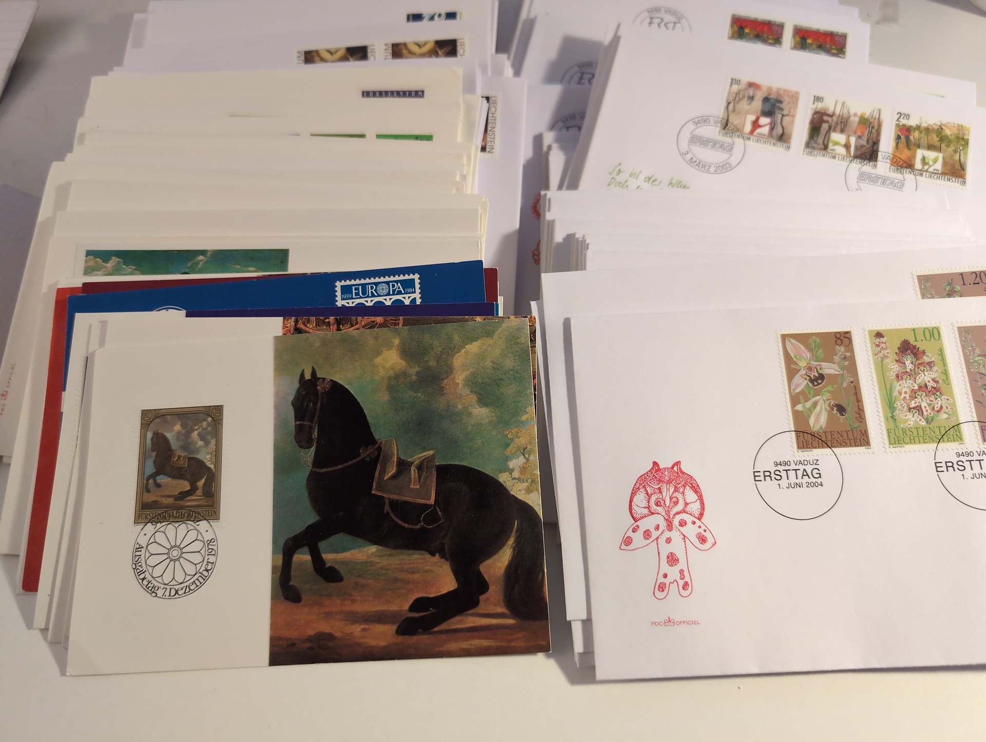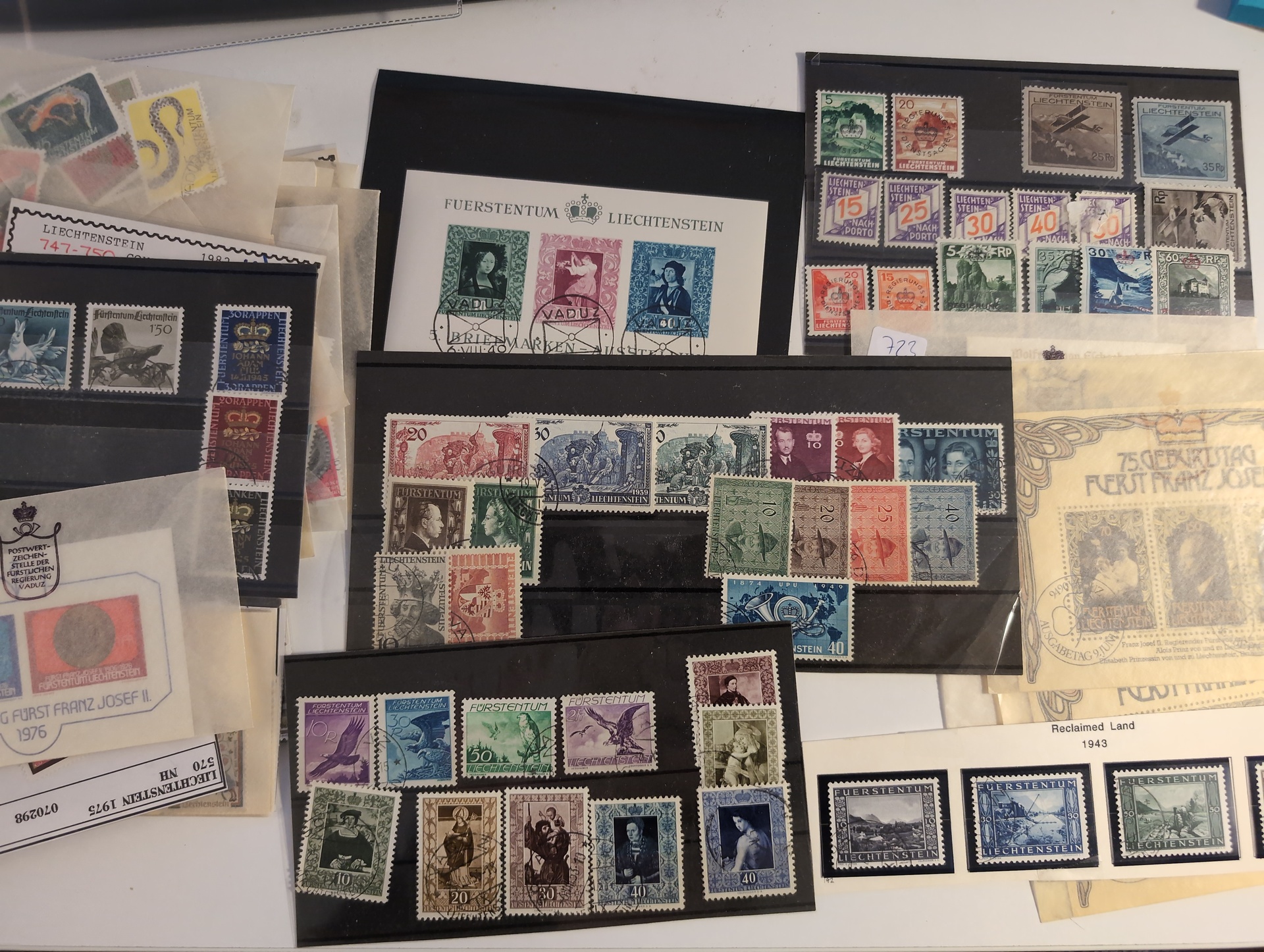 Liechtenstein. Accumulation ★★/★/⊙ 1917–2004 in box. One leadger with covers and cards mostly FDCs incl. a few better. Packet with some better stamps on stockcards. a pile of modern FDCs and a box with modern stamps incl. a lot of blocks of four, hughe face value. CHF 3000+ according to list, Please see a selection of scans at www.philea.se. Mostly fine quality. Approx. 5 kg. (1000S)