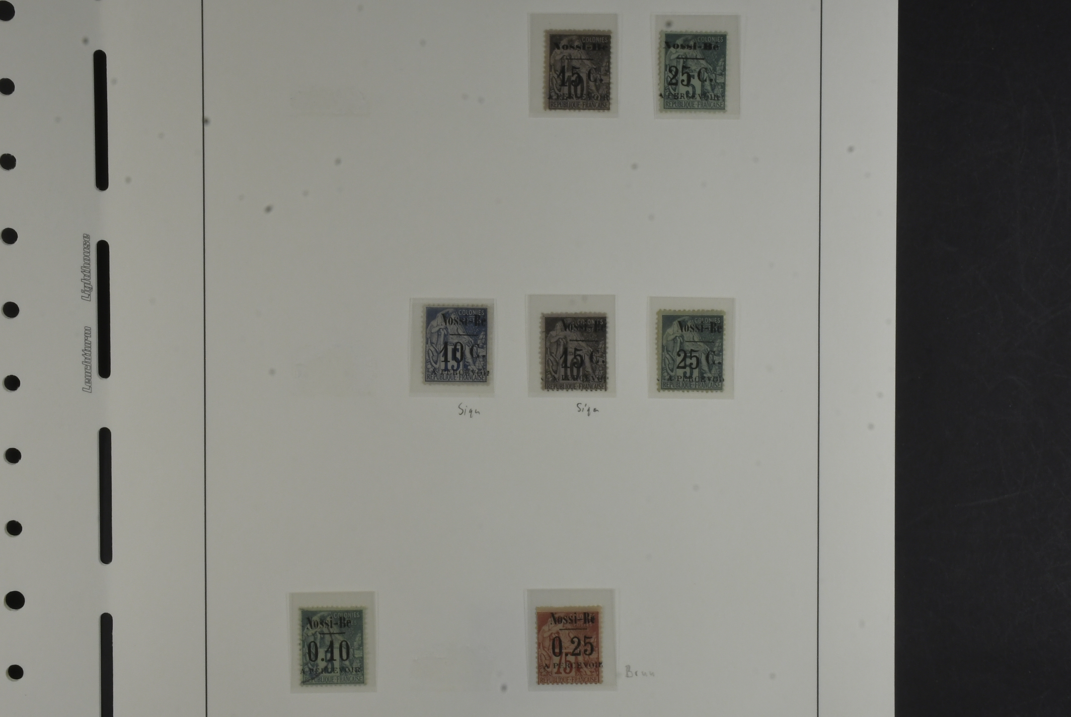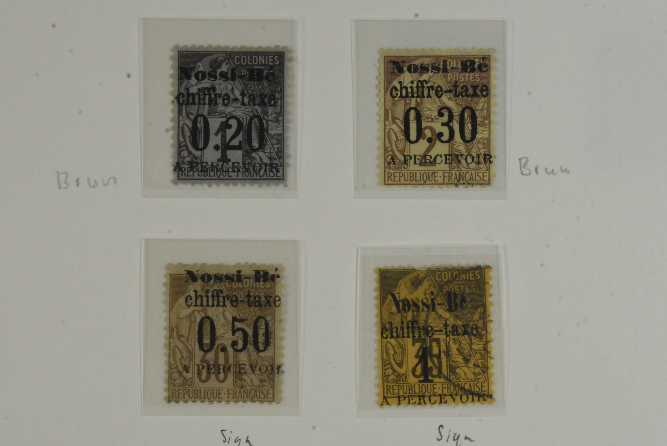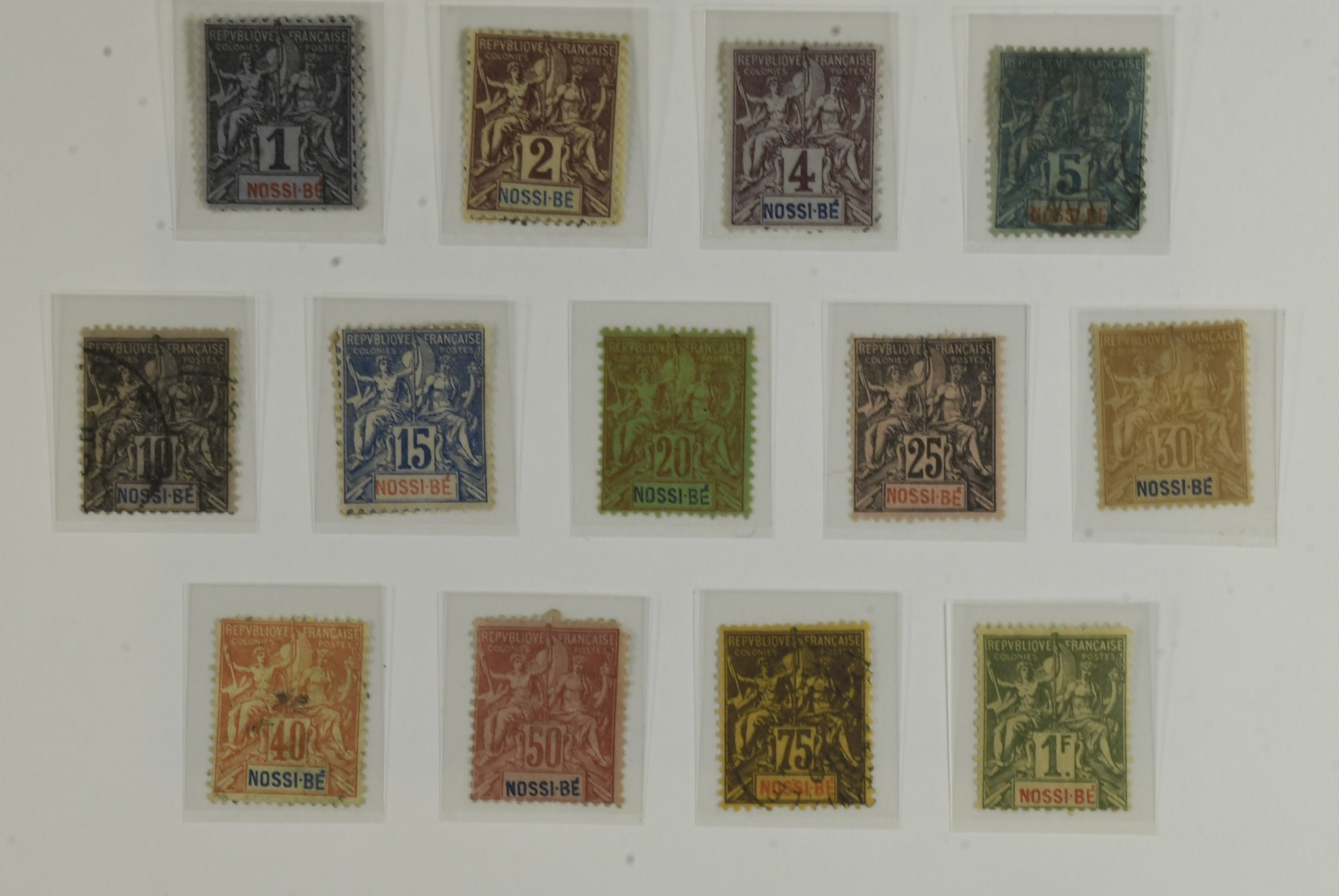 Nossi-Bé. Collection ★/⊙ 1889–1894 on leaves. Nice little collection with several better stamps many of them signed or with dealer's mark, incl. good part postage dues. The entire lot is presented at www.philea.se. Good quality. (34)