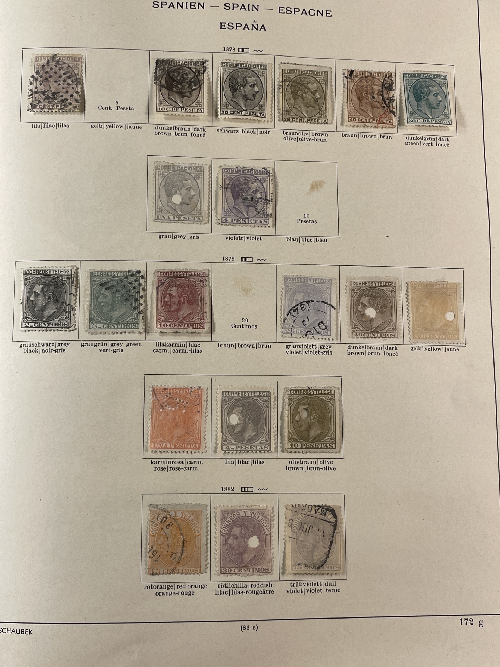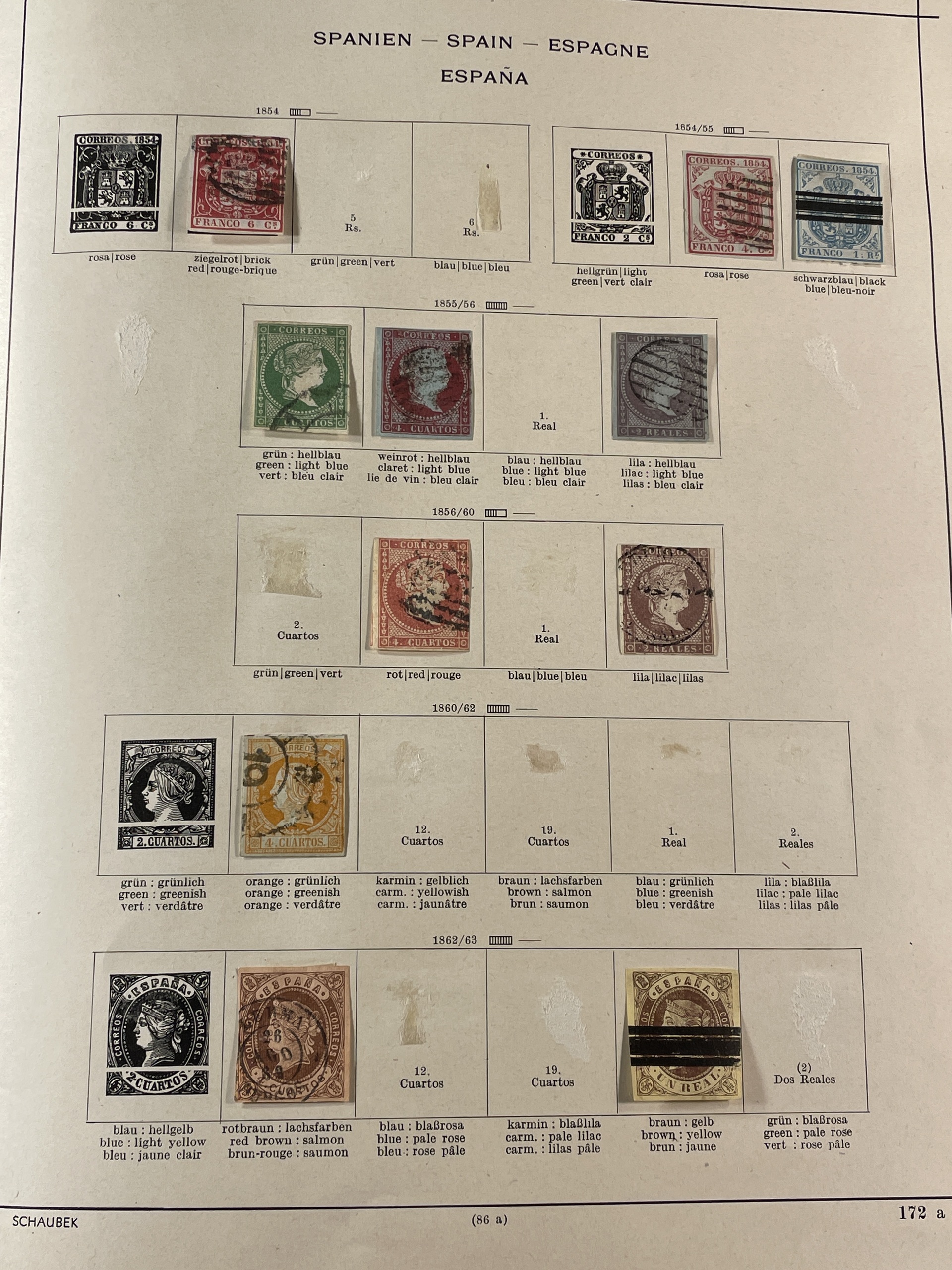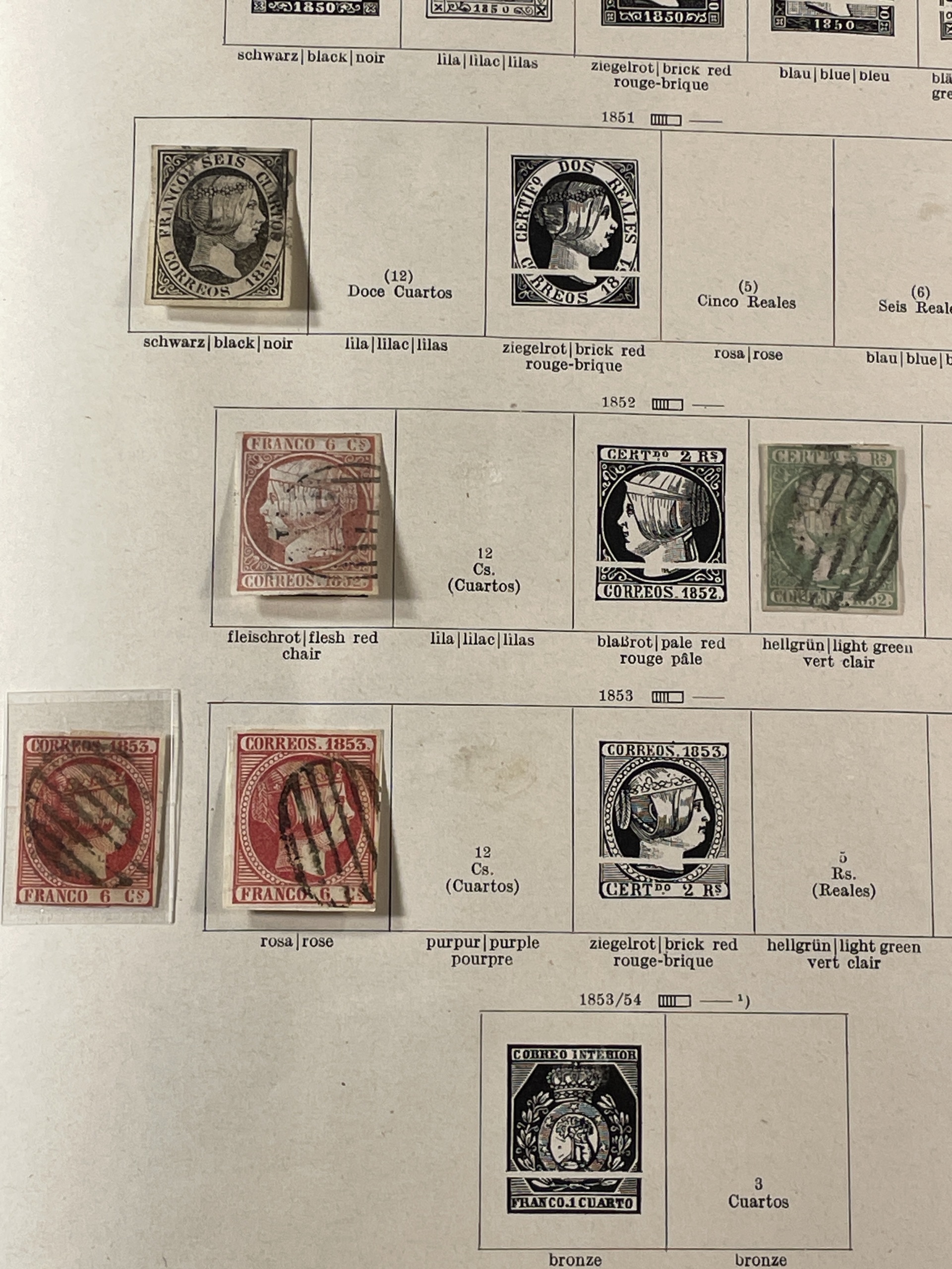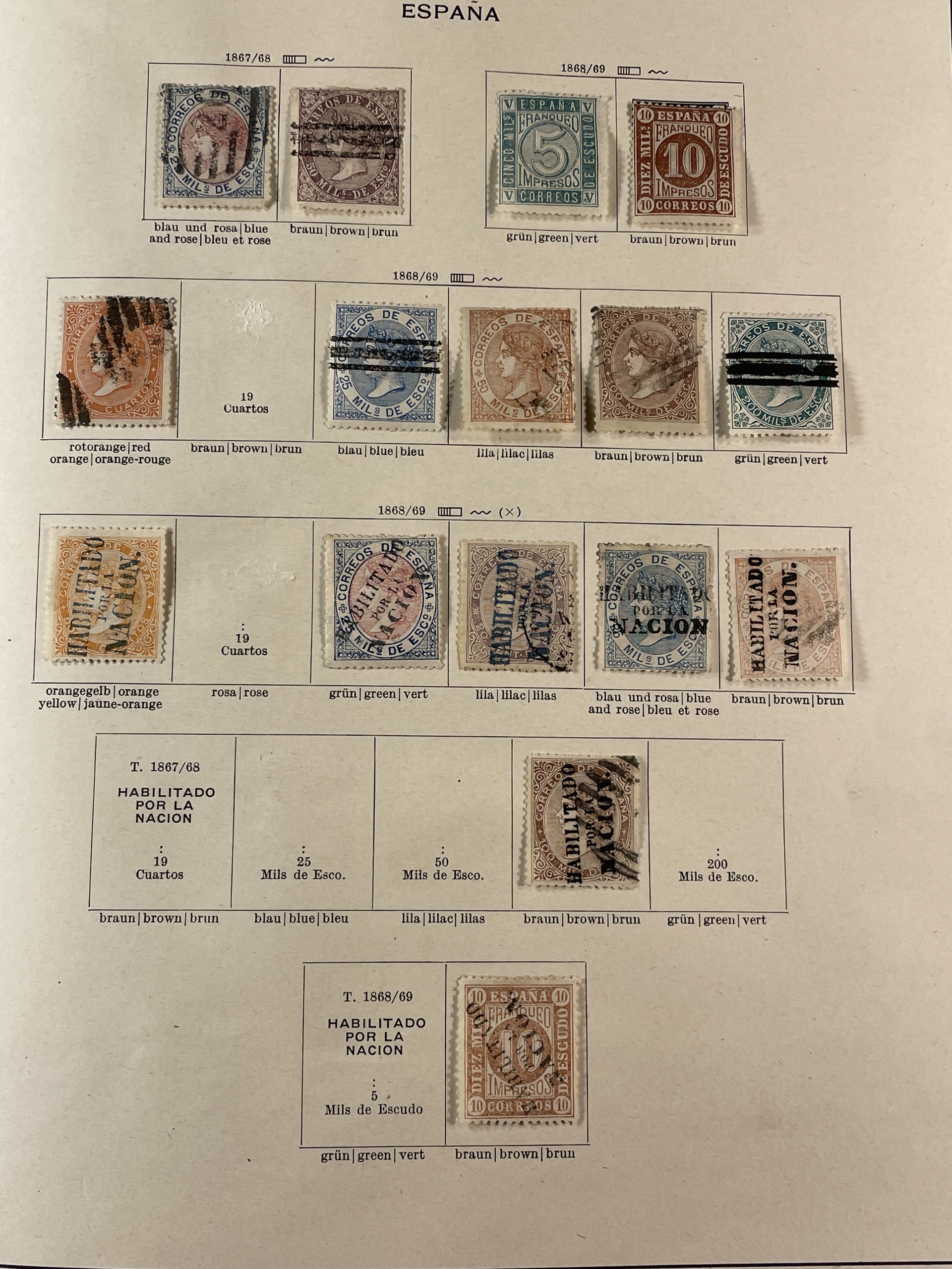 Spain. Collection ★/⊙ 1851–1955 in old album. Plundered years ago, but several better remains. Some unused are glued to the sheets. Mixed quality.