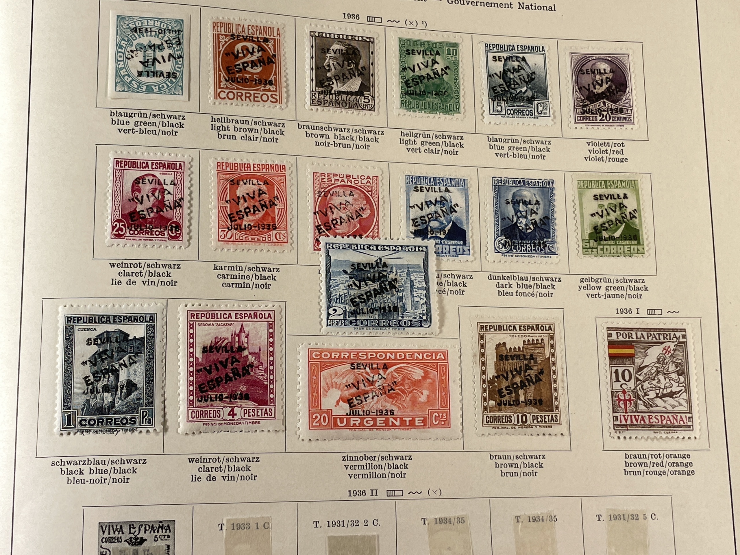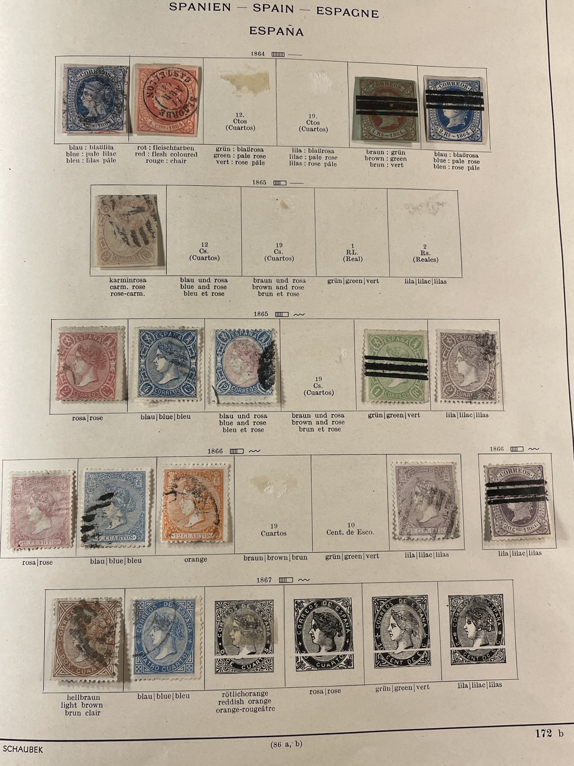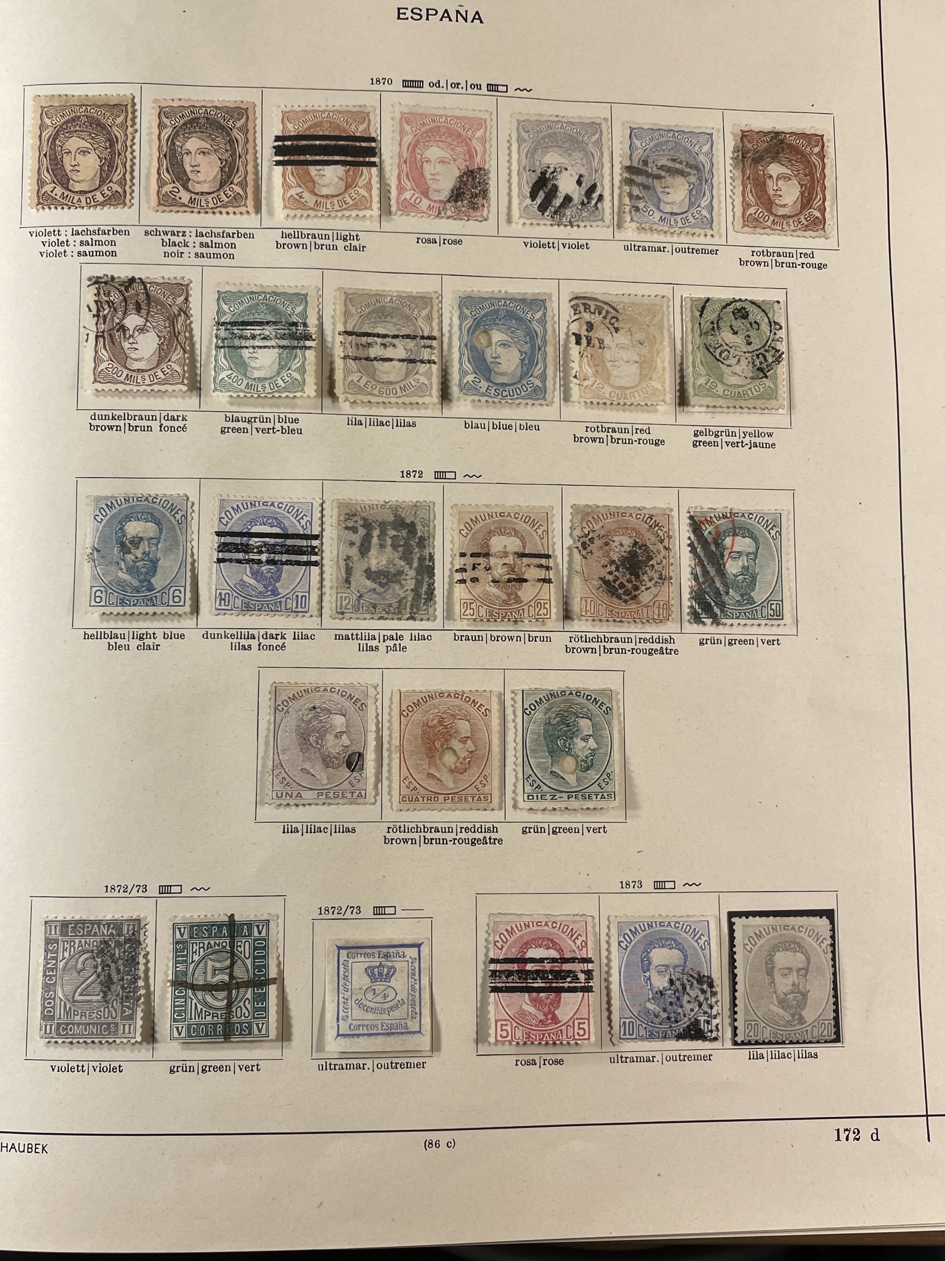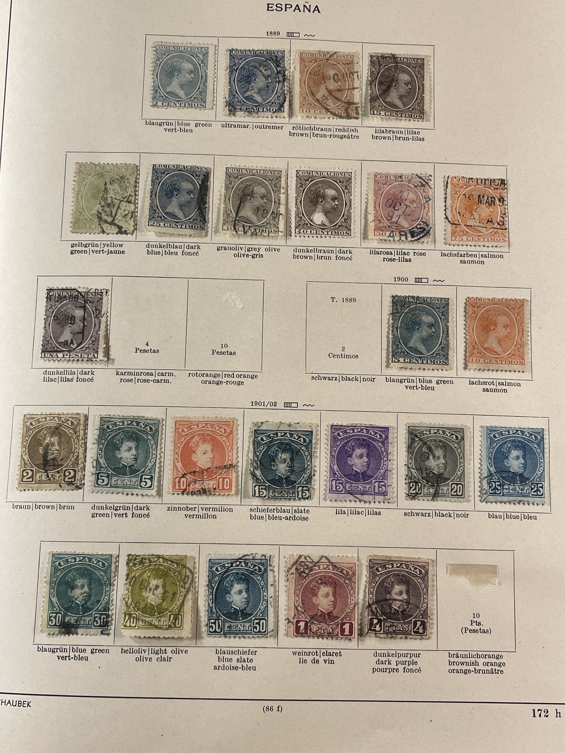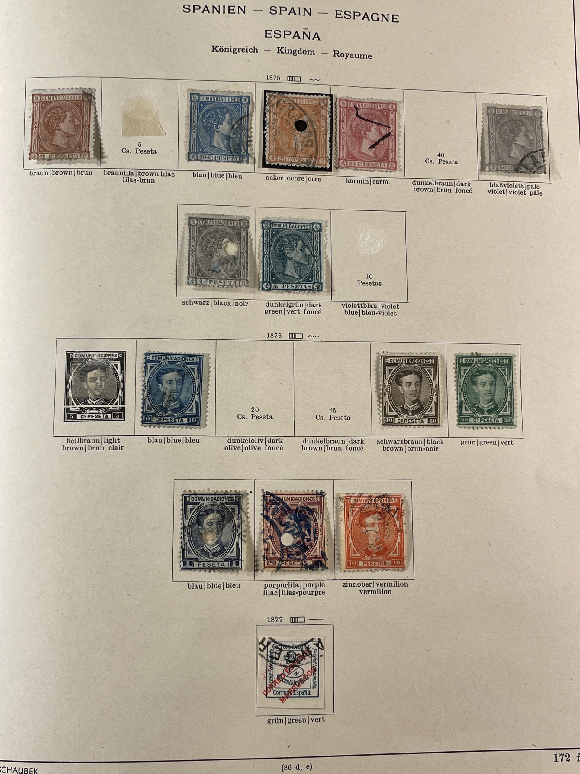 Spain. Collection ★/⊙ 1851–1955 in old album. Plundered years ago, but several better remains. Some unused are glued to the sheets. Mixed quality.