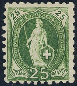 Switzerland. Michel 59B ★, 1882 Standing Helvetia 25 c green perf 9¾ × 9¼. EUR 180
