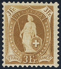 Switzerland. Michel 64A ★, 1882 Standing Helvetia 3 Fr olive-brown perf 11¾. EUR 320