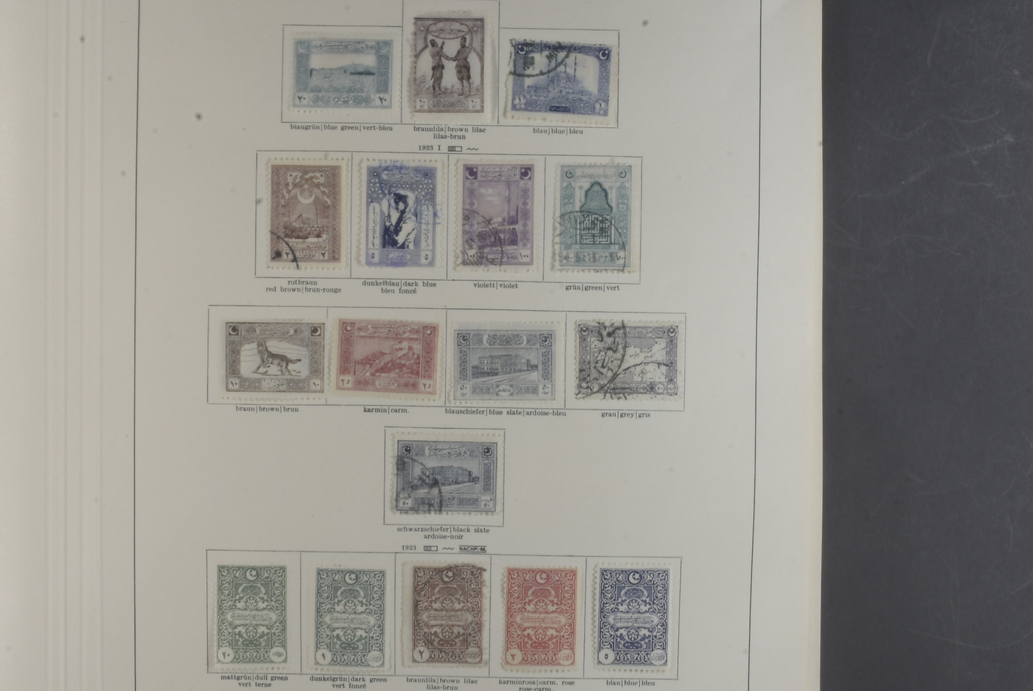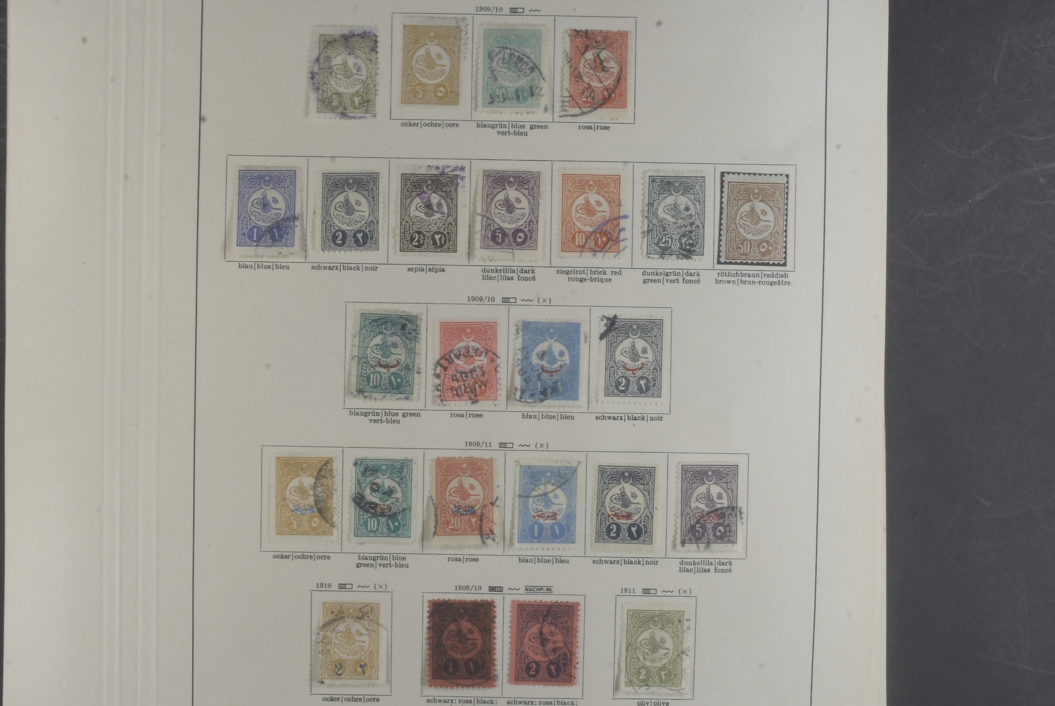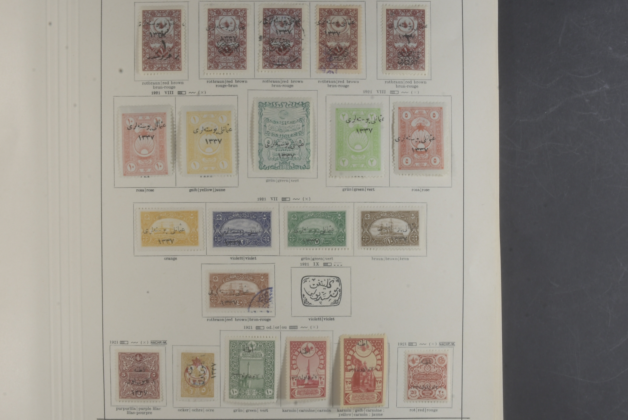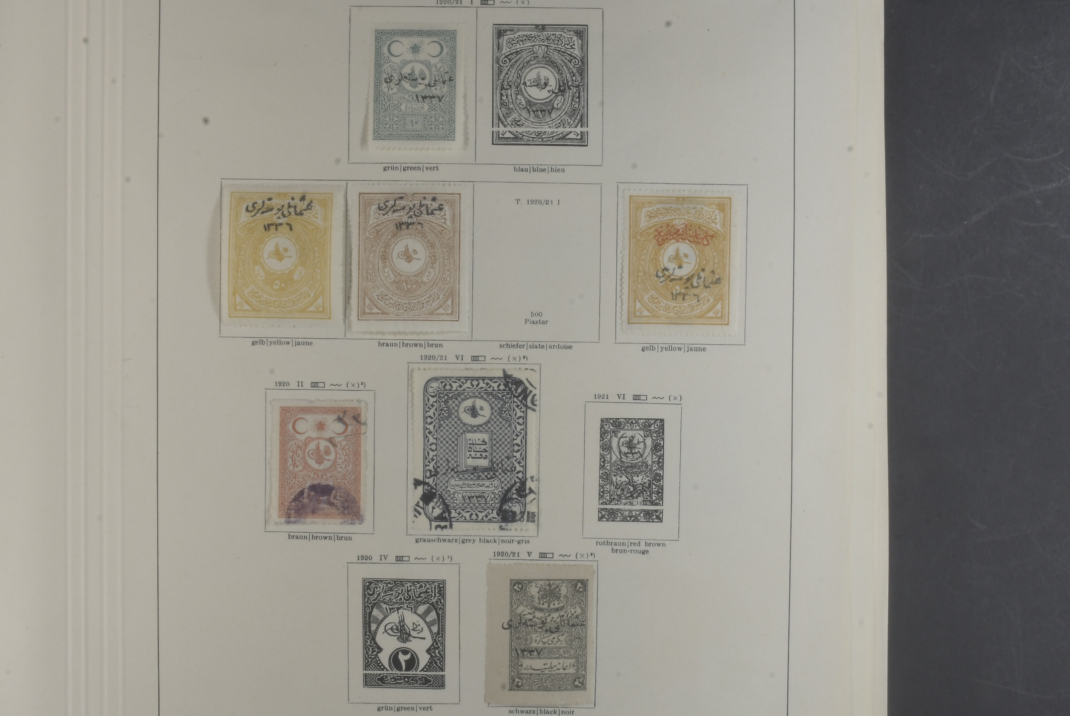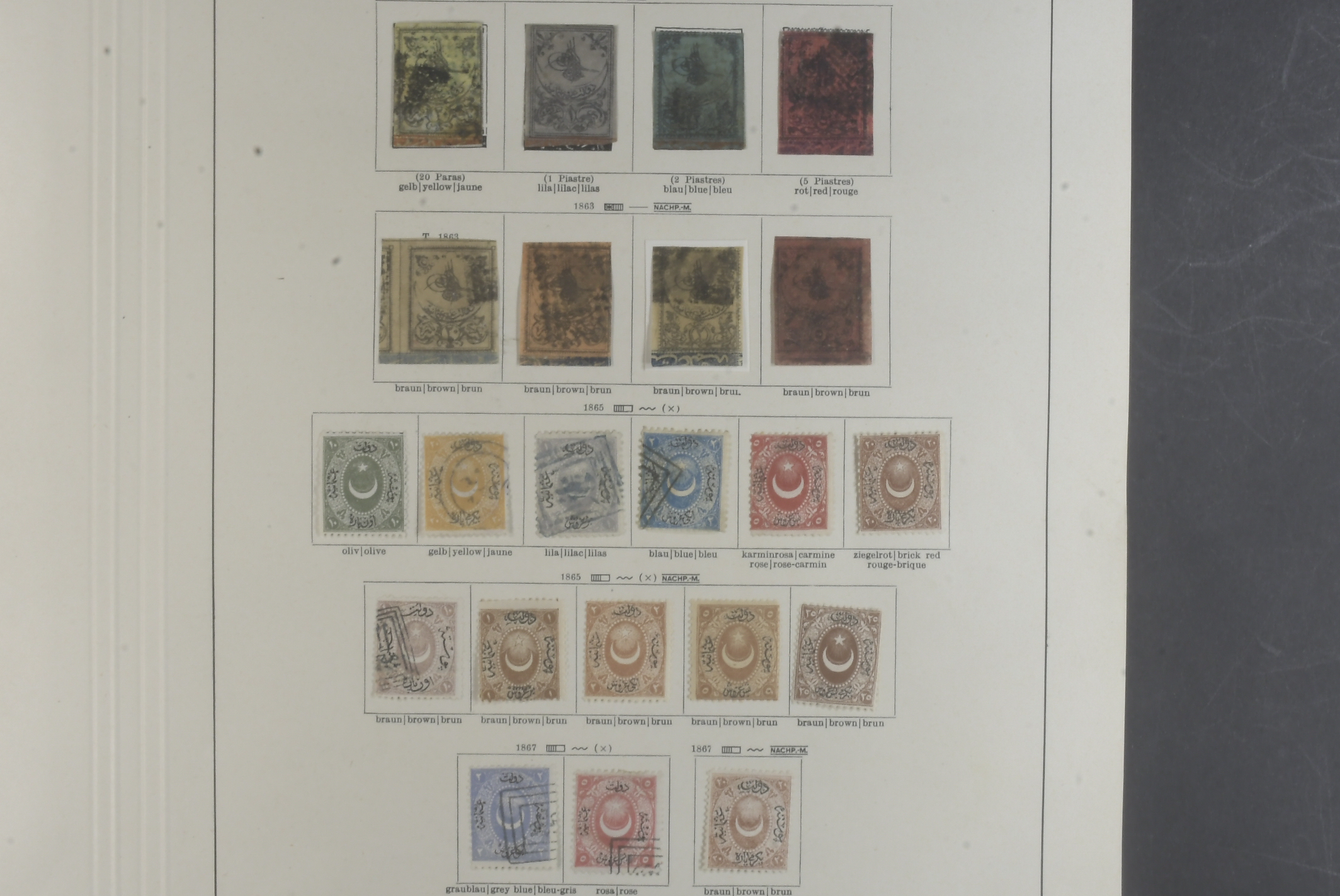 Turkey. Collection ★/⊙ 1863–1955 on leaves. Almost complete in main numbers used or mint. A few stuck on the leaves, but mostly OK. Many better and seldom seen stamps, e.g. Mi 1–4 used, 10 *, 181–88 I and II *, 181–88 III on piece, 201–02 III *, 195–202 IV *, 229–45 used, 640–52 *, 787–806 and 857–90 */o, 985–99 used, due 1–4 used and much more. Somewhat mixed quality.