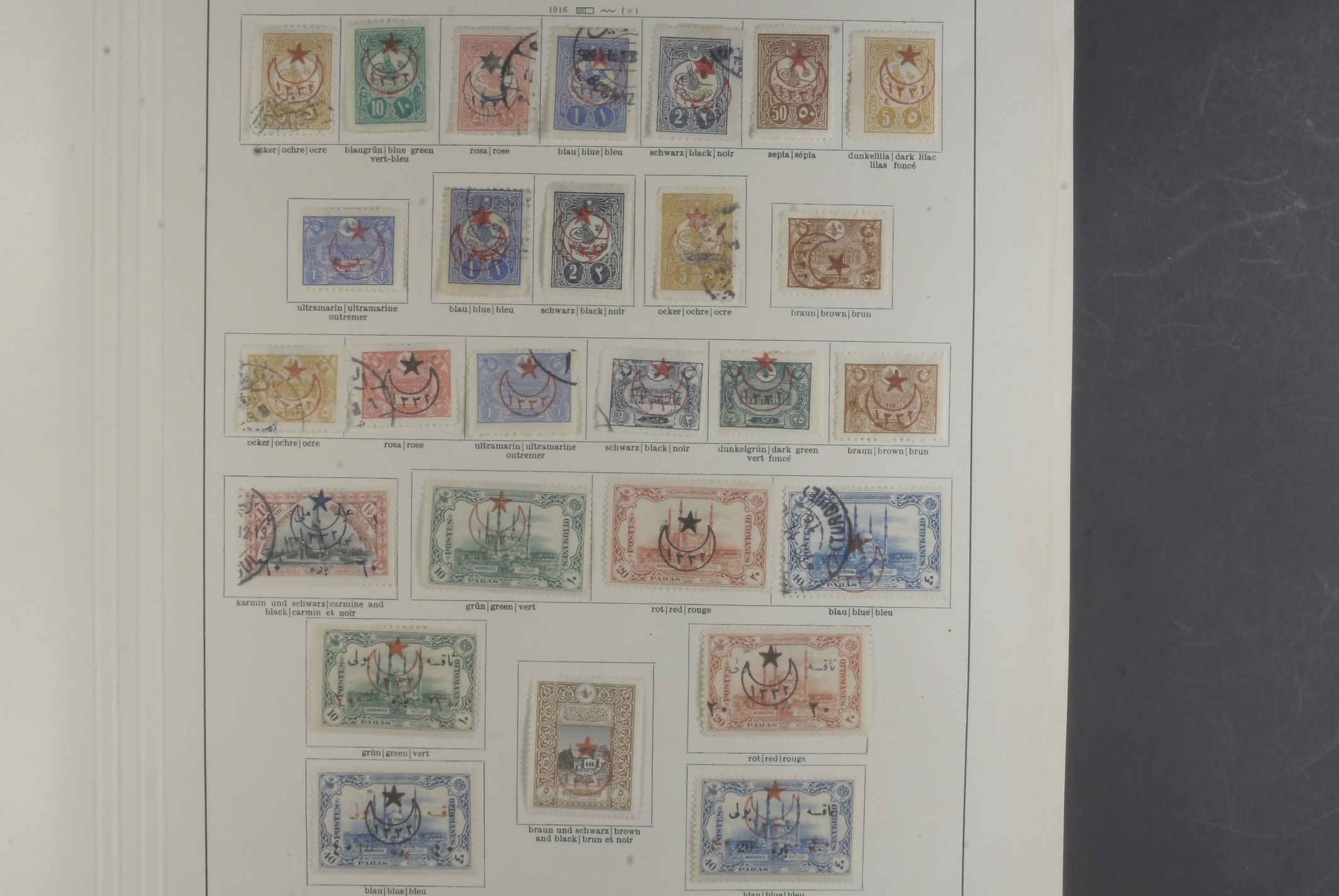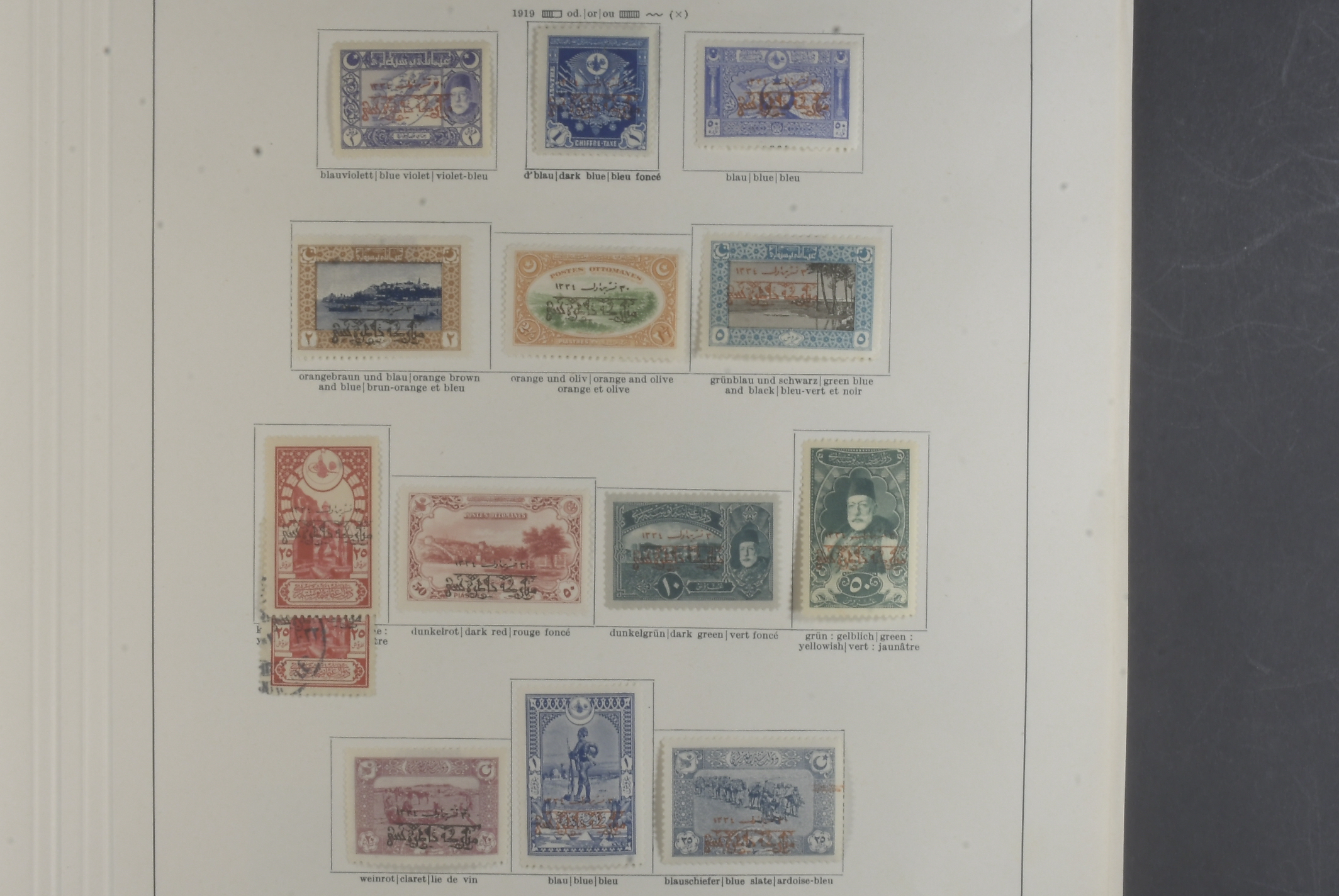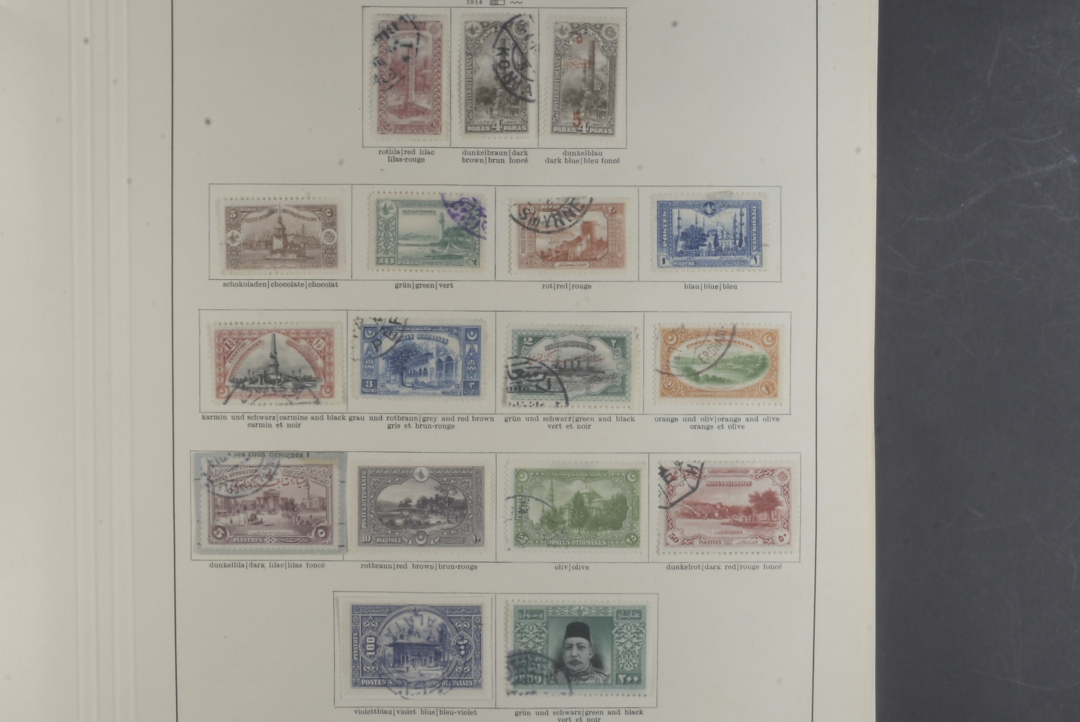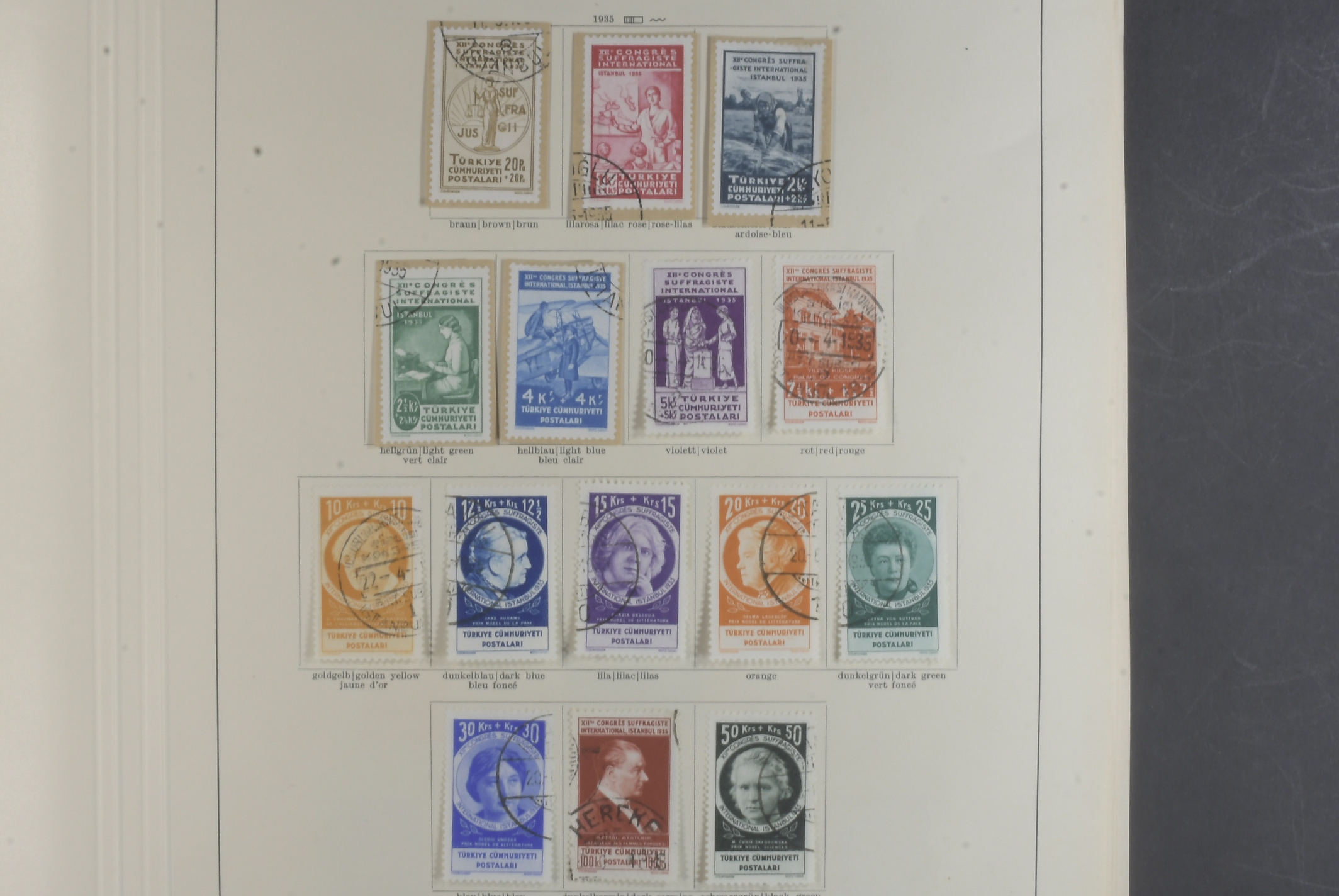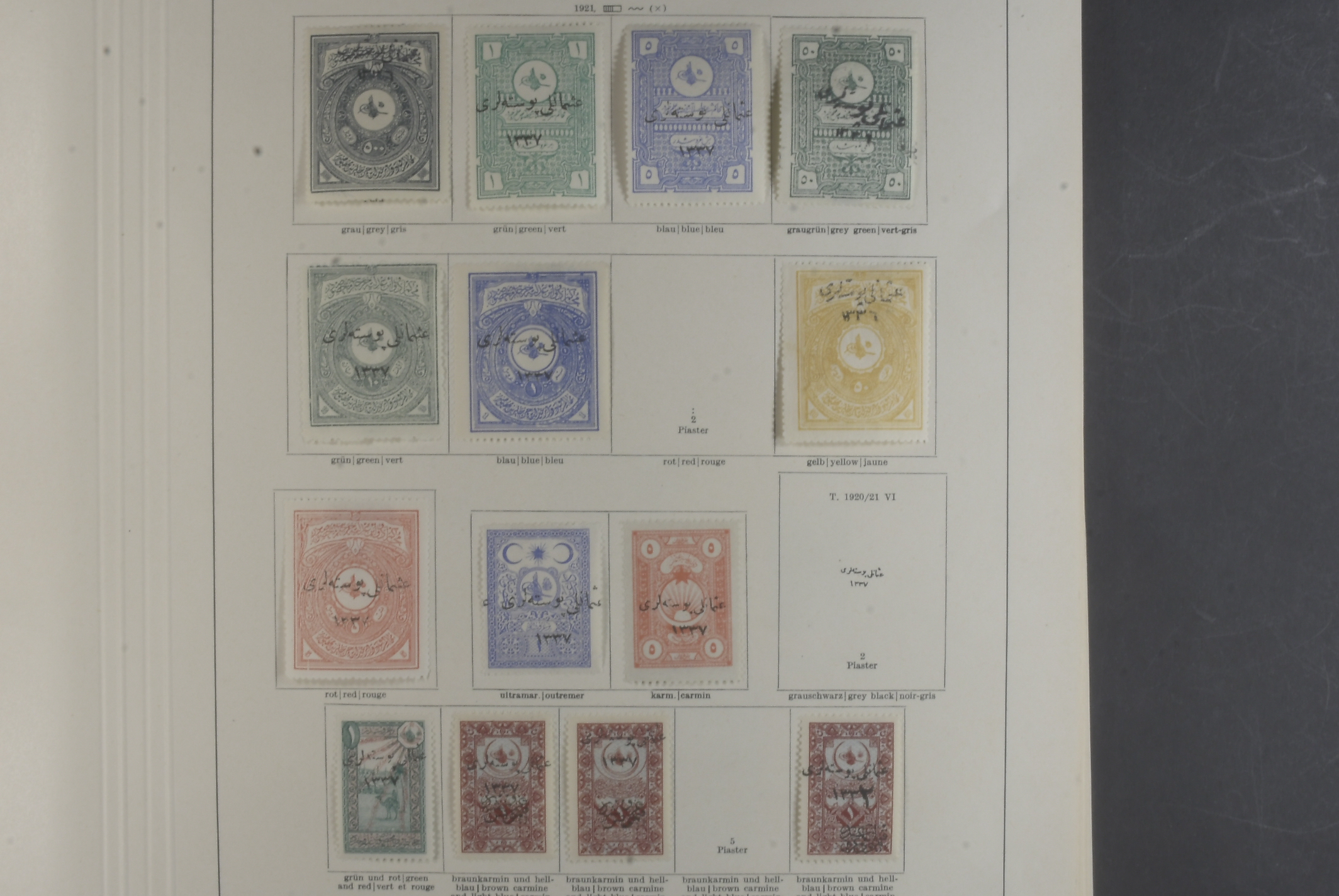 Turkey. Collection ★/⊙ 1863–1955 on leaves. Almost complete in main numbers used or mint. A few stuck on the leaves, but mostly OK. Many better and seldom seen stamps, e.g. Mi 1–4 used, 10 *, 181–88 I and II *, 181–88 III on piece, 201–02 III *, 195–202 IV *, 229–45 used, 640–52 *, 787–806 and 857–90 */o, 985–99 used, due 1–4 used and much more. Somewhat mixed quality.