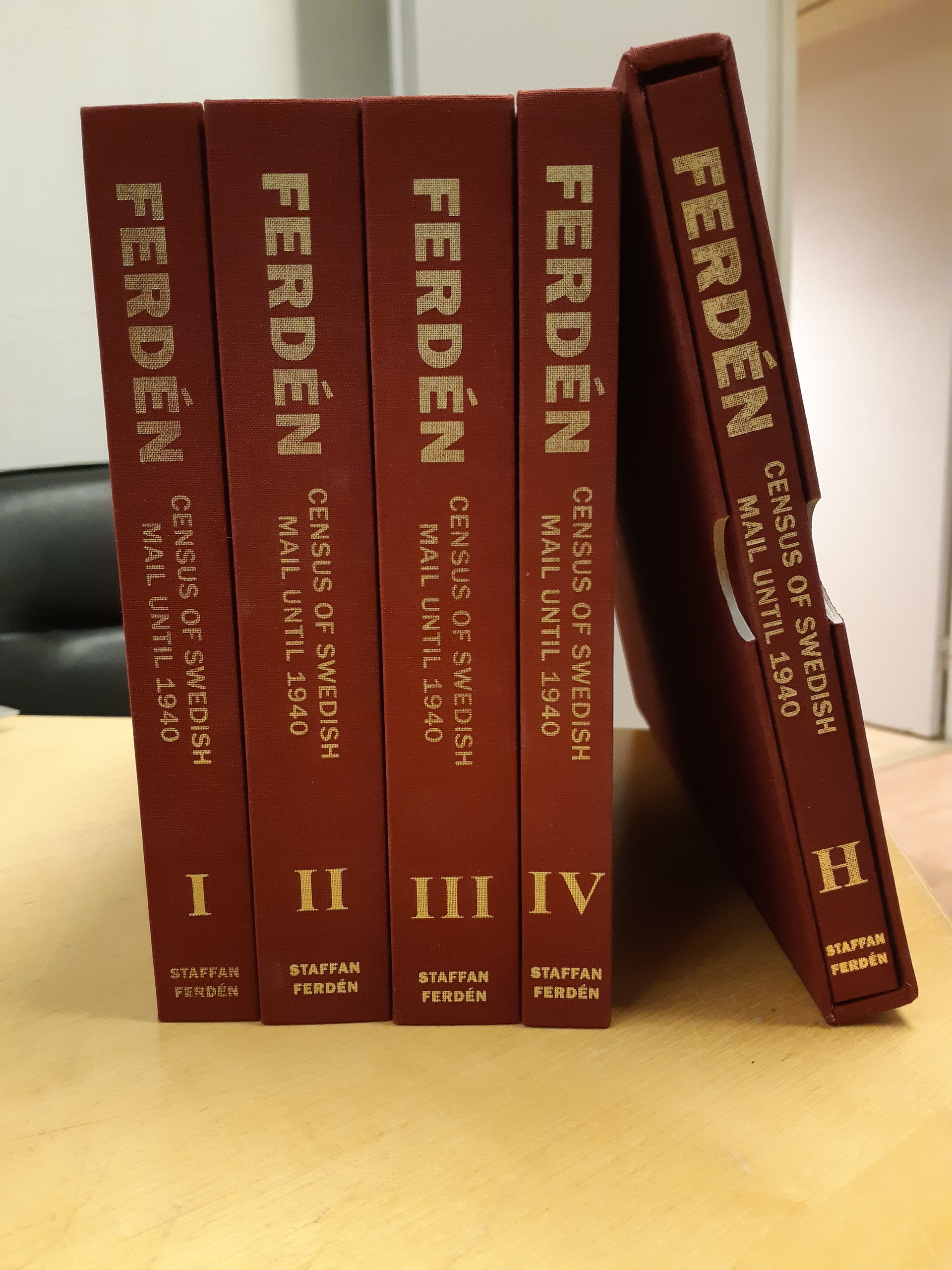 Literature. FERDÉN – Census of Swedish Mail until 1940, Vol. I–IV, without slip case, and Vol. H (=V) with slip case. Used in very fine condition. Approx. 8 kg.