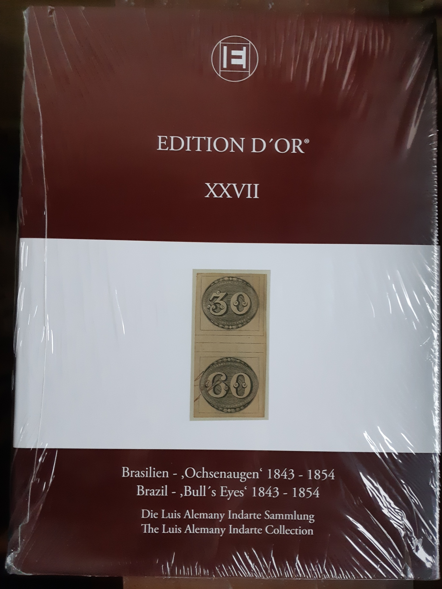 Literature. EDITION D'OR, Vol. XXXVII 'Brazil – 'Bull's Eyes' 1843–1854 – The Luis Alemany Indarte Collection', The Global Philatelic Network, 2011. The Large Gold awarded exhibit depicted in its entirety, hardcover, with dust jacket, 160 pp., introduction bilingual English/German. Sold out at publisher. New, still wrapped in plastic.