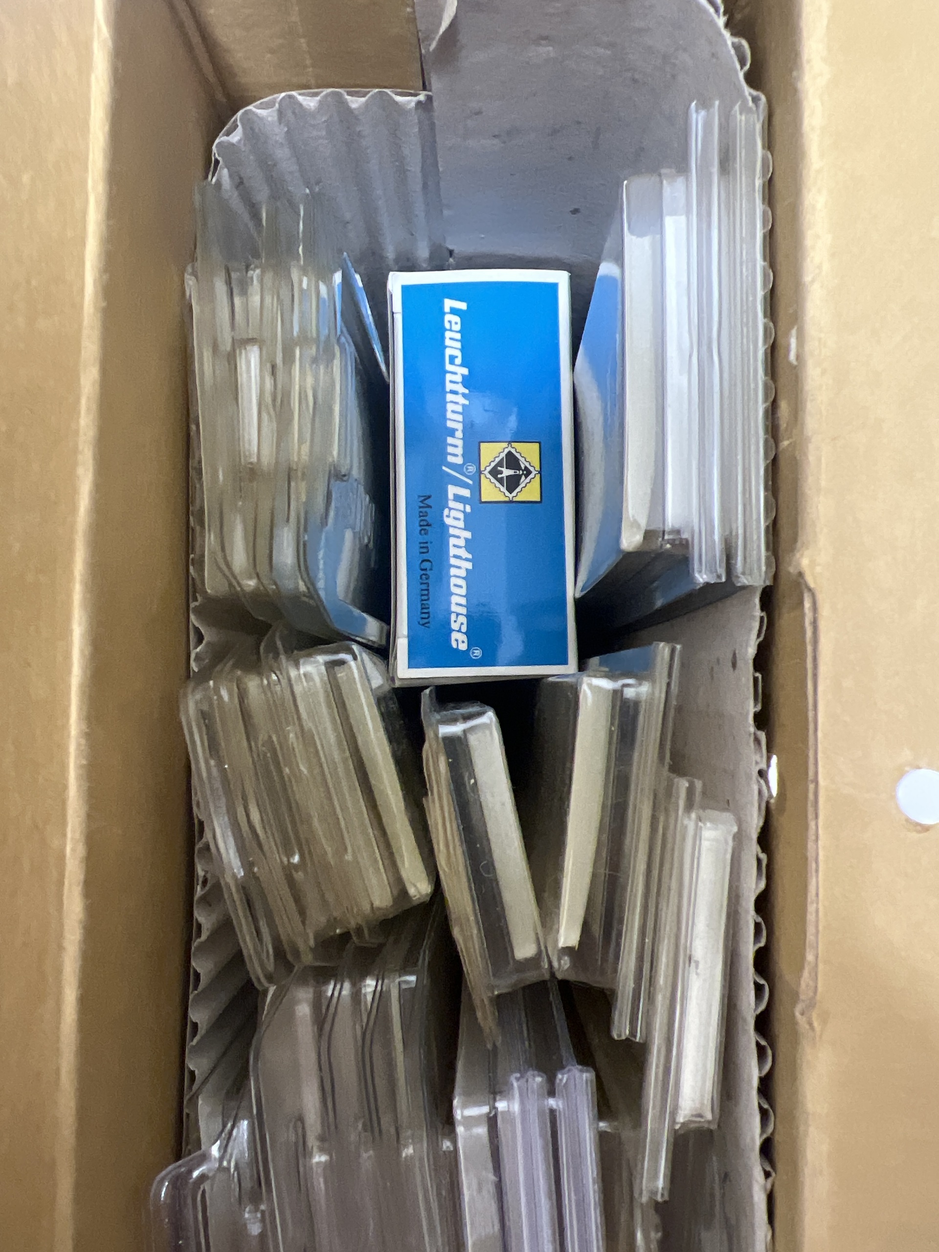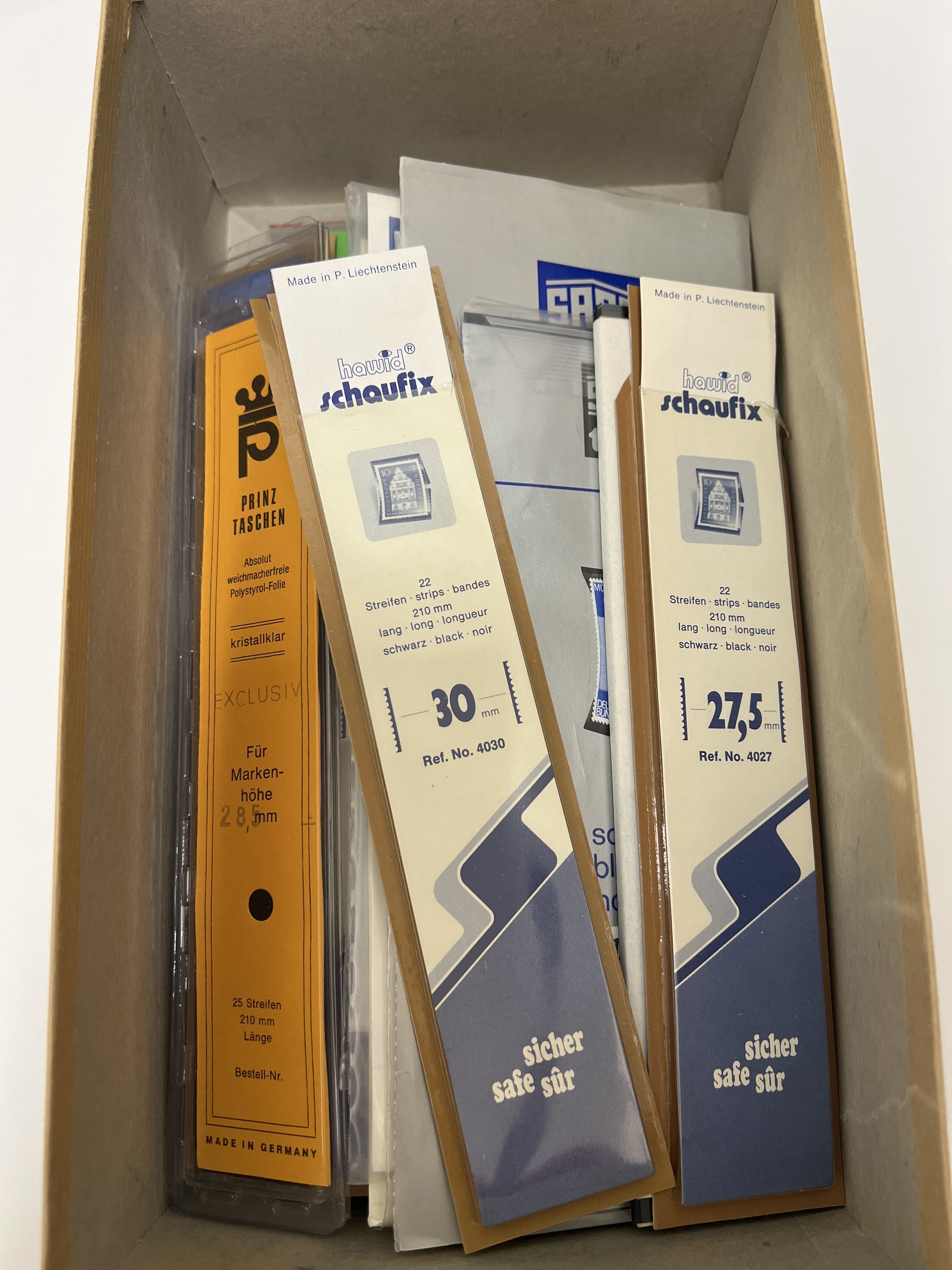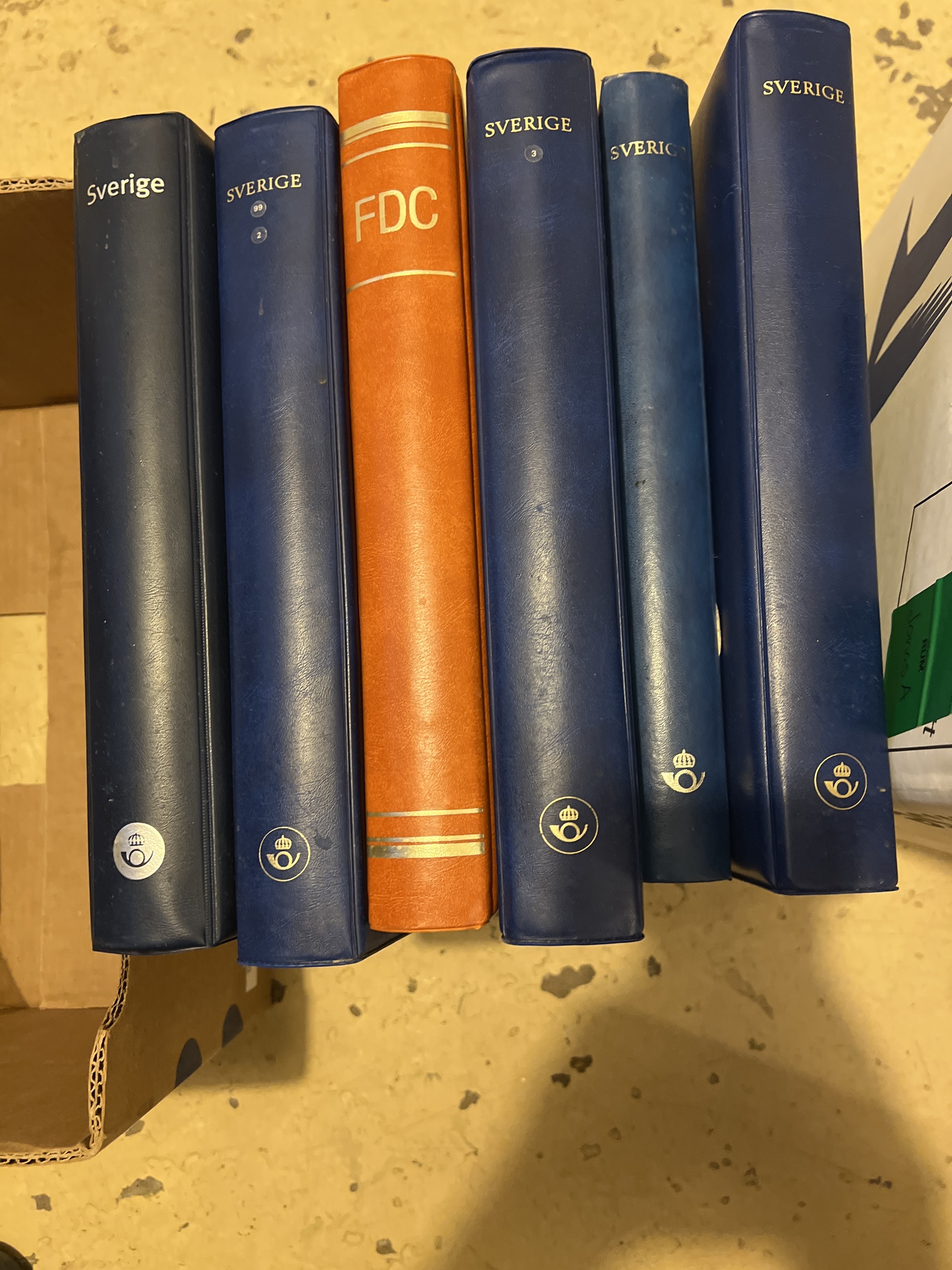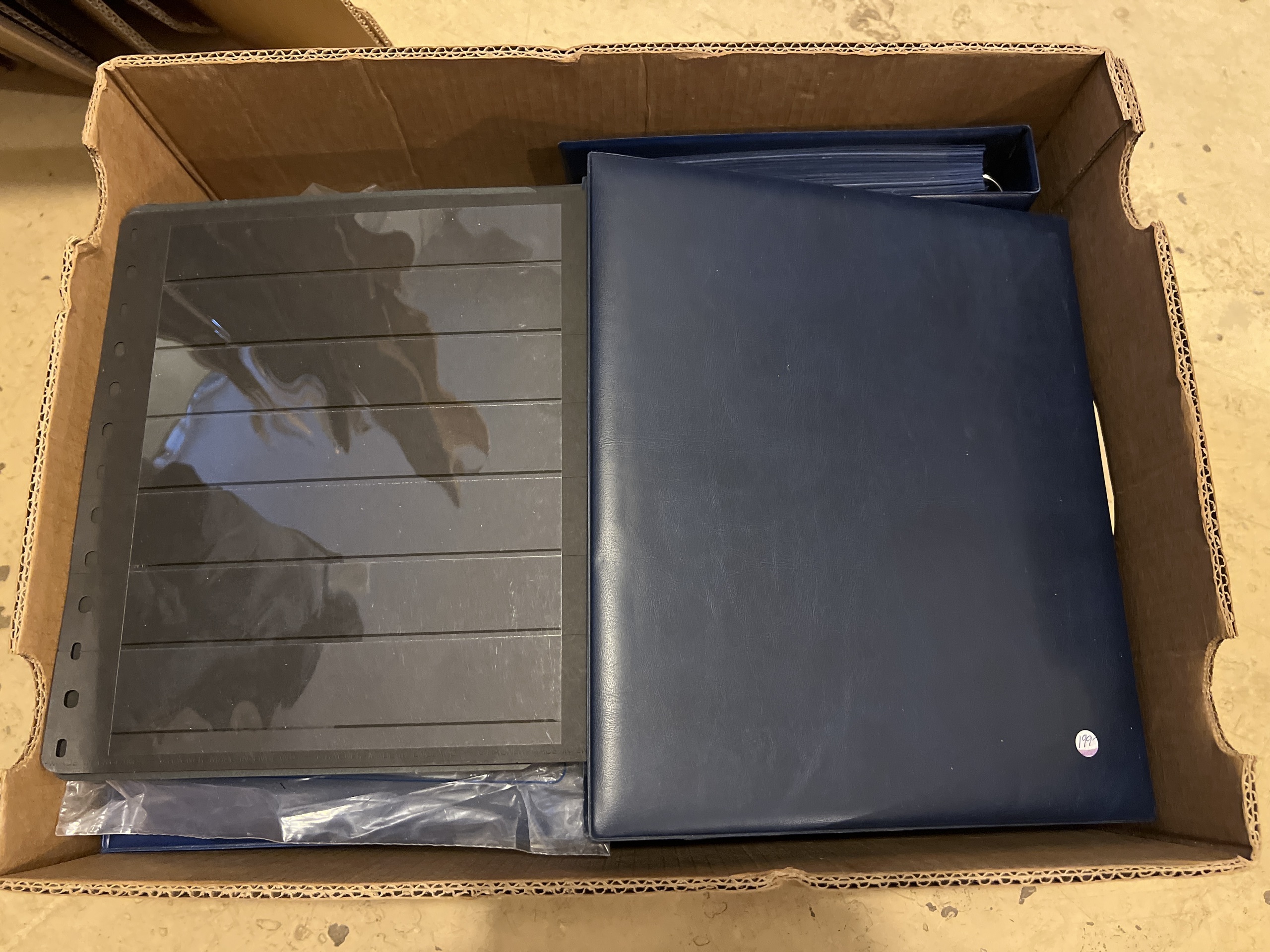 Accessories. Removal box with empty albums, binders and klämfix mm. Six FDC binders of which three with leaves. Ca. 50 new visir leaves, two boxes with klämfix in varied sizes, both clear and black, etc. Please inspect. Approx. 13 kg.