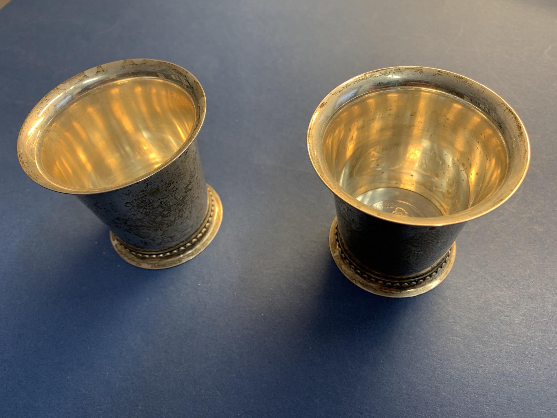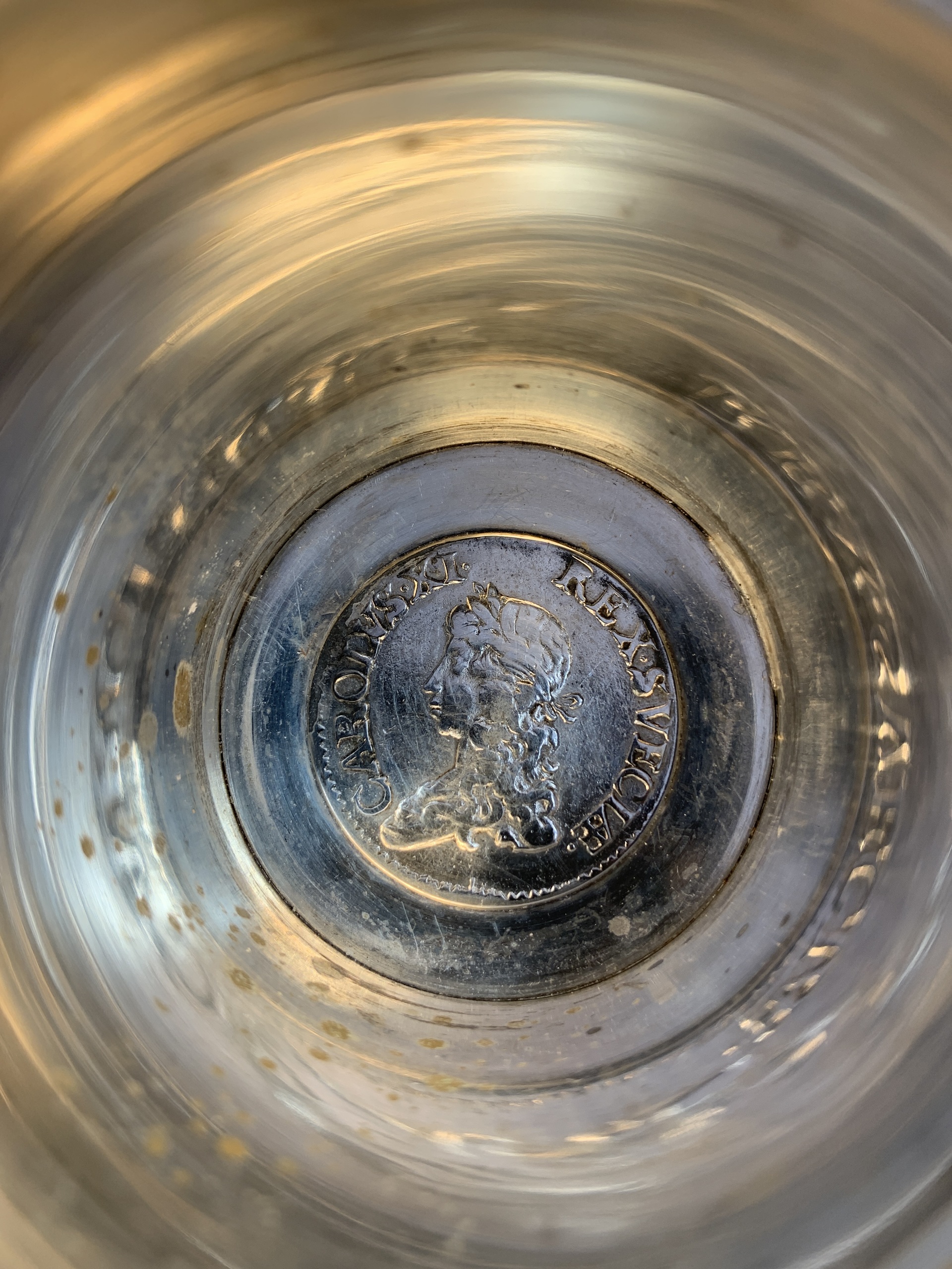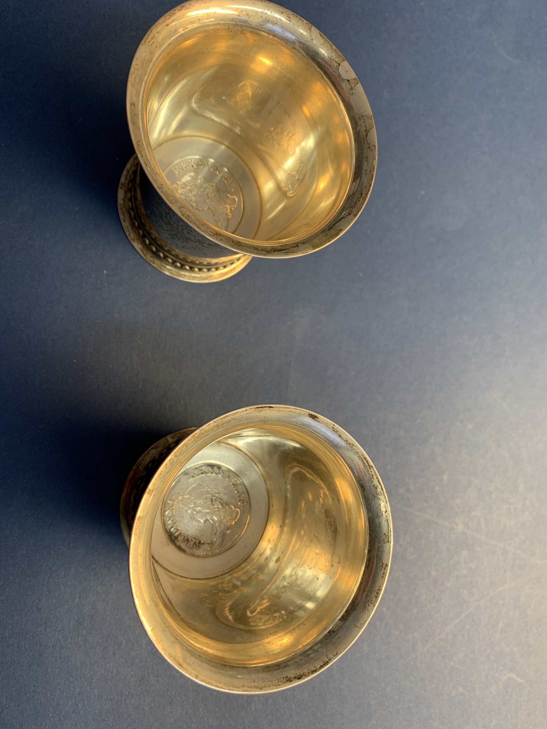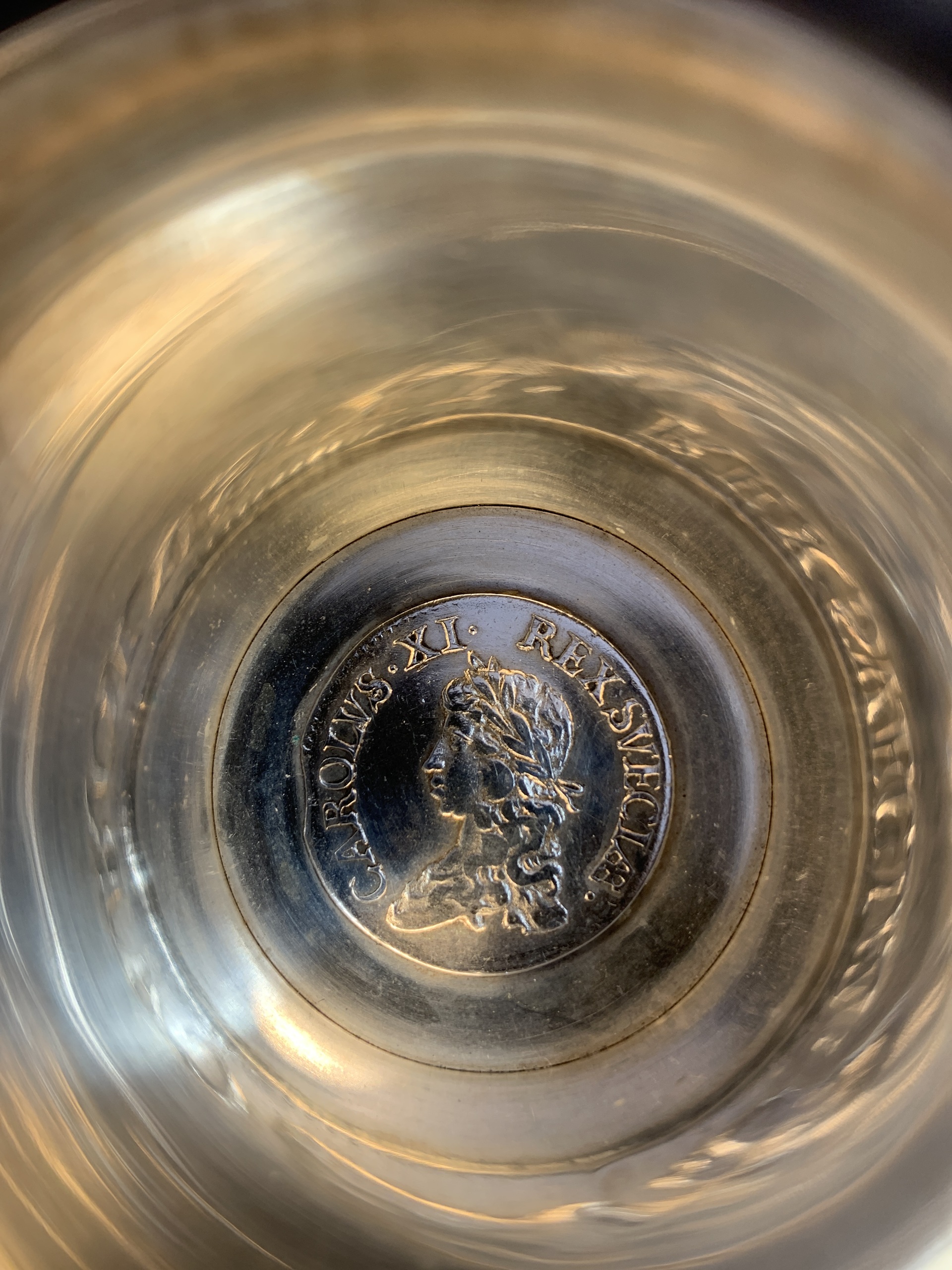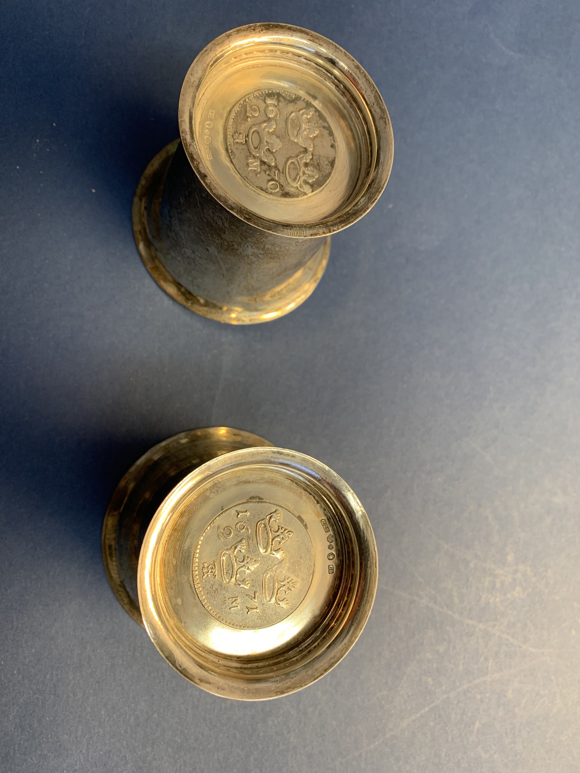 Numismatic accessories. Two cups made in 1933 with inlaid coins from the reign of Karl XI, 2 mark 1670 resp. 1671. Total weight 116 g.