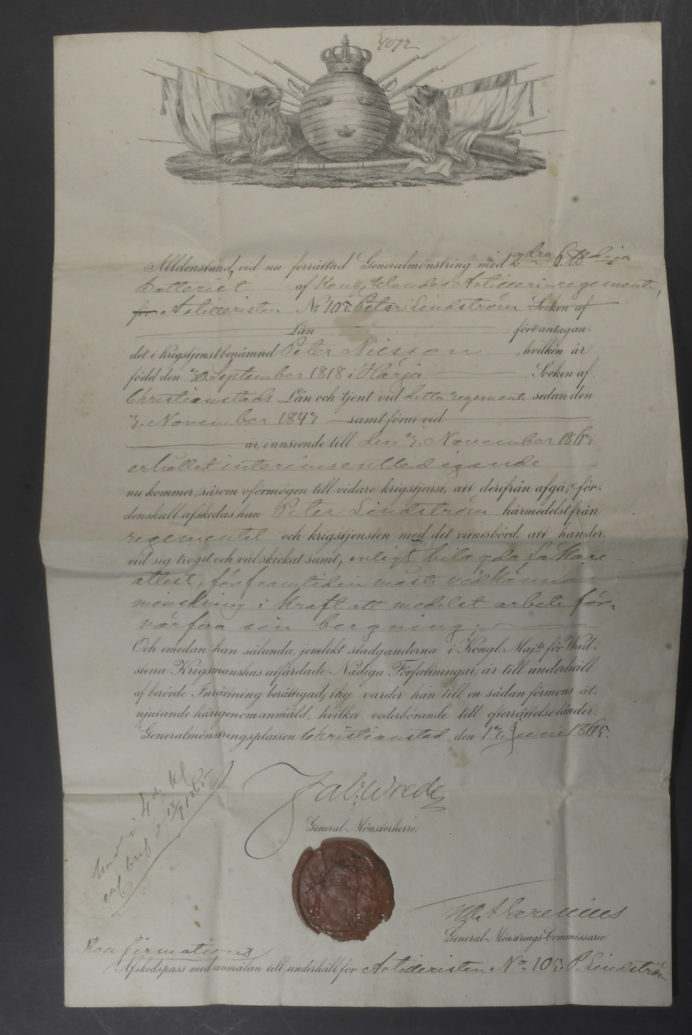 Documents, Sweden. Beautifully illustrated farewell passport with notification for maintenance for Artillerist, dated in Kristianstad 13 June 1865, signed by officer Wrede and with a seal.