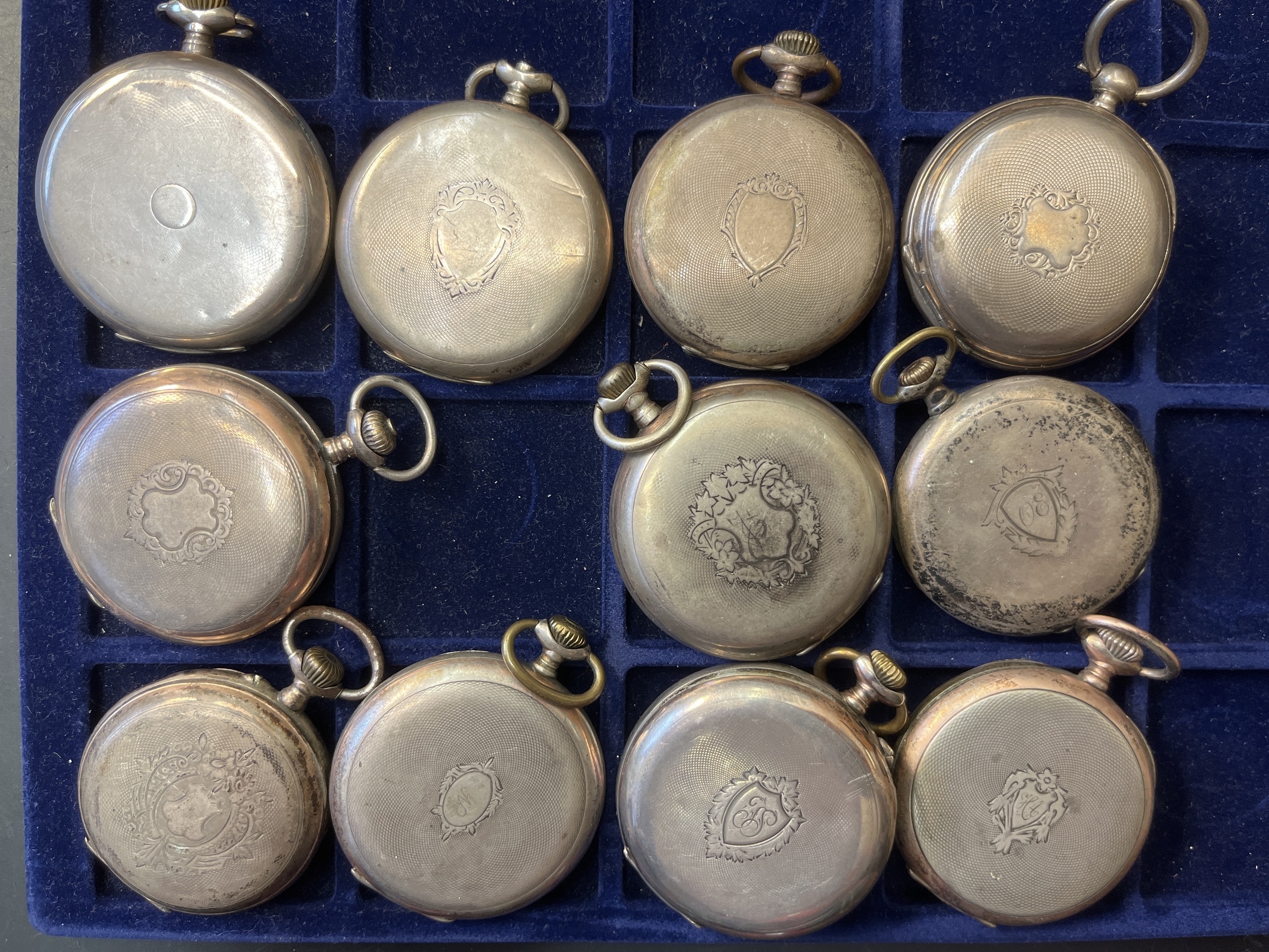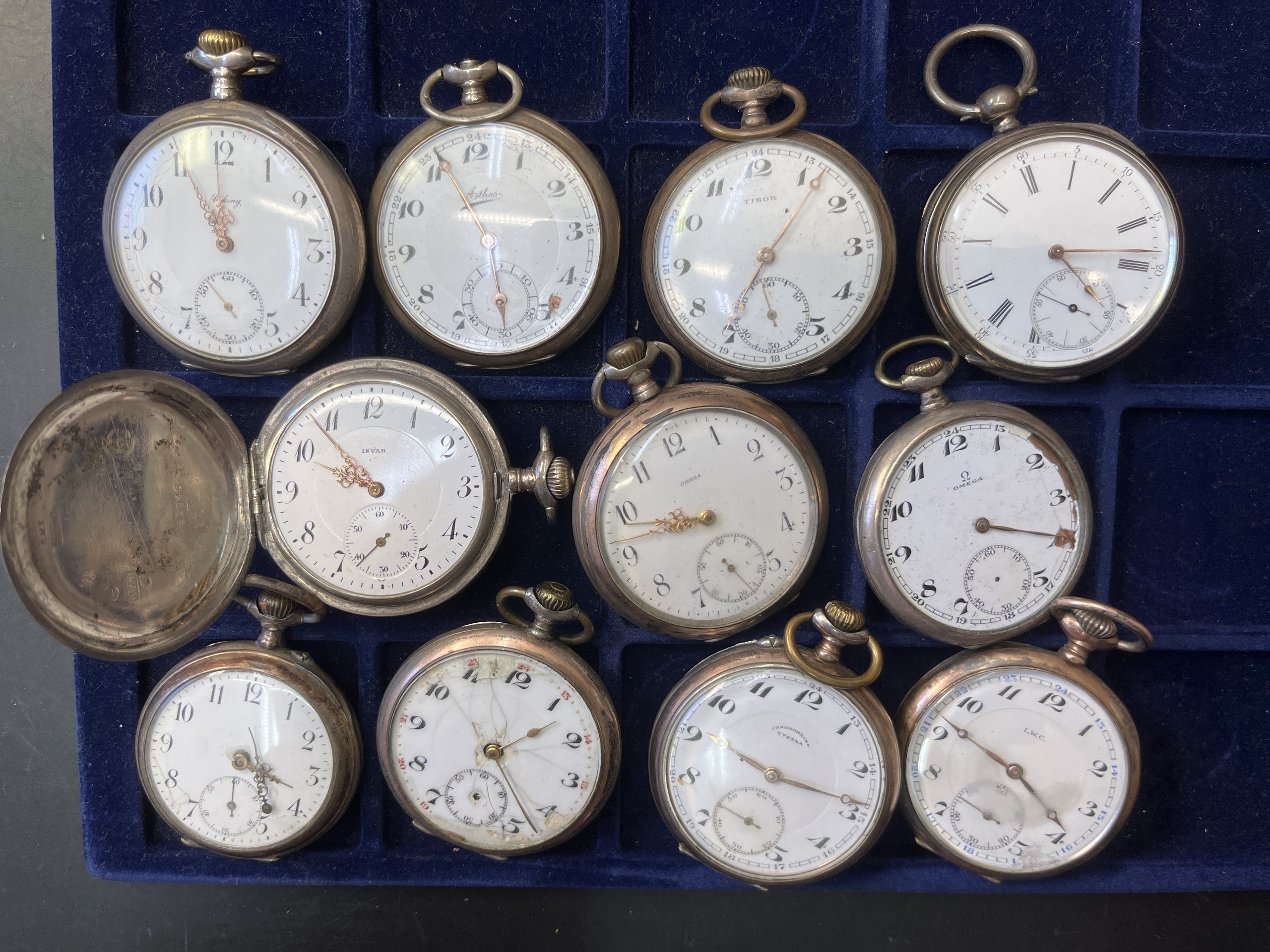 Antiques - Clocks, Sweden. Eleven pocket watches in very mixed quality e.g. Omega, Viking, L.W.C., Chronometre and Invar. Most in silver.
