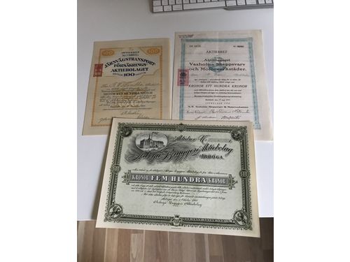 Stock certificates, Sweden. 78 stock certificates from Sweden, around 1900–1930s in good quality. Also about ten stock c..